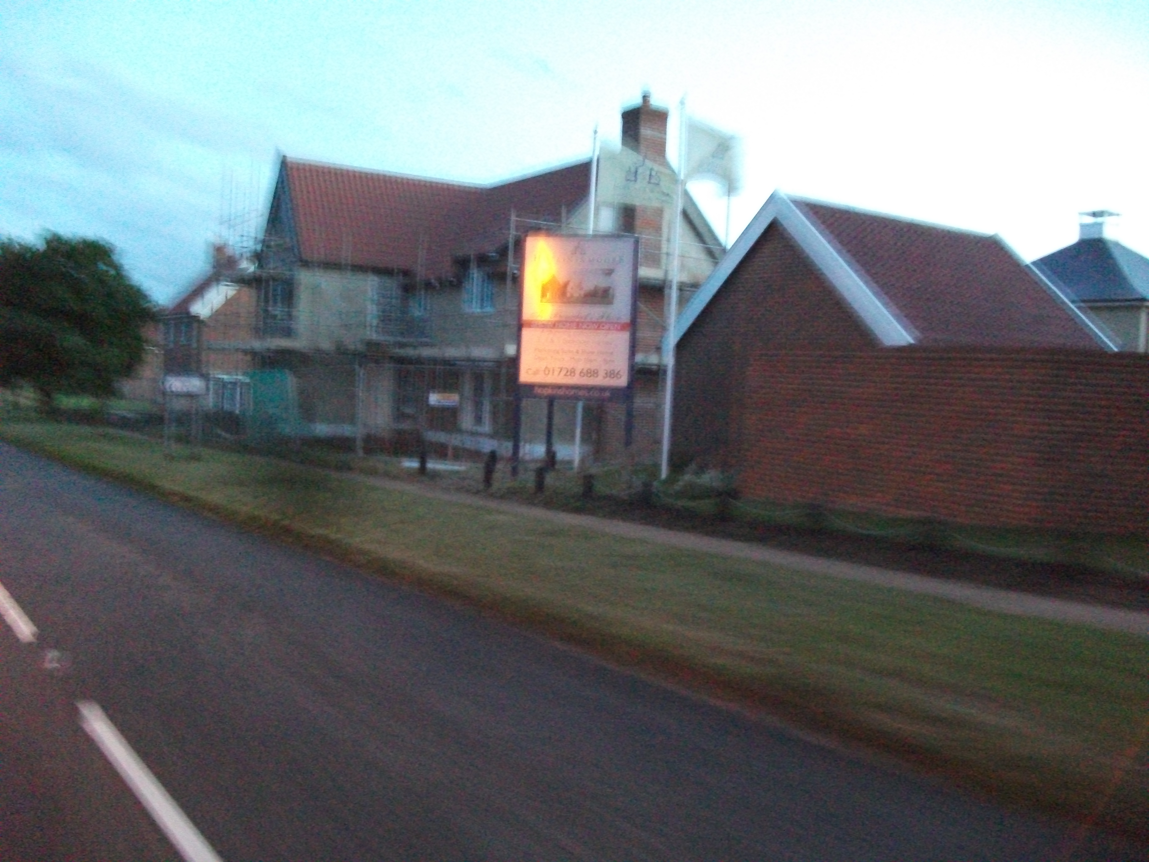 From Holbrook I pass the pretty Orwell river to my right, and circle in to Ipswich, an incongruous and unlovely place. As I circle into the town, I pass dilapidated schools and community centres next to half-built high-rises, corporate blocks clad in playskool colours. Disused churches jut against a repetition of premier express offies and threads of small suburban houses. Bungalowland. I want to stay and get down to the mystery of places like Ipswich, like Basildon, places that indicate a common pattern of English life today, but I have little time, and follow the roads out eastwards.
