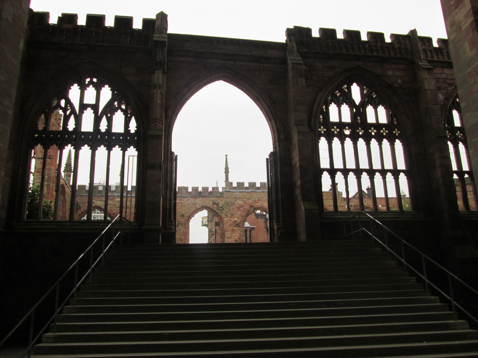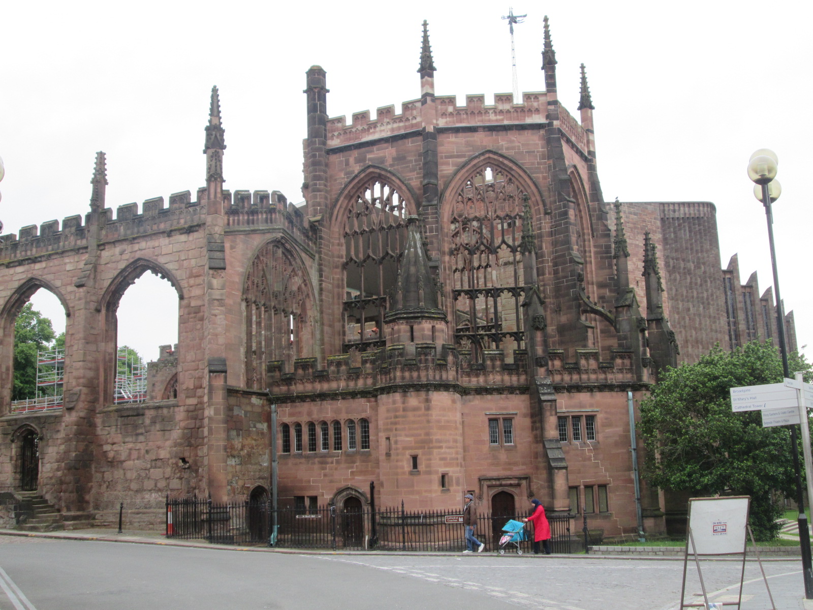 The university has carried out a silent coup in the city. Most of the major buildings near the cathedral are now stickered up with their signs. Local pubs sell food and beer for staggeringly cheap prices. I get to the cathedral, where Coventry again asserts its tough and fascinating identity in spite of itself. The city was largely erased by Luftwaffe bombing during the second world war, and its famous cathedral was largely razed to the ground. Some of its walls remain and have been restored, and one can wander round the ruins of the cathedral where, at its altar, sits a wooden cross that famously fell intact from the fire. It’s very unlikely, but it’s another local myth I like very much. The new cathedral is also remarkable and full of strange artworks, from images of unearthly angels and devils to a remarkable tapestry and stained glass inside.