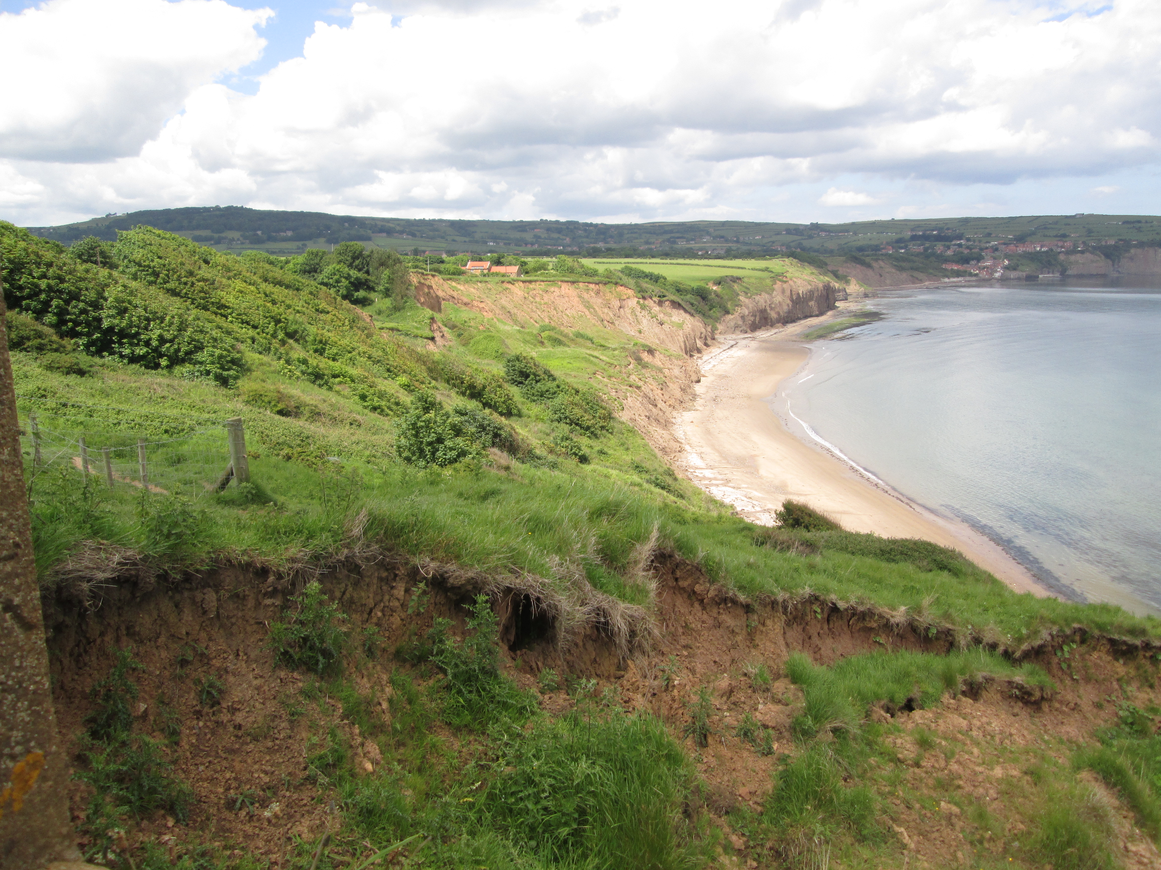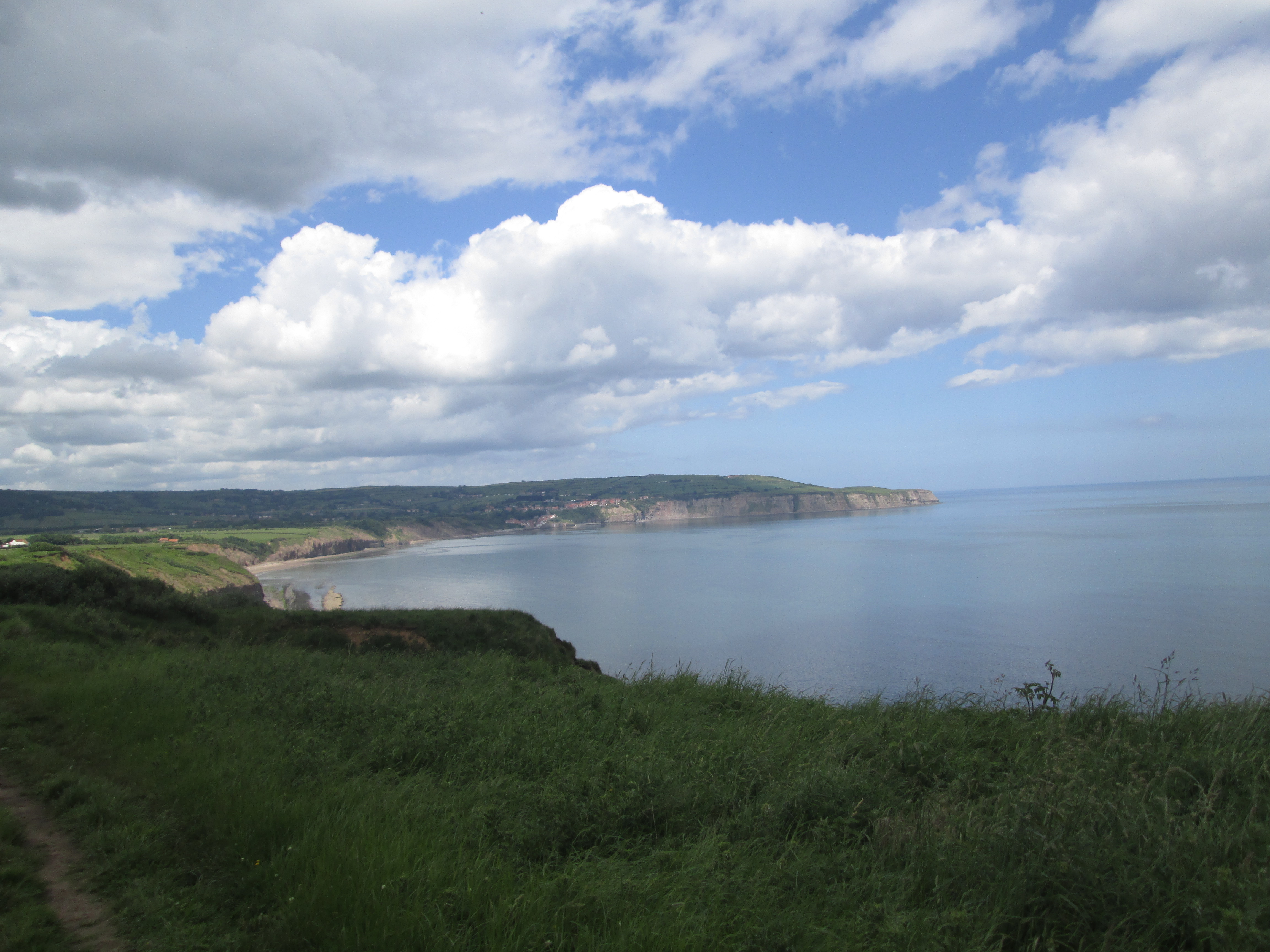I take a very bumpy cobbled path down a very steep hill, and the path begins to become much more rocky and bump. Alas, I have taken what will become a very bad wrong turn. I find myself on a footpath, Cleveland Way. At first I mark to myself that this might be OK. I carry on, but the route becomes very steep and muddy and full of steep steps up and down. I ask a couple of passing hikers how far the next road is. ‘Some miles!’ They look at my bike and laugh. ‘You’ll find it very difficult with that!’ The path is very narrow and borders at times on the very edge of the cliffs. It is a little terrifying in certain moments. One misjudgement and myself and my vehicle could trip down into the waters below.
