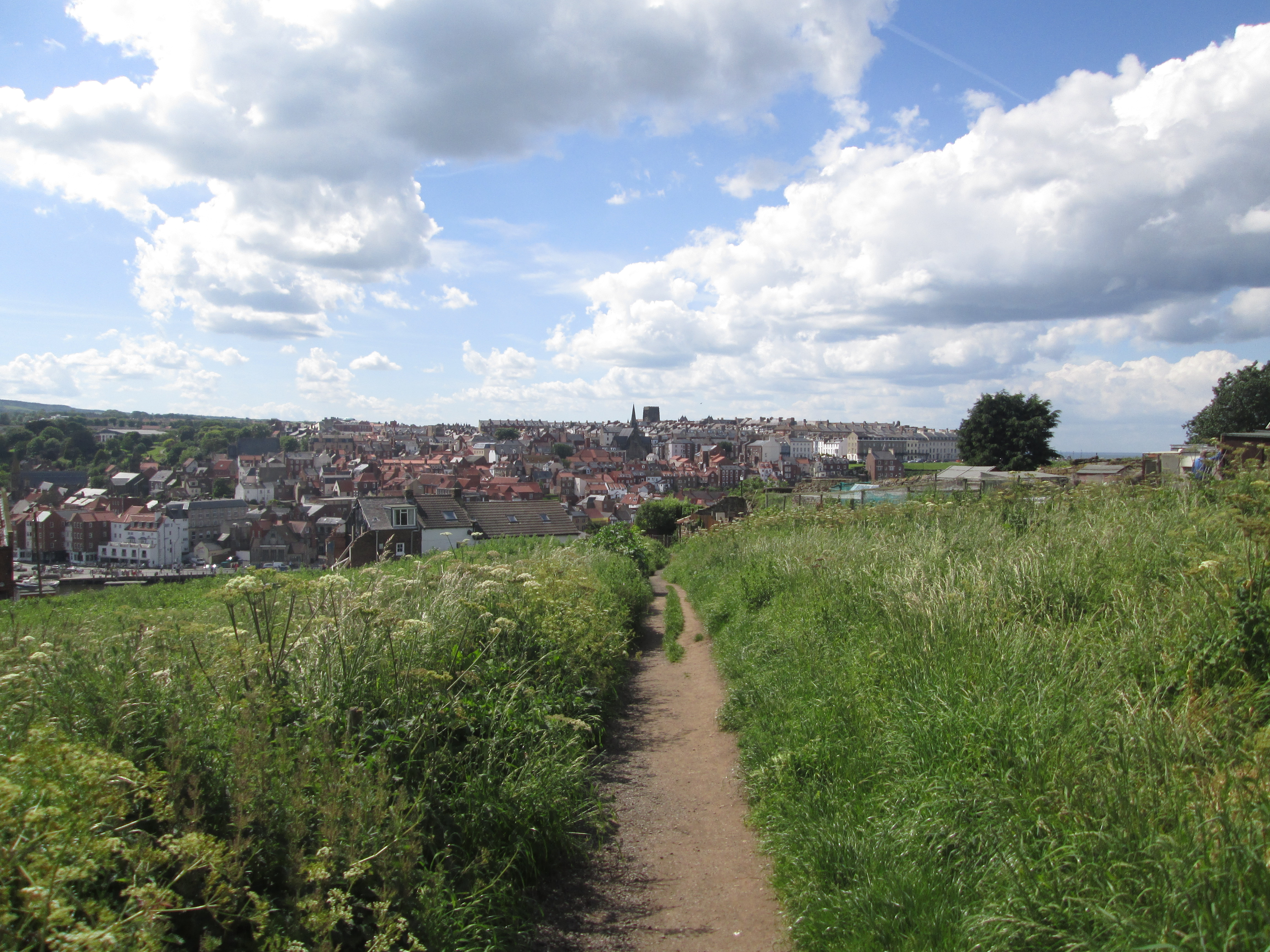 I finally reach Boggle Hole and realise what’s happened. The place is named after a local hobgoblin that once lurked in this unusual dip in the cliff. I’ve been tricked by this nefarious being into coming his way, endangering life and limb in the service of a cruel practical joke. Thankfully there’s a road here that leads back to the main road, and I dust myself off and eventually get back on track. The path takes me by Robin Hood’s Bay, a pretty little seaside village full of poky inns and streets where the locals once made a mint from smuggling, as common a form of income as fishing until recent centuries. I pass along and, eventually, make it to Whitby, several hours later than planned.