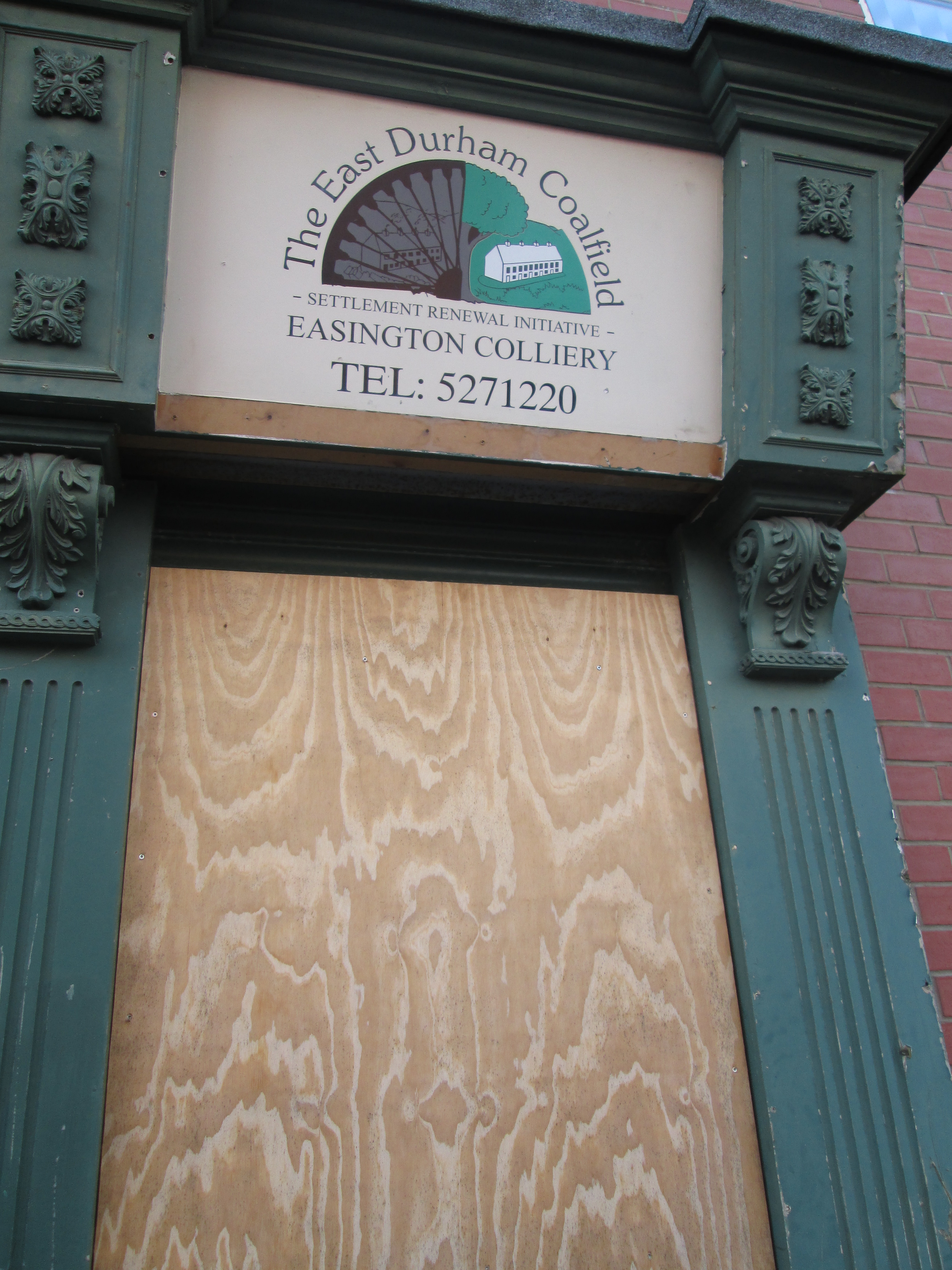 There are few people around, and those that are do not want to talk (to me?) about the collieries. Again in Horden there are a couple of takeaways and shut down pubs but not a lot. At Easington the effect is most devastating. Here everything is closed: schools are boarded up and full of broken windows. A former council office is barricaded. Every pub seems to be closed, though I’m told by one local that when Thatcher died people came from far and wide to celebrate here. Today it’s a ghost town. Even the neat red-brick terraces built for miners are, in places, boarded up.