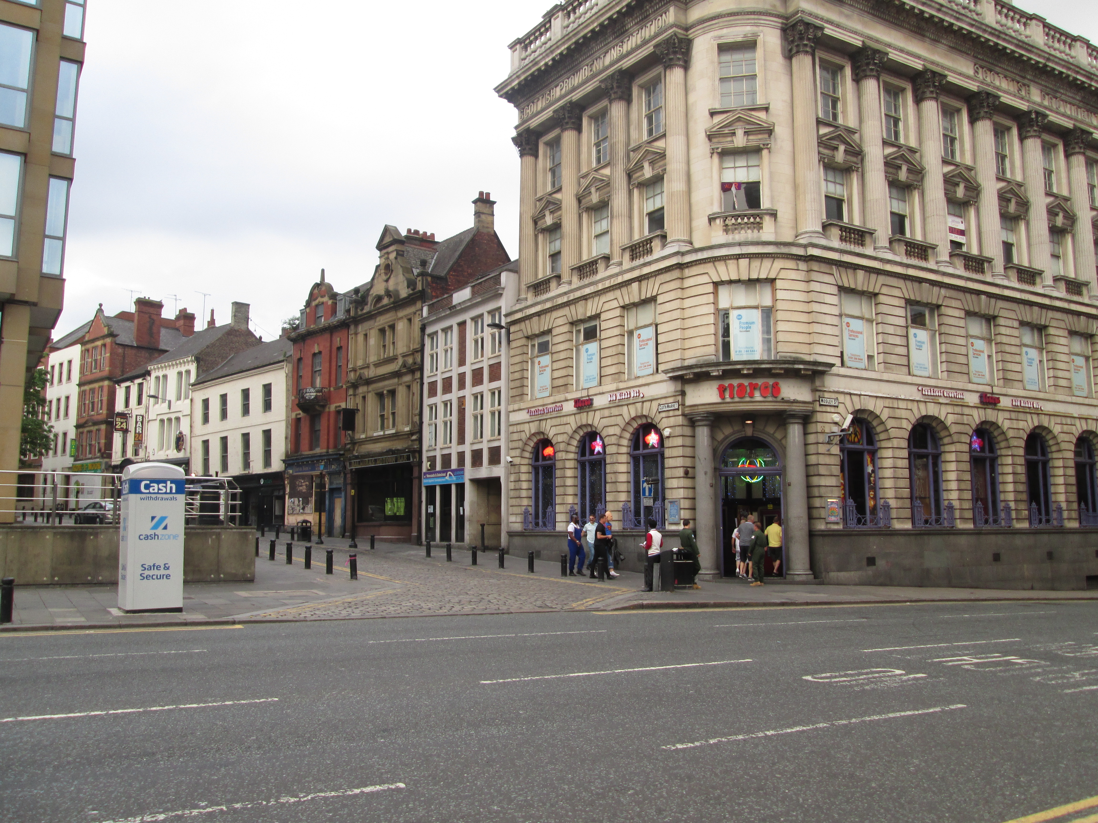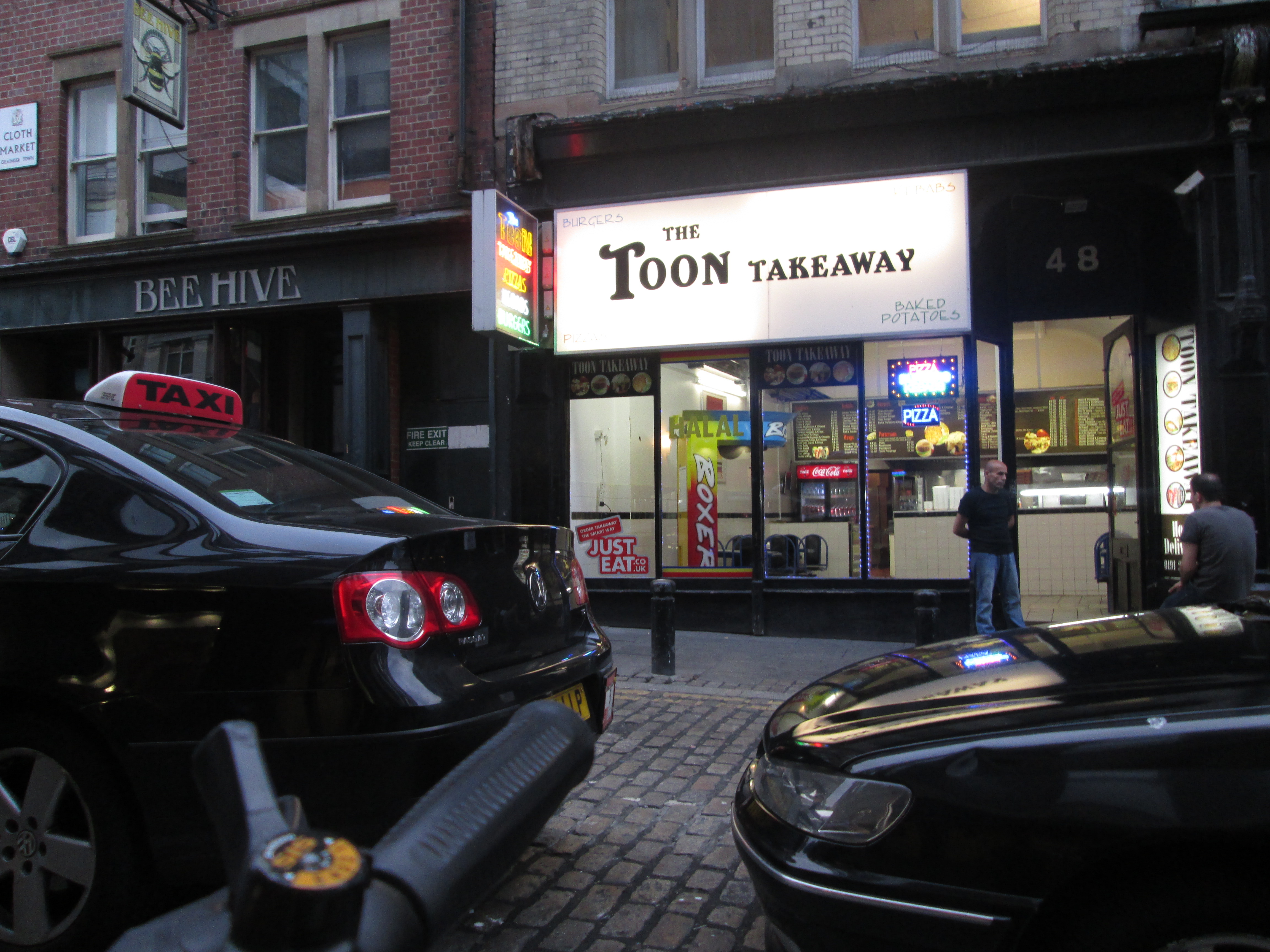 My reveries are interrupted by the tooting of buses and cars. Newcastle, it turns out, can boast having the most aggressive and rude drivers of any town I’ve passed so far, including London – quite the achievement. I head over the bridge and find myself quickly in the heart of town on a Friday night. It’s still relatively early, around 8pm, but the streets are full of lads in same-coloured shirts and overweight lasses in small, brightly-coloured dresses. Every cliché is trilling out with the cheery alarum of a pinball game. There’s much more to write on this in the next post, when I do experience a Toon night out.