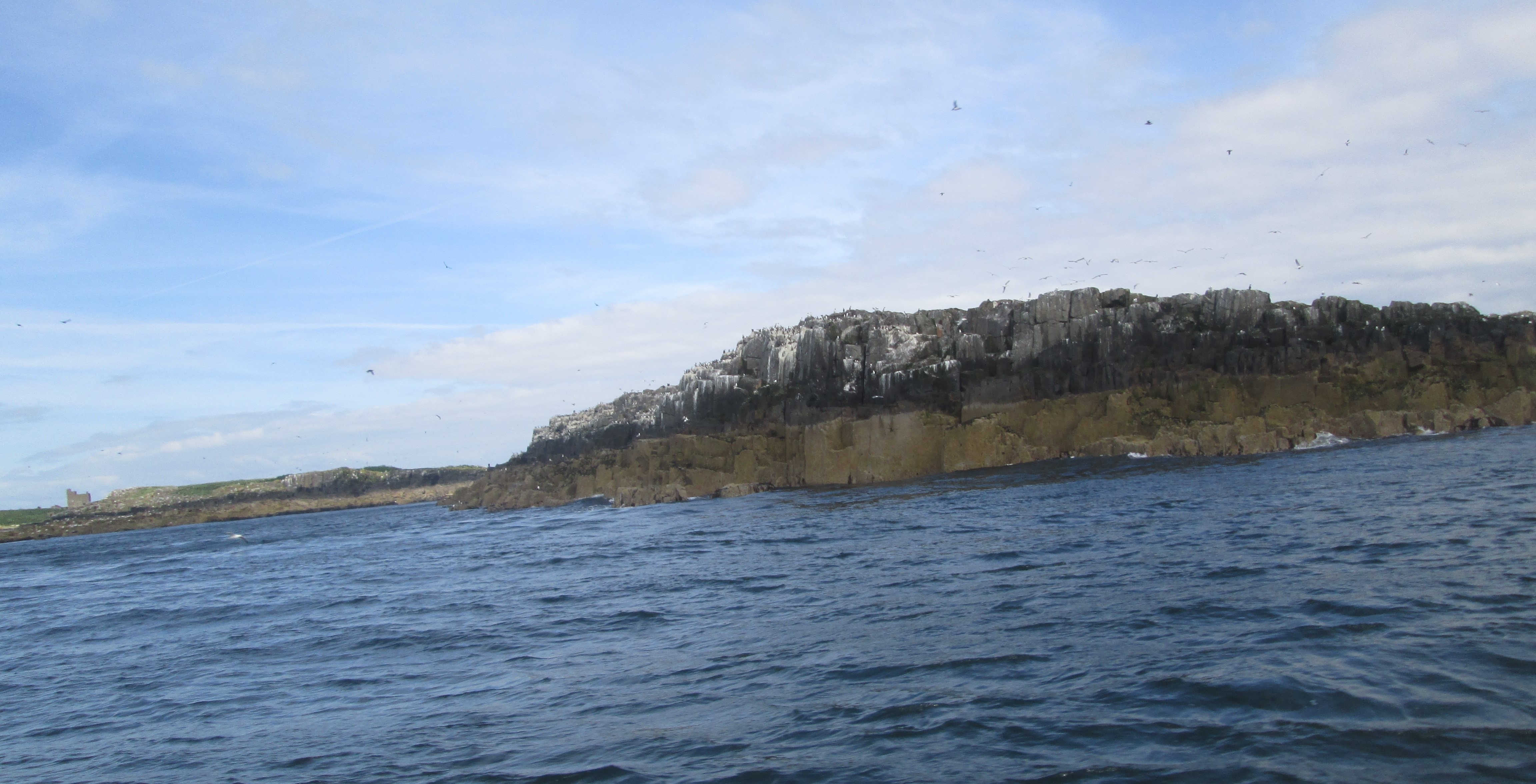 To our right on a distant rocky islet are large and sleek black birds, shags, stretching out their wings in the sun. They have no oil in their feathers and so have to dry out before re-entering the water, only half-adapted to their new environs. I look up and am astounded by the intelligence of the seagulls, capable of navigating wind channels with the bare minimum of wing movements. They oscillate up and down, pulled up by one wind and tugged down by another. Gannets, the largest of seabirds, have been seen near here, as have minke whales and bottle-nose dolphins. Nearby, razorbills and terne roam about in great swathes, their forms casting shadows across the morning sun.