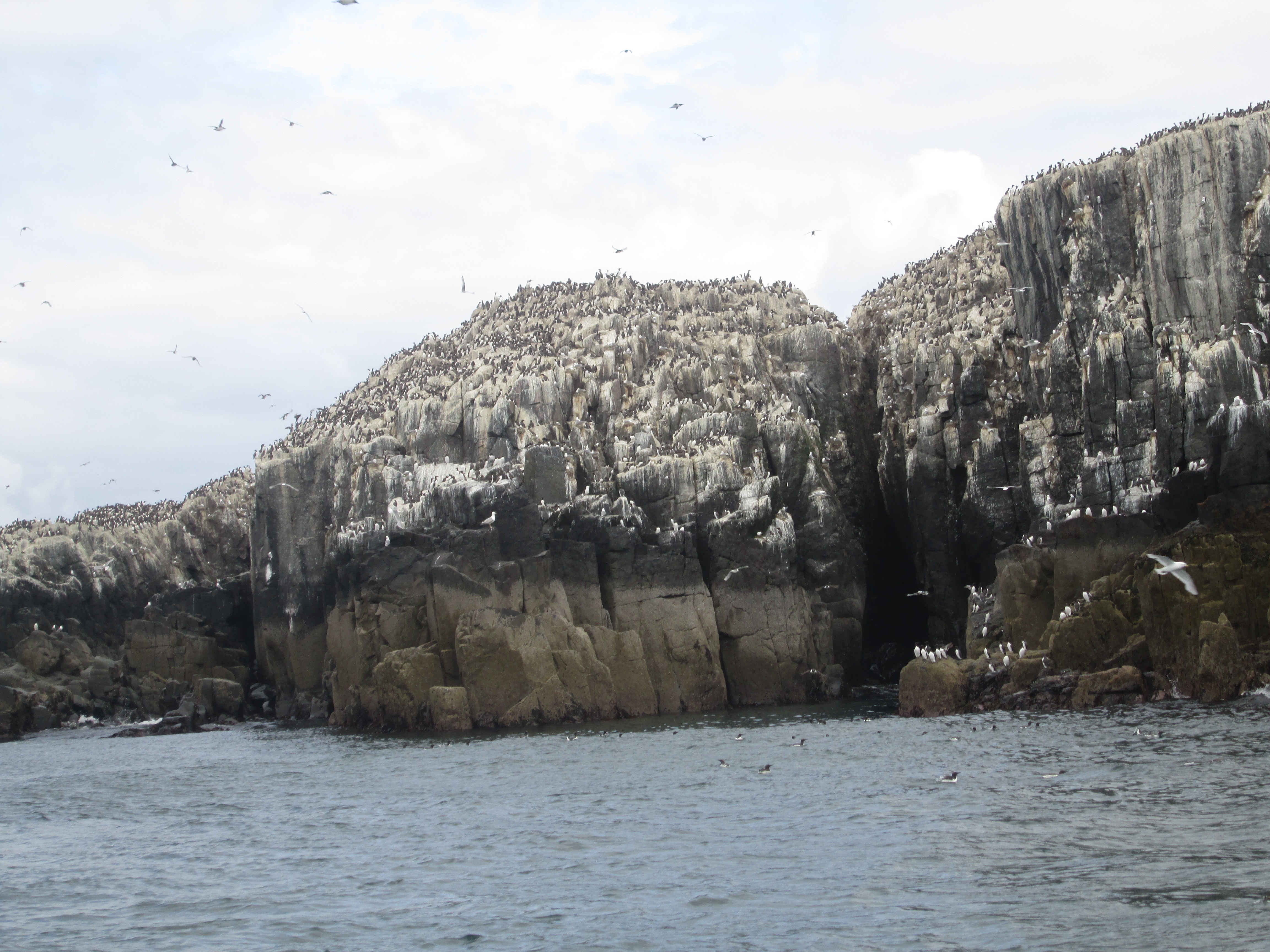 Next, a series of stacks of rock where a great city of guillemots are clustered together. They are a little smaller than seagulls, and have a black head with a white body. The tang of their shit on the rocks reeks, and has turned the tops of the dark rocks into a deceptively chalky hue. They squawk to each other in an immense hubbub, and live in the same kind of proximity as Londoners on underground trains. They too have an unusual approach to child-rearing: when the young are ready to leave the nest, one parent will encourage it down towards the water, whilst the other parent will boot it off the rock. Kittiwakes hang out in similarly dense clusters too, wailing out with their distinctive cry. I realise I’ve seen them countless times before but never been able to distinguish them, as they look like half-sized seagulls.