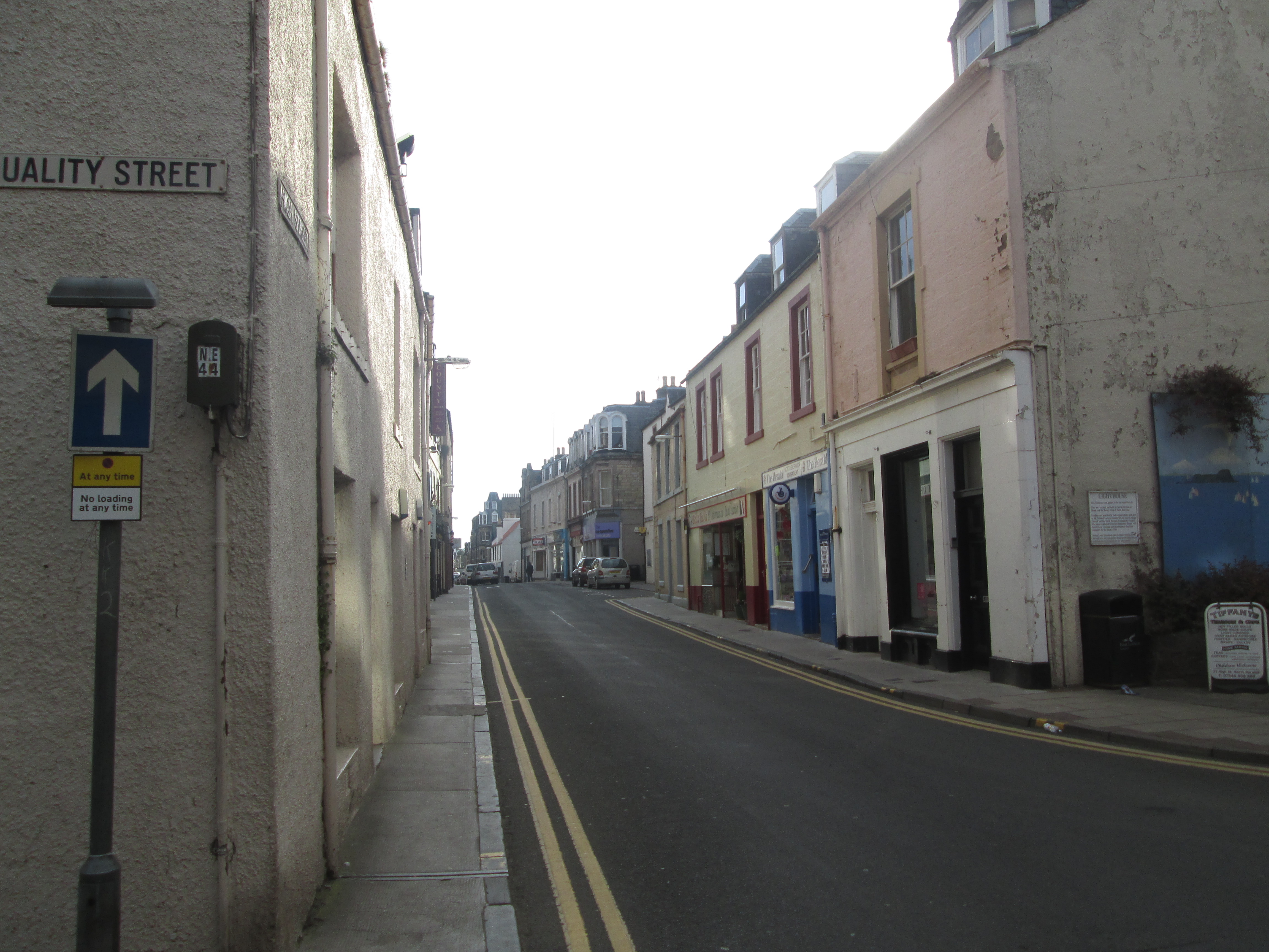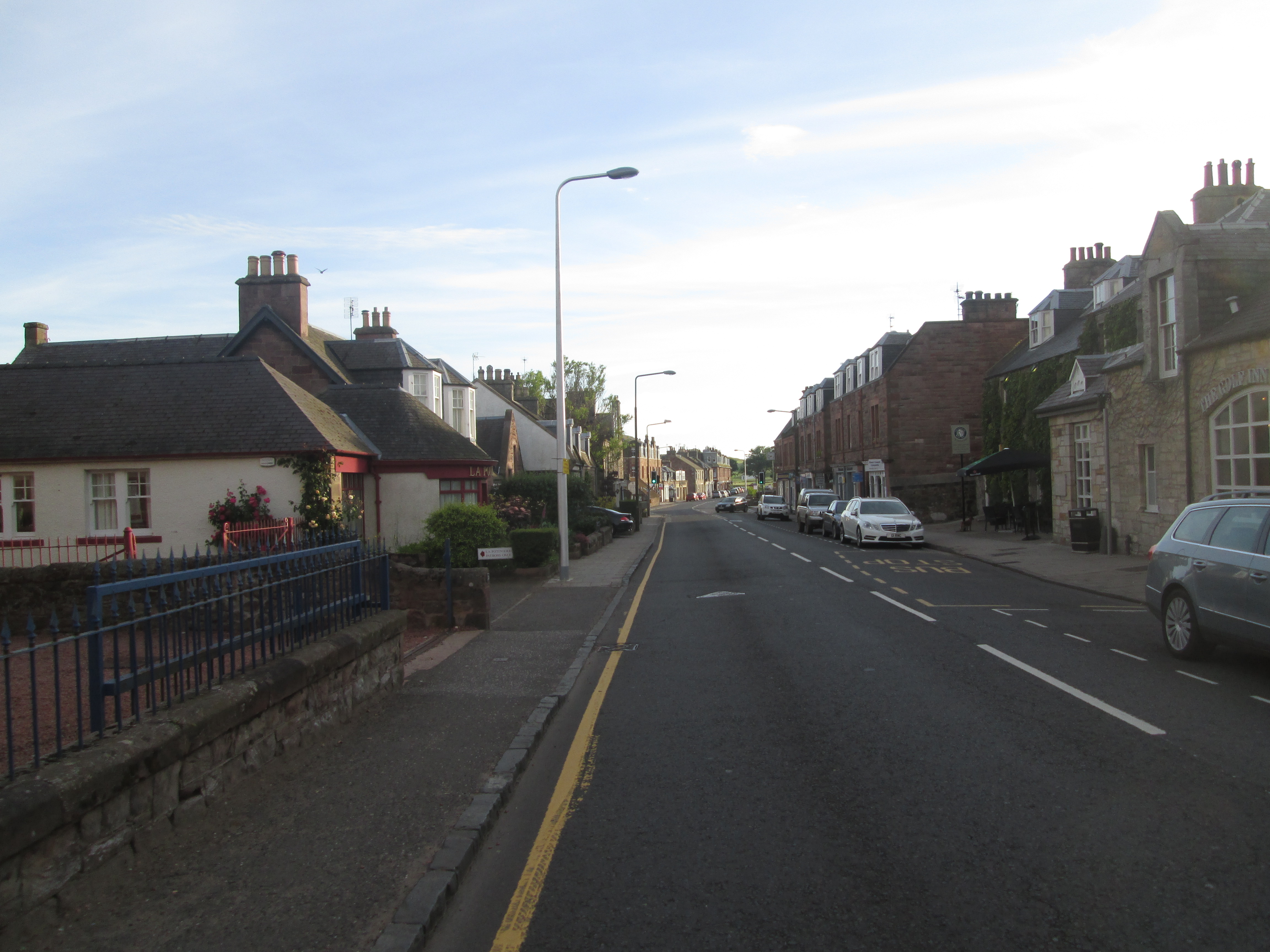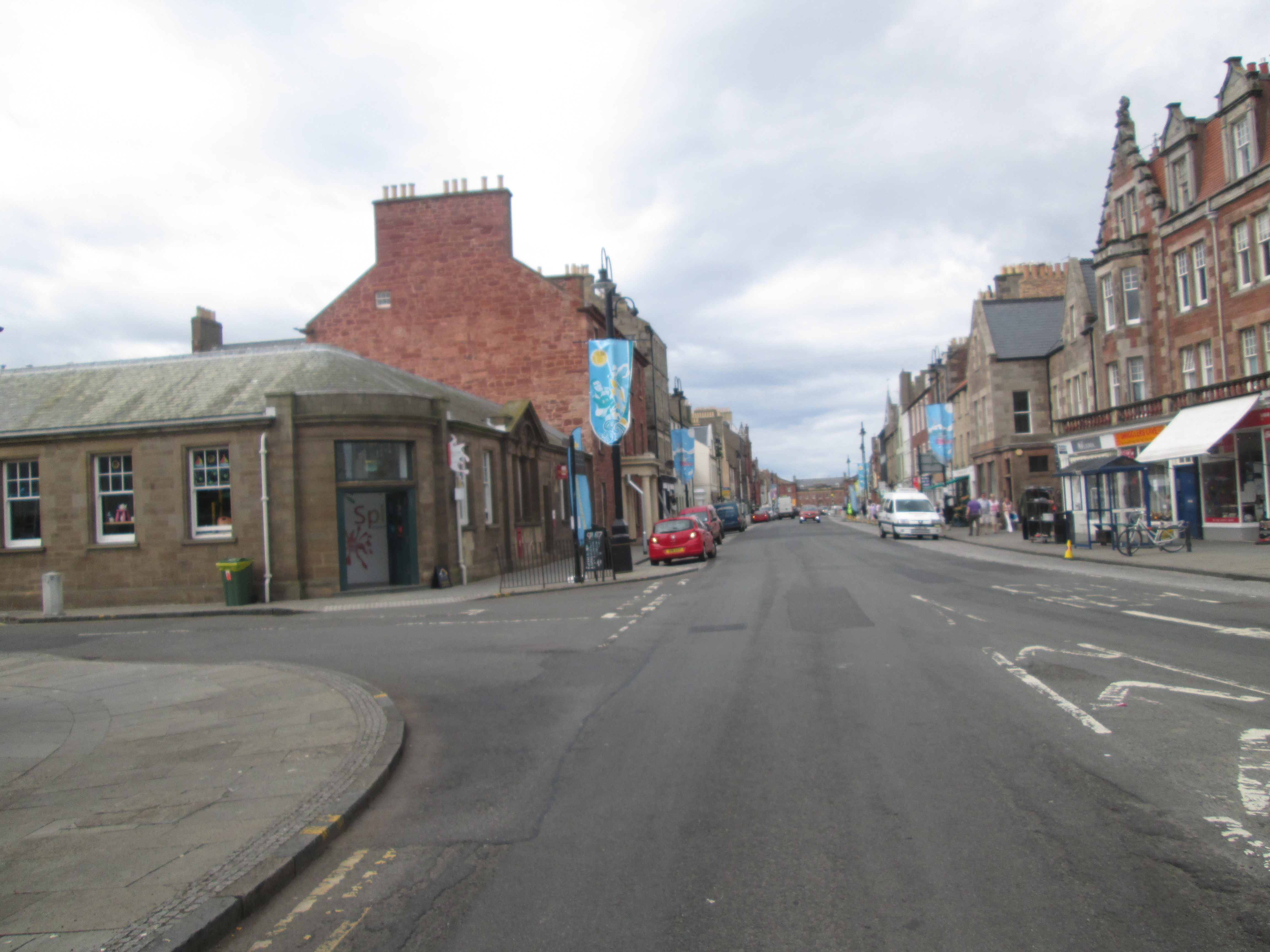 I head up through Berwick town and listen to a man blowing heartily on the bagpipes. The milling crowds take great pleasure from this and shower his cap in small change. I spy an Edinburgh wool shop and more of the same large grey bricks and thickly-framed buildings that remind me of Aberdeen, and will recur I expect across Scotland.