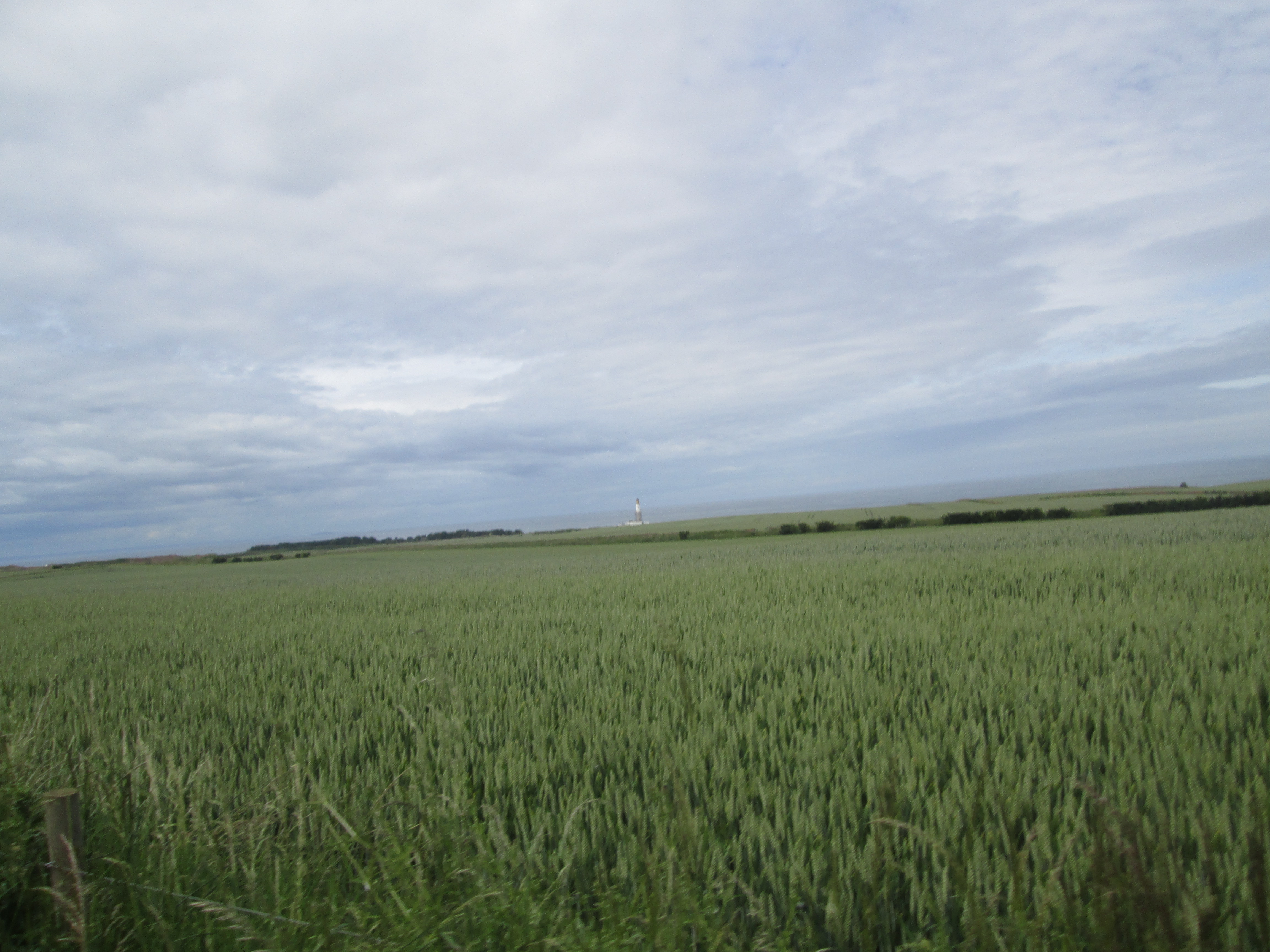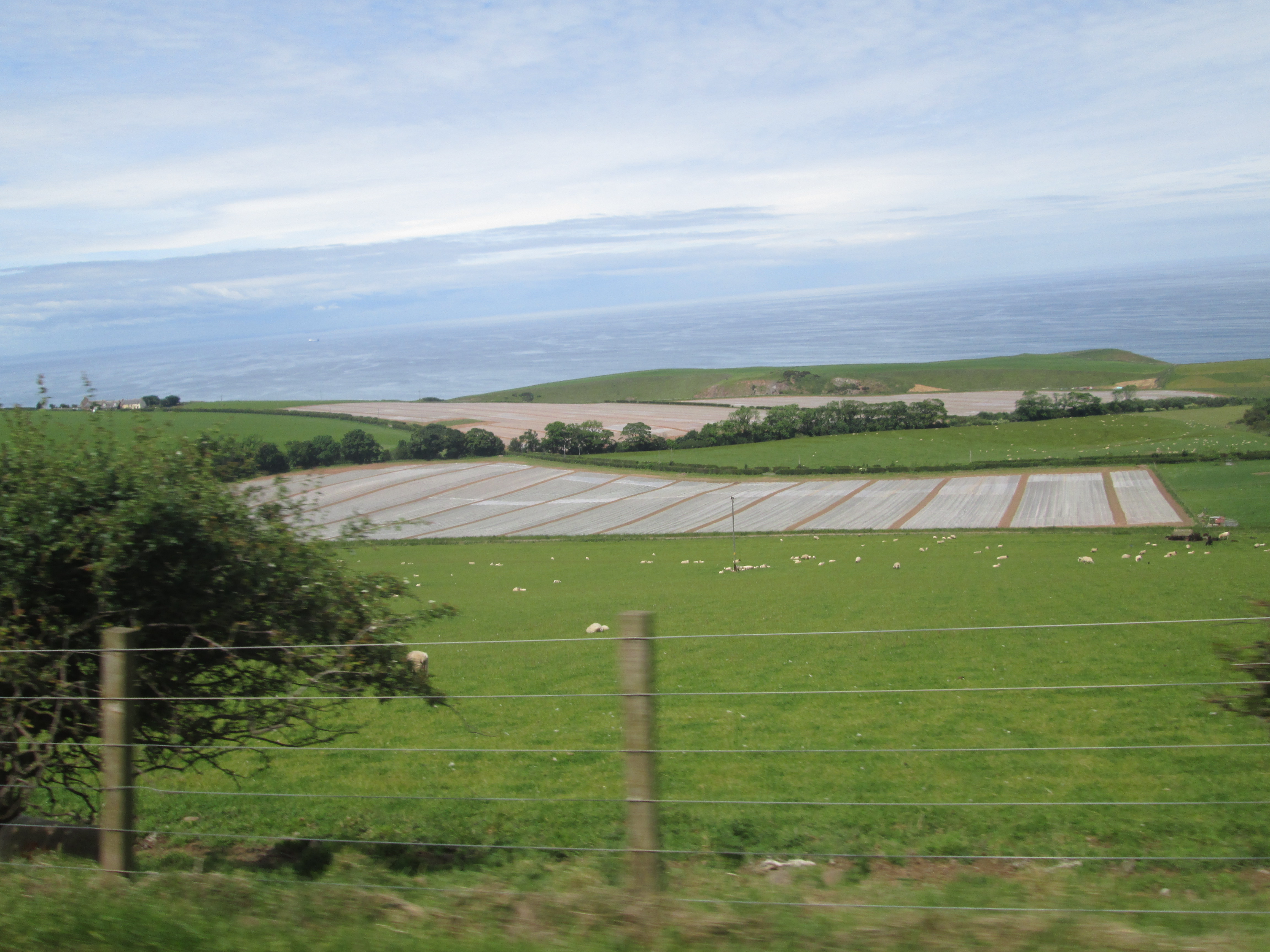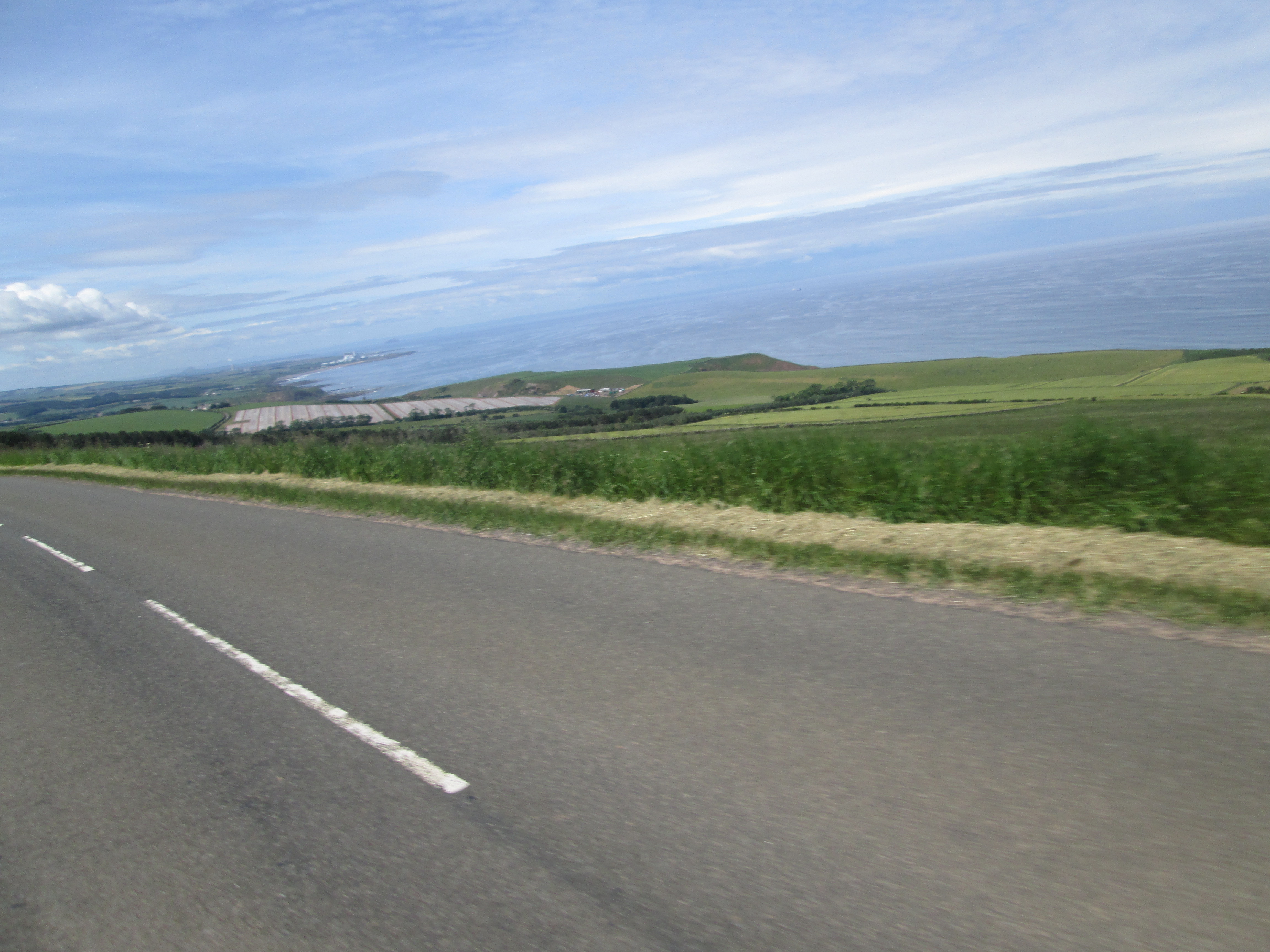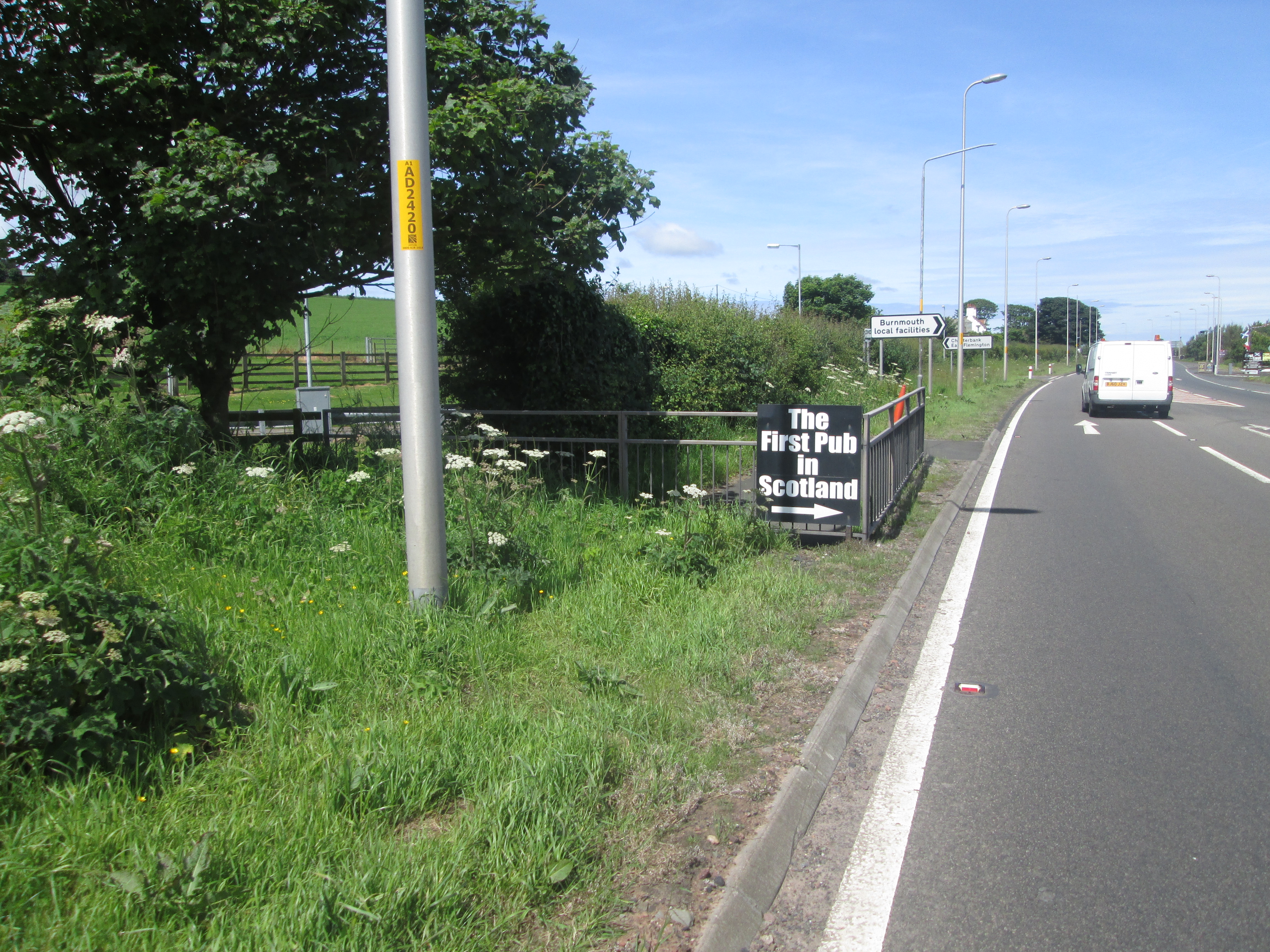 A mile north of Berwick up the A1 and I reach the border. On each side pubs advertise being the last English or Scottish pub – Carling or Tetley, Belhaven or Tennents, such choices. Freight trucks are clustered in one lay-by by a hot food kiosk selling Irn Bru and black pudding. So close! A great sign in gaelic, surrounded by three flags, greets me with Failte gu Alba. As I pass over an invisible map-maker’s line, I shout out to no-one: Scotland, here I am!