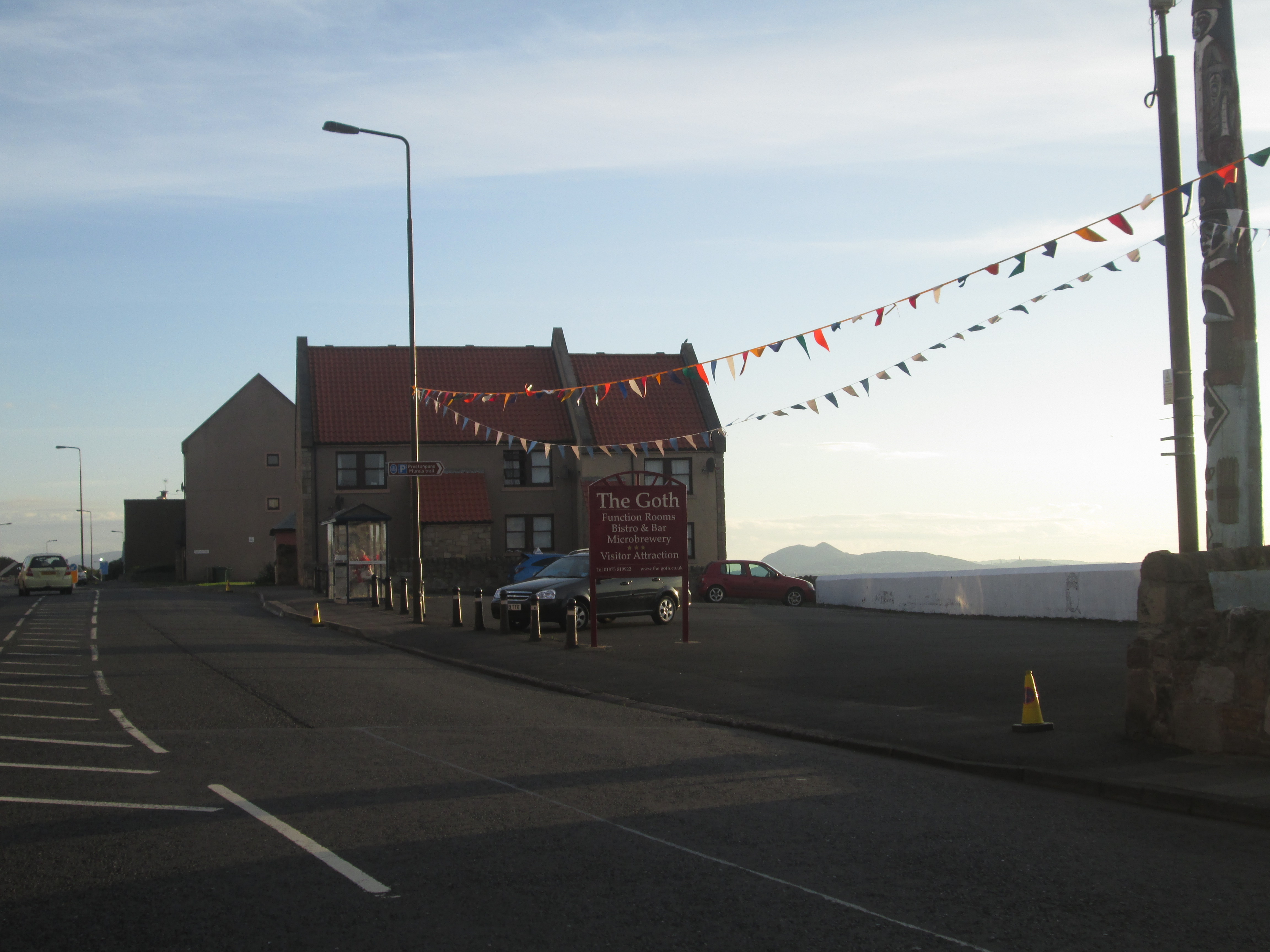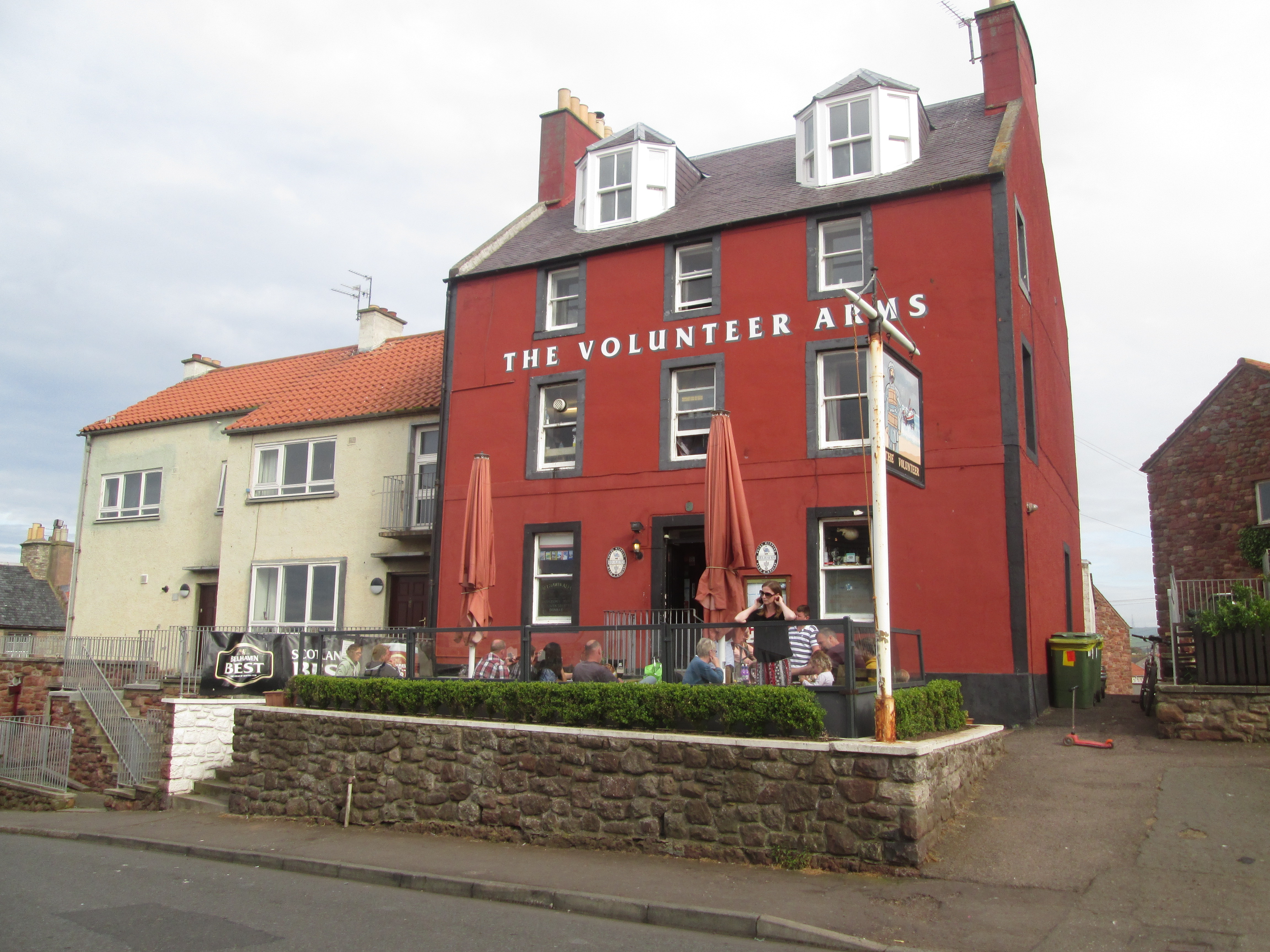 Sometimes it takes an imaginative leap to establish a new footing of reason. I drift on, struggling back up the steep cliffs before taking an easy path towards Dunbar. I pass pockets of thistle jutting out among weeds, a great quarry hacking deep into the earth, and a mysterious power plant where greater Manchester’s recycling has ended up in unlikely circumstances. Dunbar itself unfolds a little after, and I reach a small market town defined by a wide high street flanked with an imposingly high but pretty terrace of shops and restaurants. The town is bustling in the early afternoon, and I peer about at the chip shops, tandooris and fancy craft shops, seeking out a good destination for a stop. I slip down a road towards the working harbour, sailing boats rocking together like the movements of the guillemots on the nearby Farnes, then turn around and find the Volunteers Arms pub, which promises to sell the locally-brewed Belhaven beer.