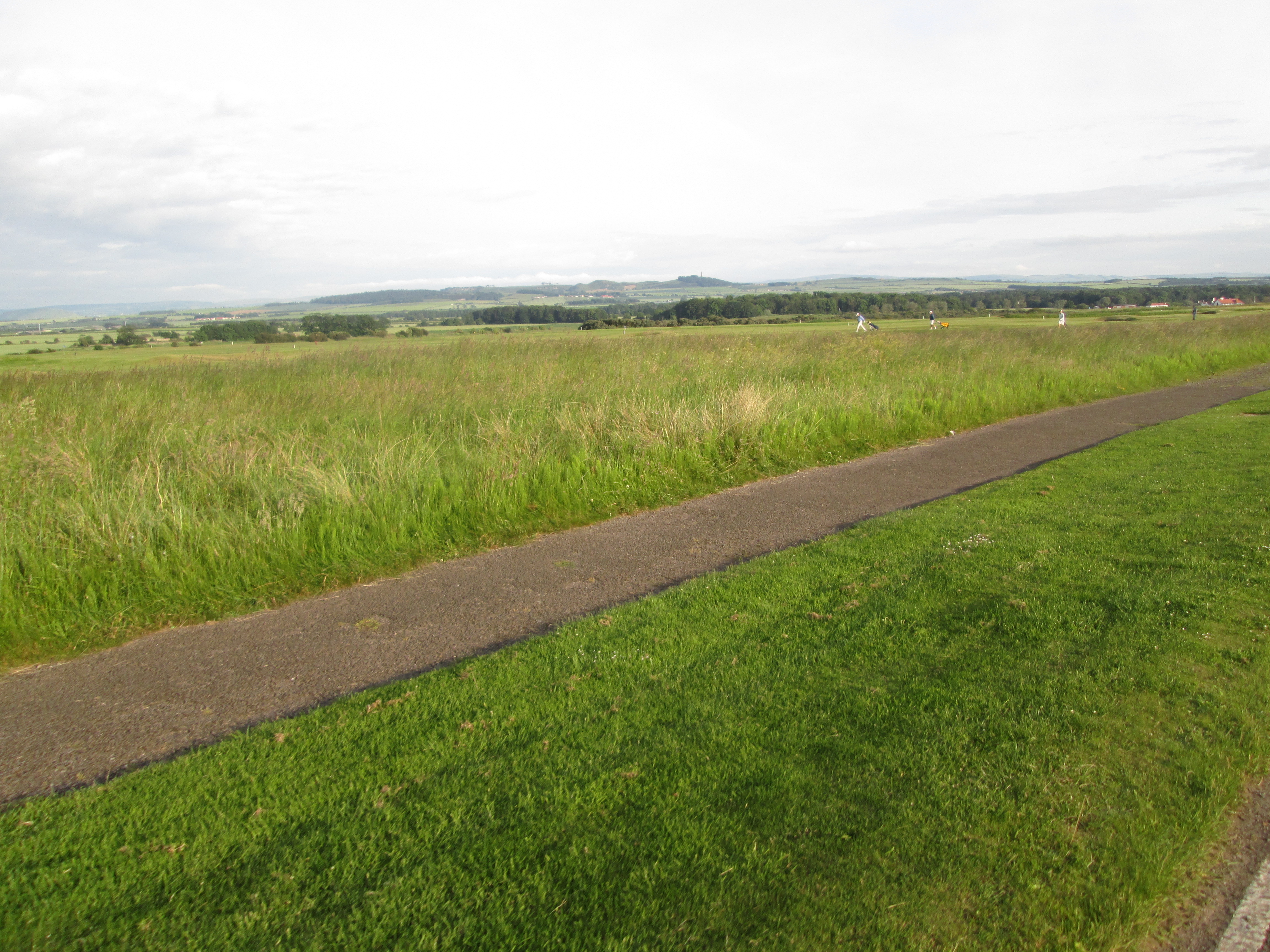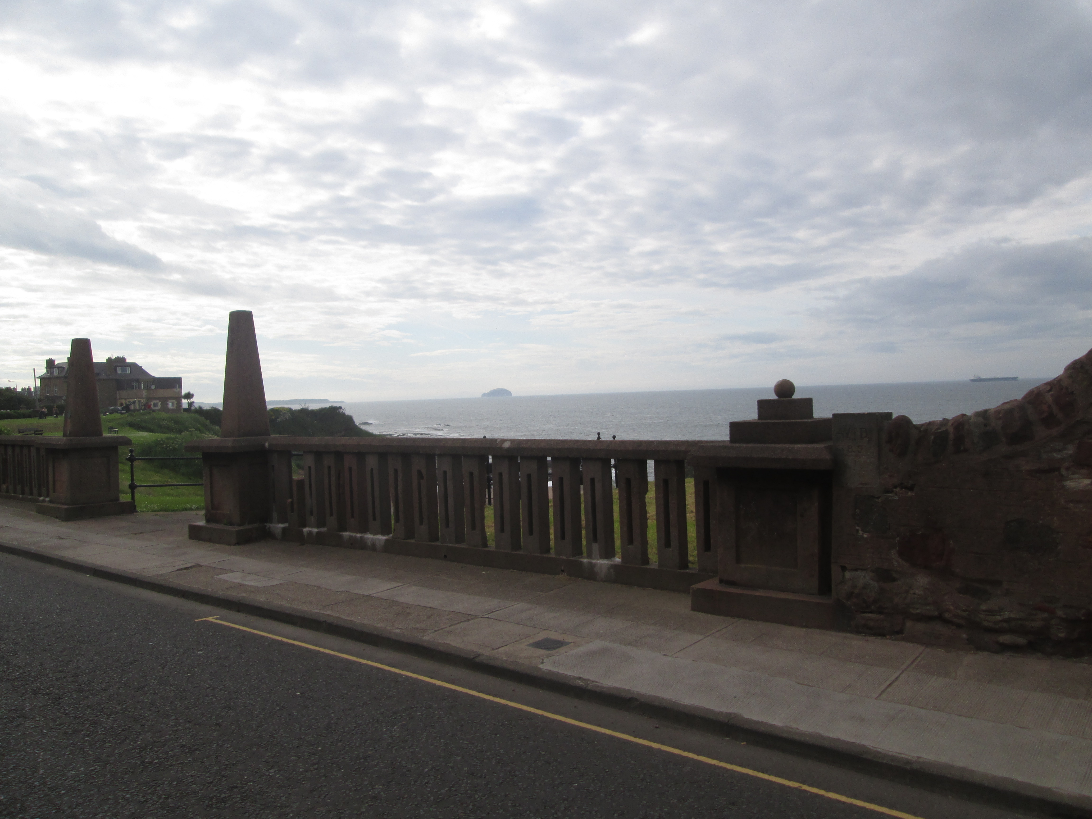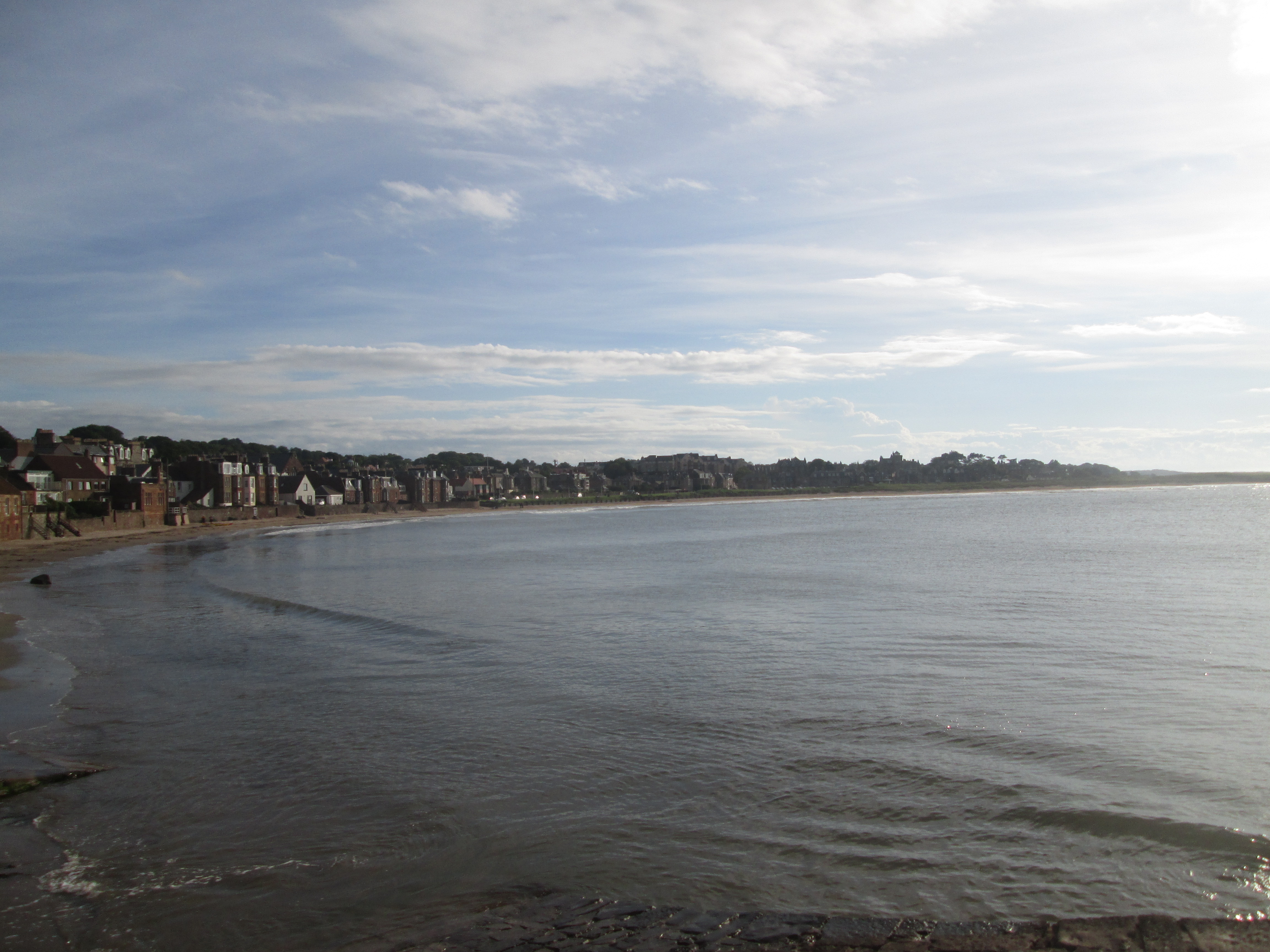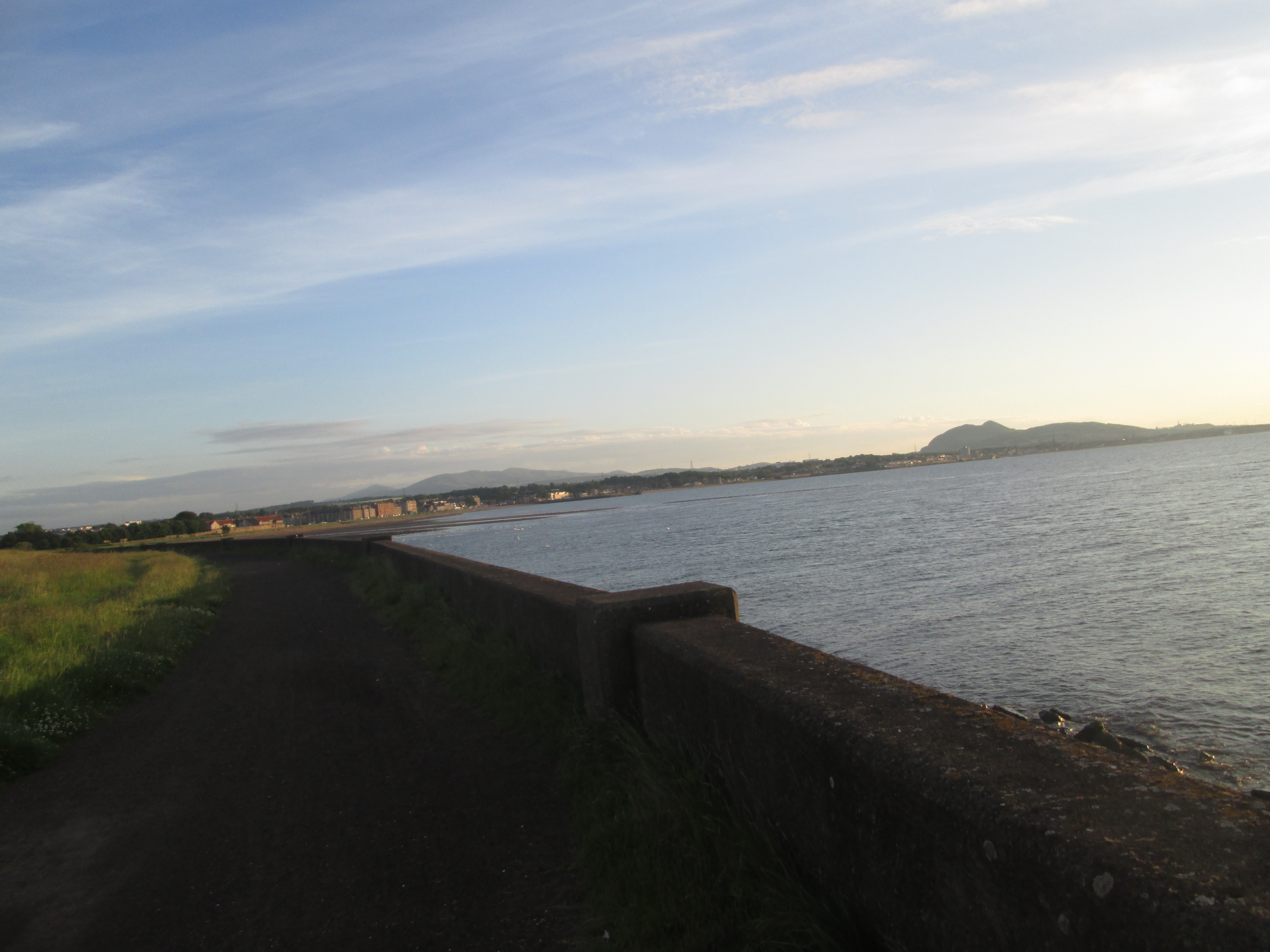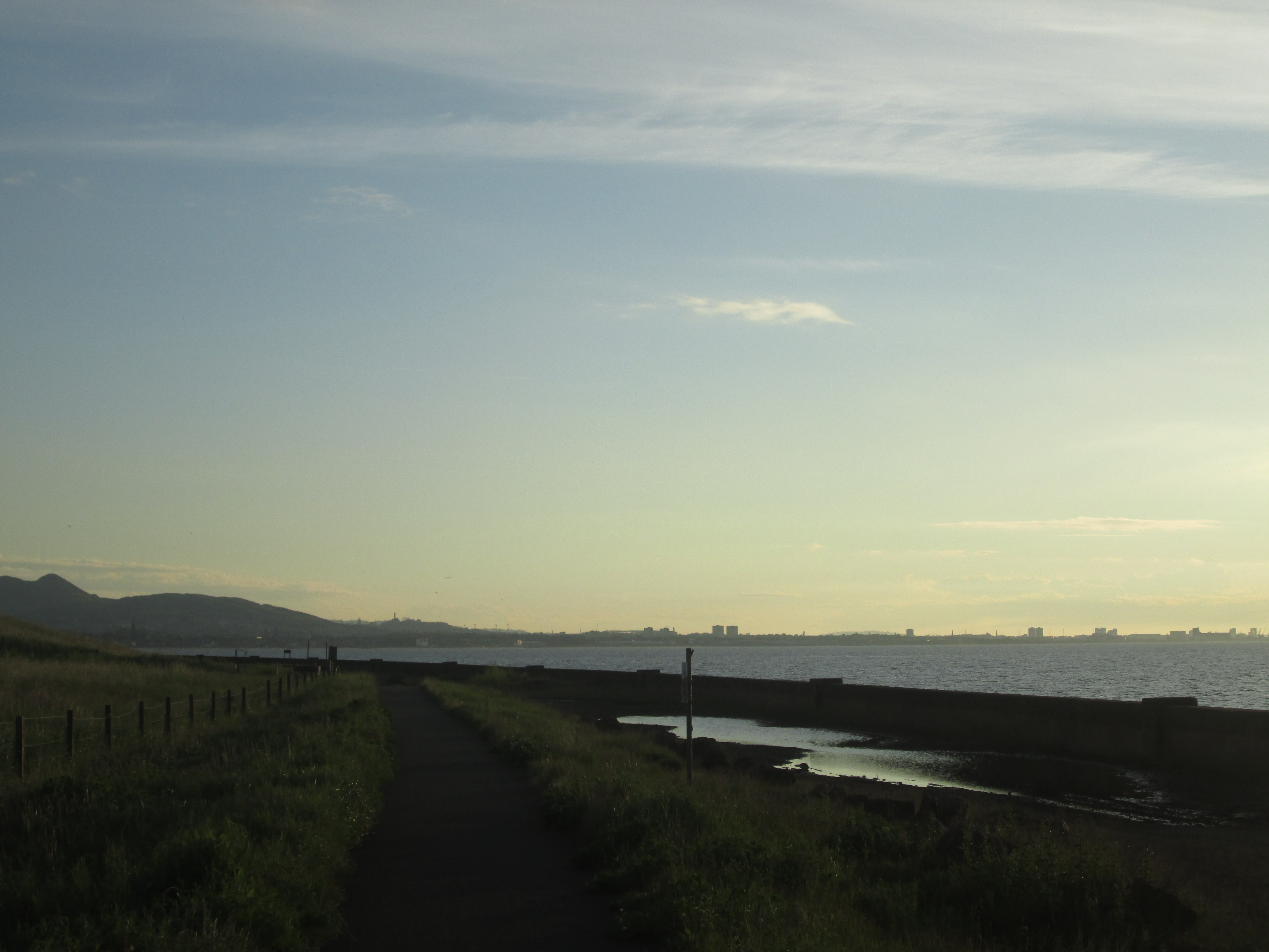 North Berwick is a very pretty small seaside town. There are a few ice cream shops and pubs, but the feel of the place is rest and refuge from the travails of town life. The harbour and beach are quite lovely, and I mill about a little while before heading north, passing through Gullane and a mysterious country estate, thick brick walls struggling to contain a forest of gnarled trees growing on the other side. The road takes me through Seton Sands, a coastline village with a caravan park and a few houses, where I catch sight of my first Edinburgh bus, all whites, maroons and reds. The reality of Scotland is coming into view. In the distance, I glimpse Carlton Hill and its ruined pillars, and realise that the Scots capital is closing in.