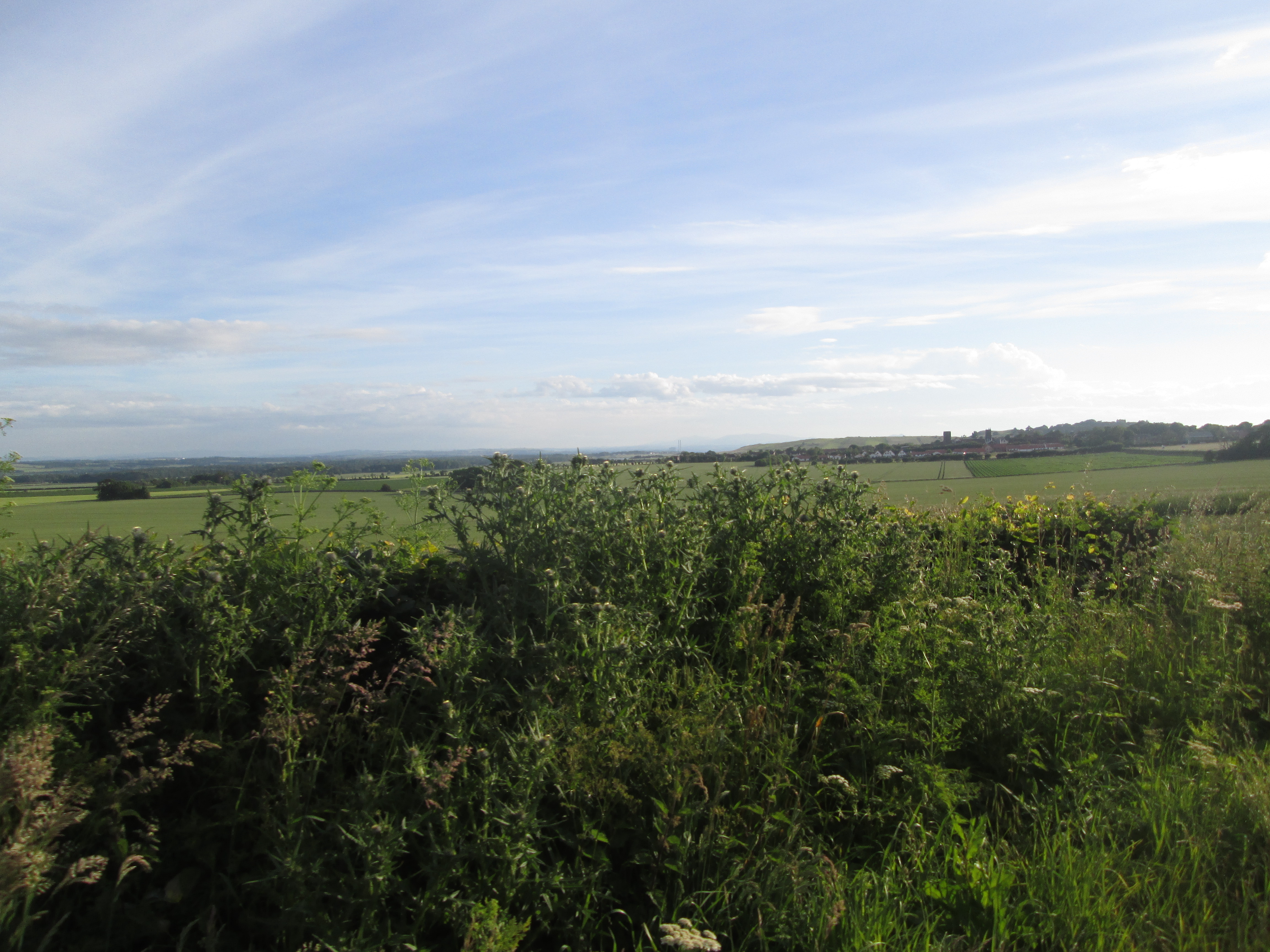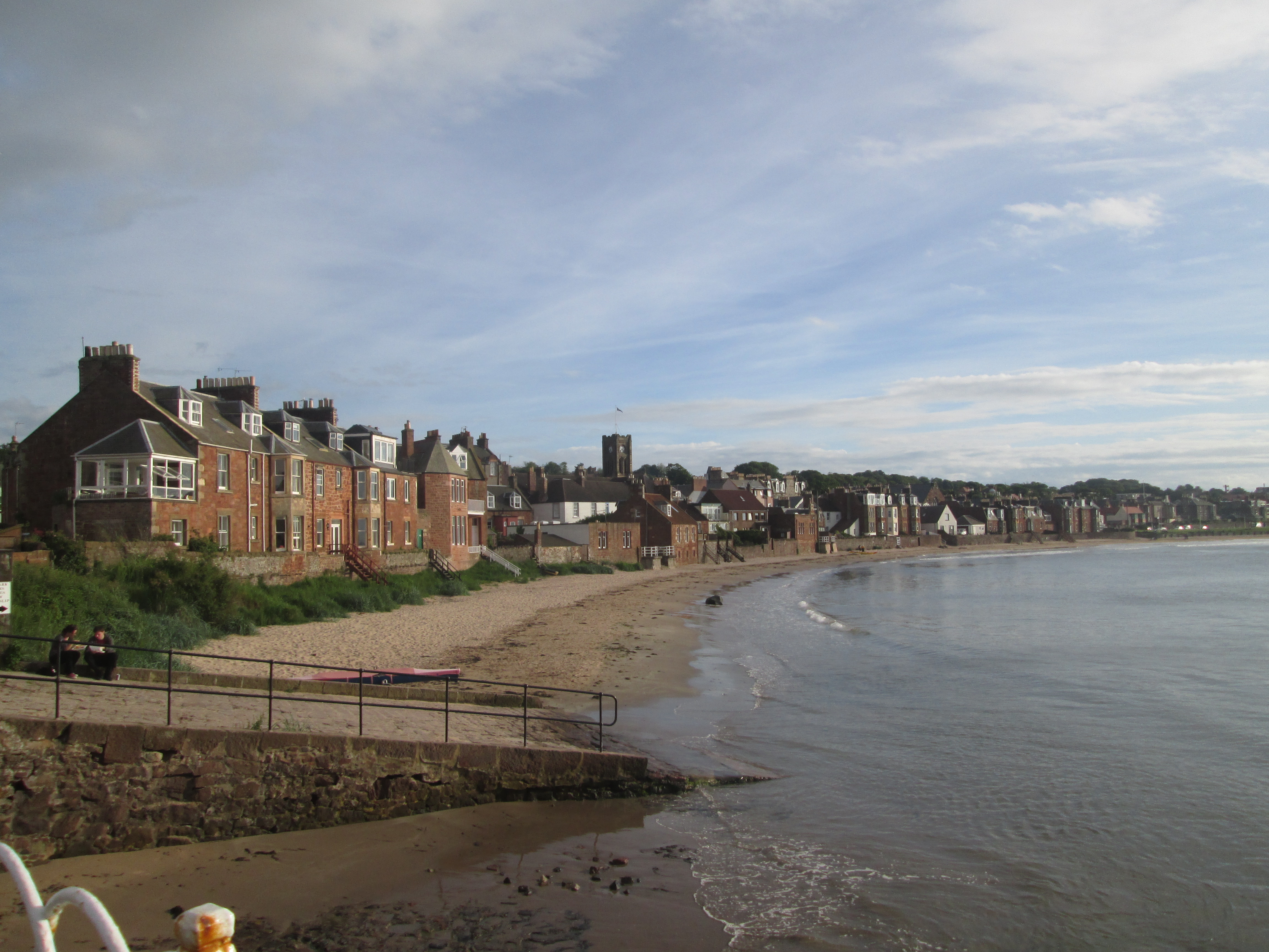 I follow the trail through the countryside of the Scottish borders and into East Lothian, heading broadly north and occasionally meeting the coast. I’m reunited with the sea at Pease Bay, where the red cliffs give way to a gentle beach, currently occupied by a caravan park. The park owners wander about wearing only denim dungarees, compounding the Deep South of the US impression the place, and families and dog-walkers drift across the beach.