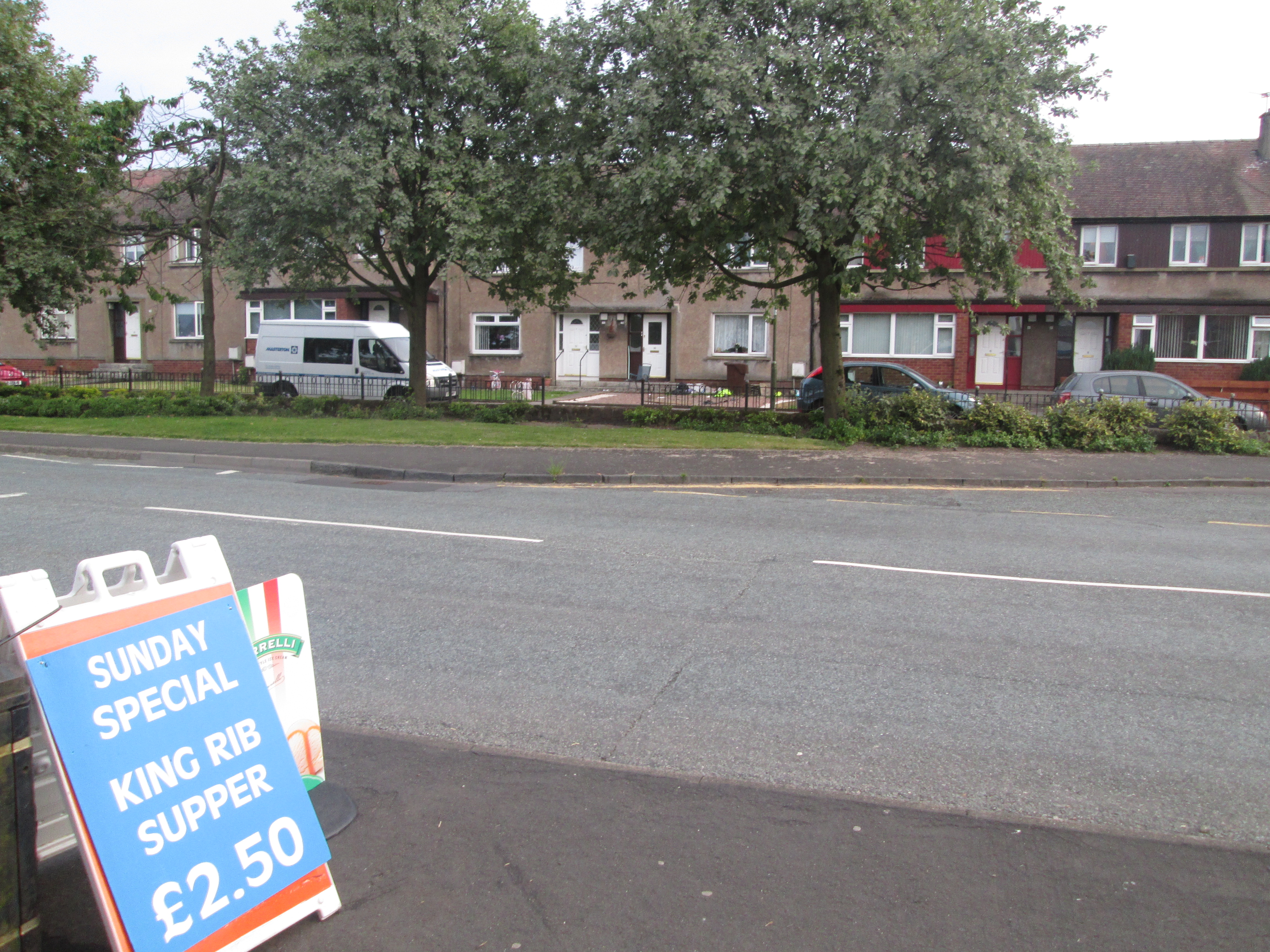 Inside, I queue with overweight young people. Feeling famished and perverse, I ask what a ‘pizza crunch’ is. The unhappy assistant lets out a cheeky smile and tells me. I order a half with chips, whilst others queue along, requesting sweet chilli haggis, huge bottles of Irn Bru, and great portions of chips, cheese and curry. The smug flatulence of Q.I. blares on in the background, a most unlikely interruption to a hard-working, three-worker line chippie specialising in premature heart attacks, diabetes, angina and heart disease. ‘What would you like hen?’