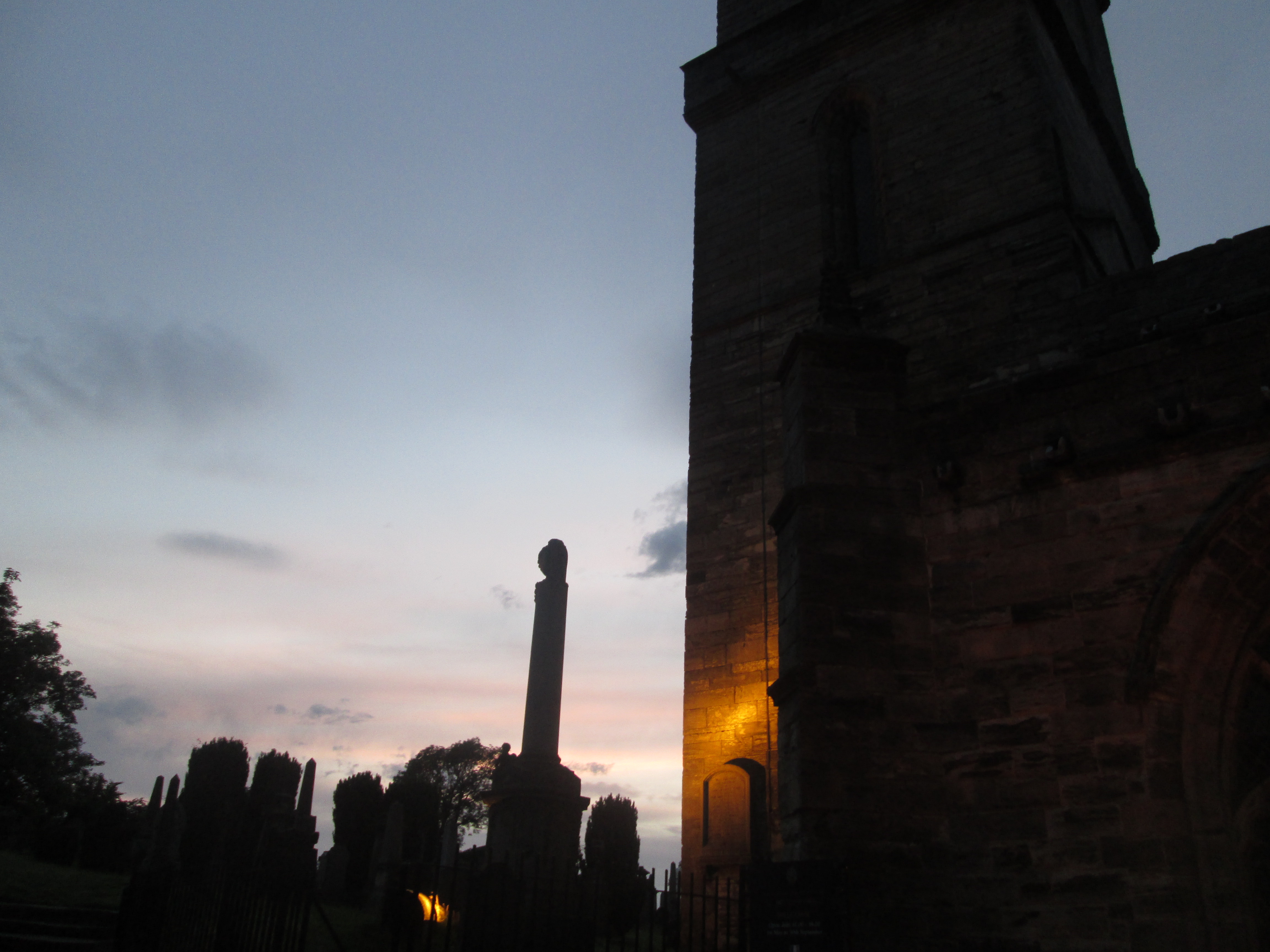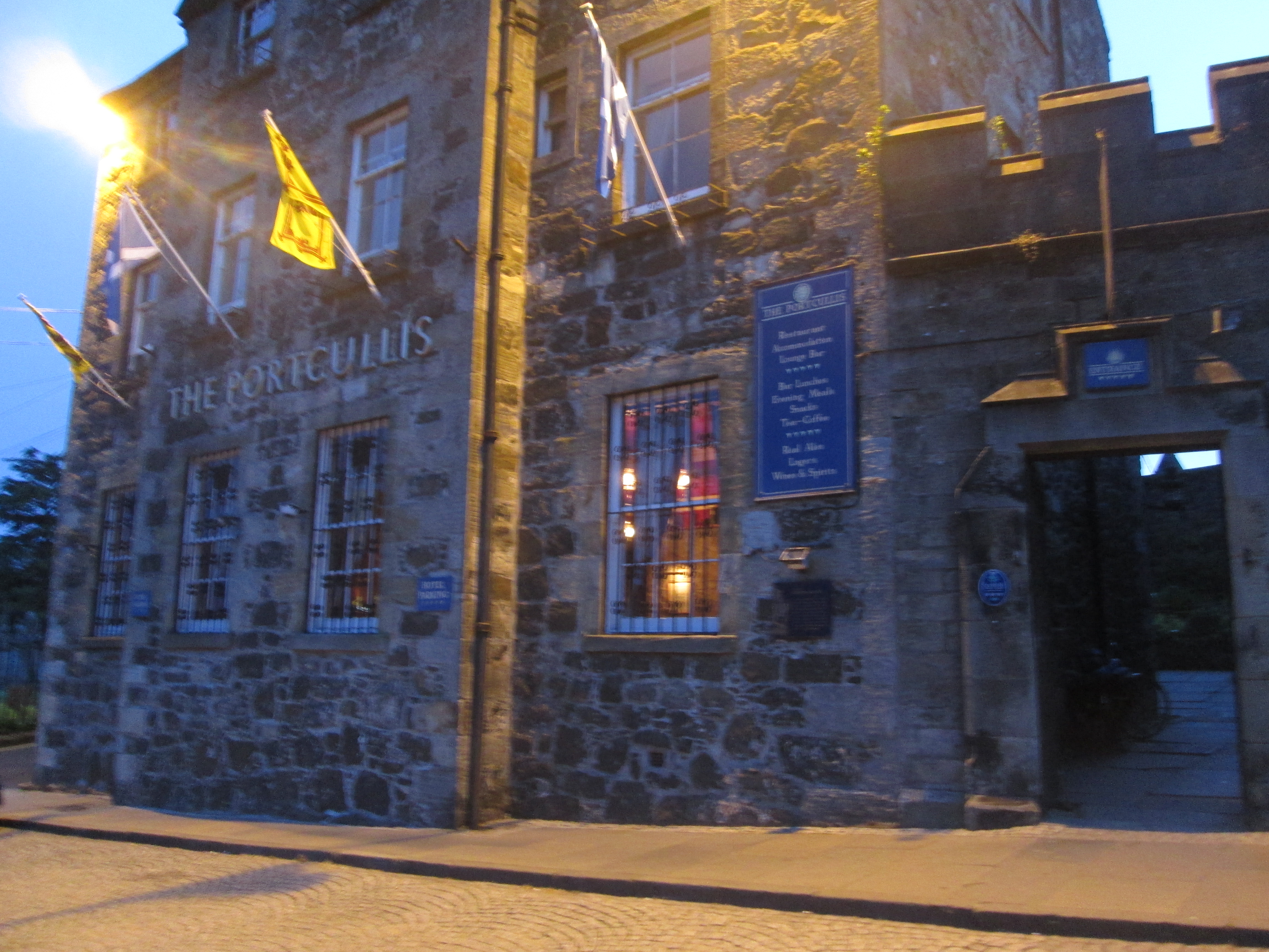 I take in the proud if reserved exterior of the Church of the Holy Rude, and look up at the curious figure that dons the top of Cowane’s hospital. A nearby old jail has been converted into a youth centre, but it is now around half ten and to late to check in. I wander about the castle for a little, peeking down at the proud Wallace Monument. It overlooks the wider area and sits near Stirling Bridge, where William Wallace won the first decisive victory of the Scots against the English in the first war of Independence in 1297. I pop into the Portcullis pub, quiet at this time, and start conversing with the bar staff. We quickly get talking about Bannockburn and the Yes campaign.