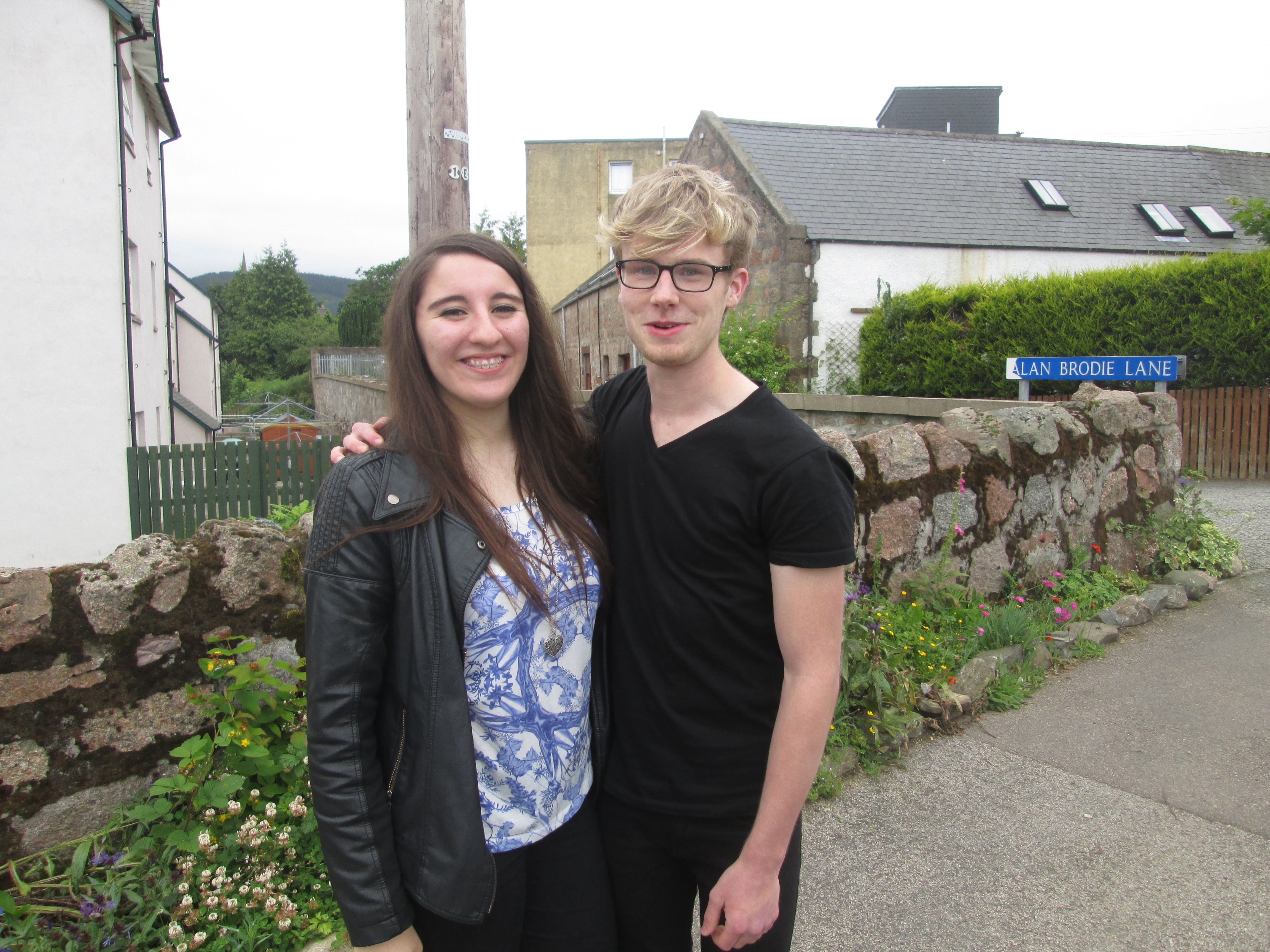 After this long and lovely road I arrive in Aboyne. I spot two young people walking by, and make conversation. Evie and Callum tell me about life in the village: