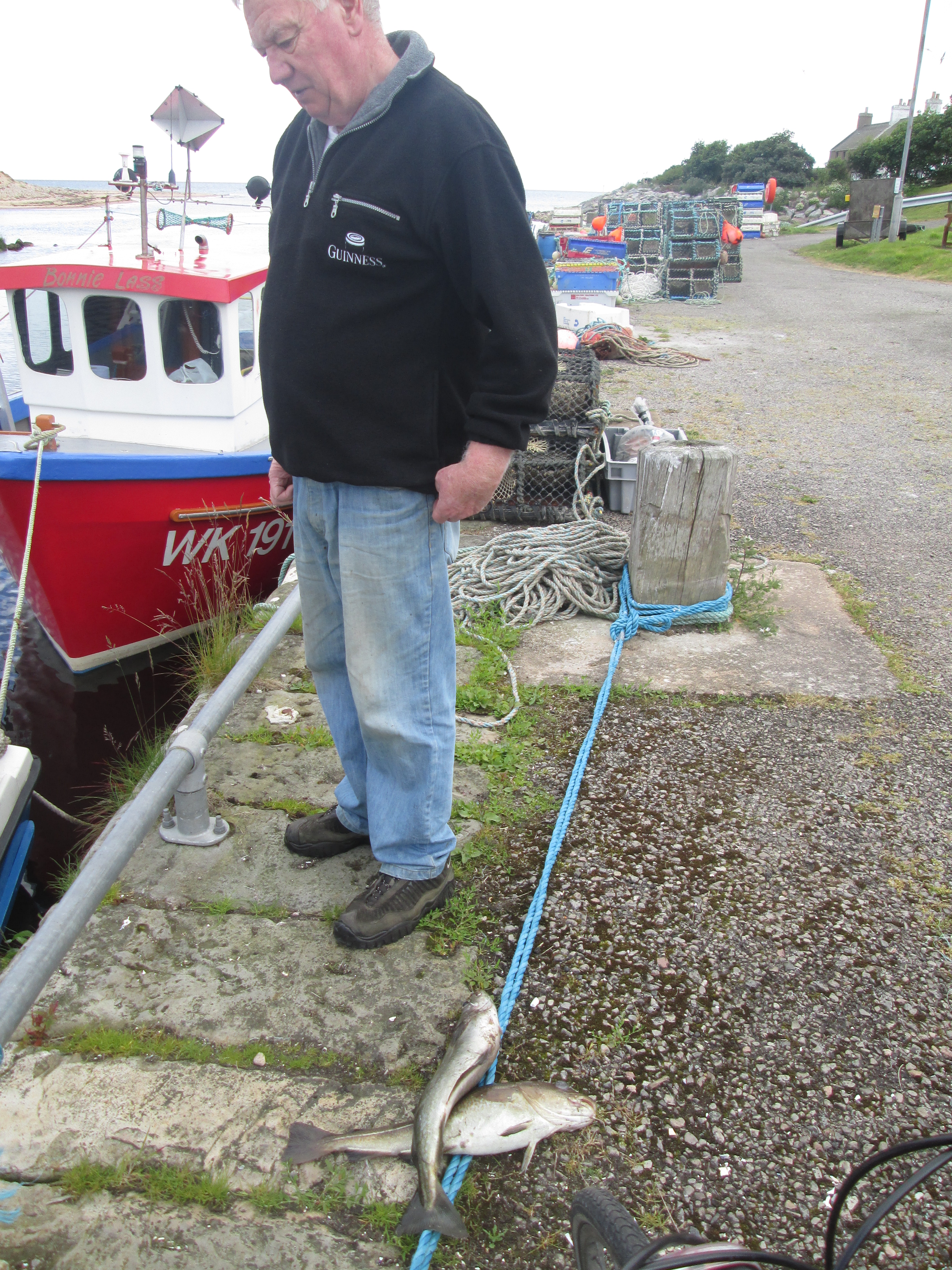 After Golspie the road becomes quiet and empty again, repeating the empty and flat terrains of the previous day from Inverness. I begin to forget what I pass, and awake on arriving in Brora, another small settlement of a similar size to Golspie, but one suggesting that it was once a more sprawling industrial town. Down in the tiny harbour, I find two local fishermen comparing their catch. Jim and Campbell tell me that one can catch saith, cod, mackerel, ling, rass and coalfish in these waters, even haddock further north at Helmsdale, all with a degree of luck and skill. For both, it’s a hobby, and the only commercial fishing that occurs here is in the odd lobster or crab, far less than the harbour’s heyday. Trawlers of the north seas devour up anything worth catching, whilst local people don’t eat the fish that they catch. Gesturing to the saith he’s caught, Jim says