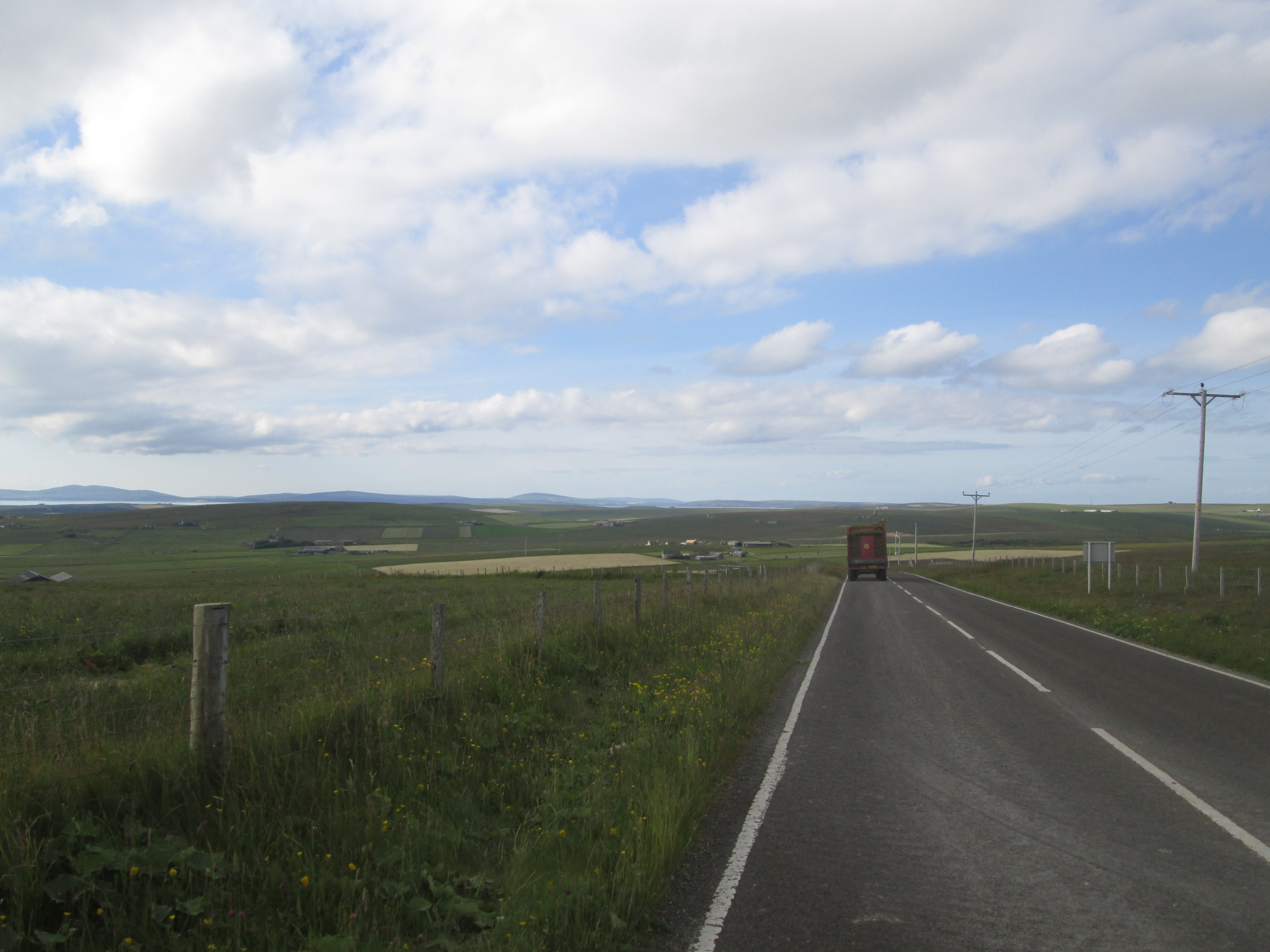 Russell meets me on the road. My SOS has been received, and Victoria has sent out her son-in-law to pick me up in his car. As the sun basks in its own reflected glow in the bay by St. Margaret’s Hope, Russell calls out to me in a southern Scots brogue, and helps me fit the bike in the back. As we whizz up and down Orkney’s mild but not to be underestimated hills, he tells me about his love of running and cycling, and upcoming plans to do the Land’s End to John o’Groats. He trains often and takes it seriously.