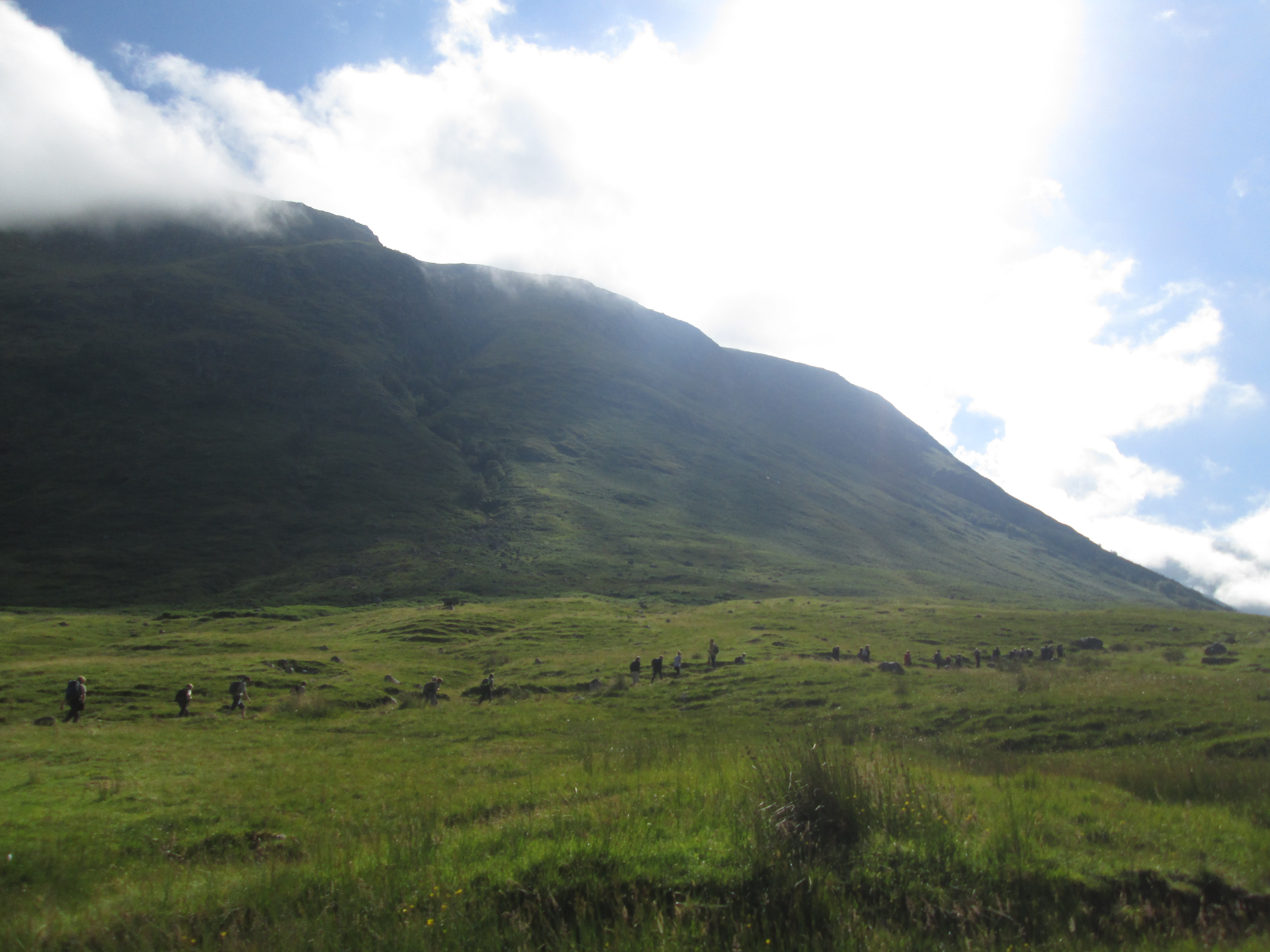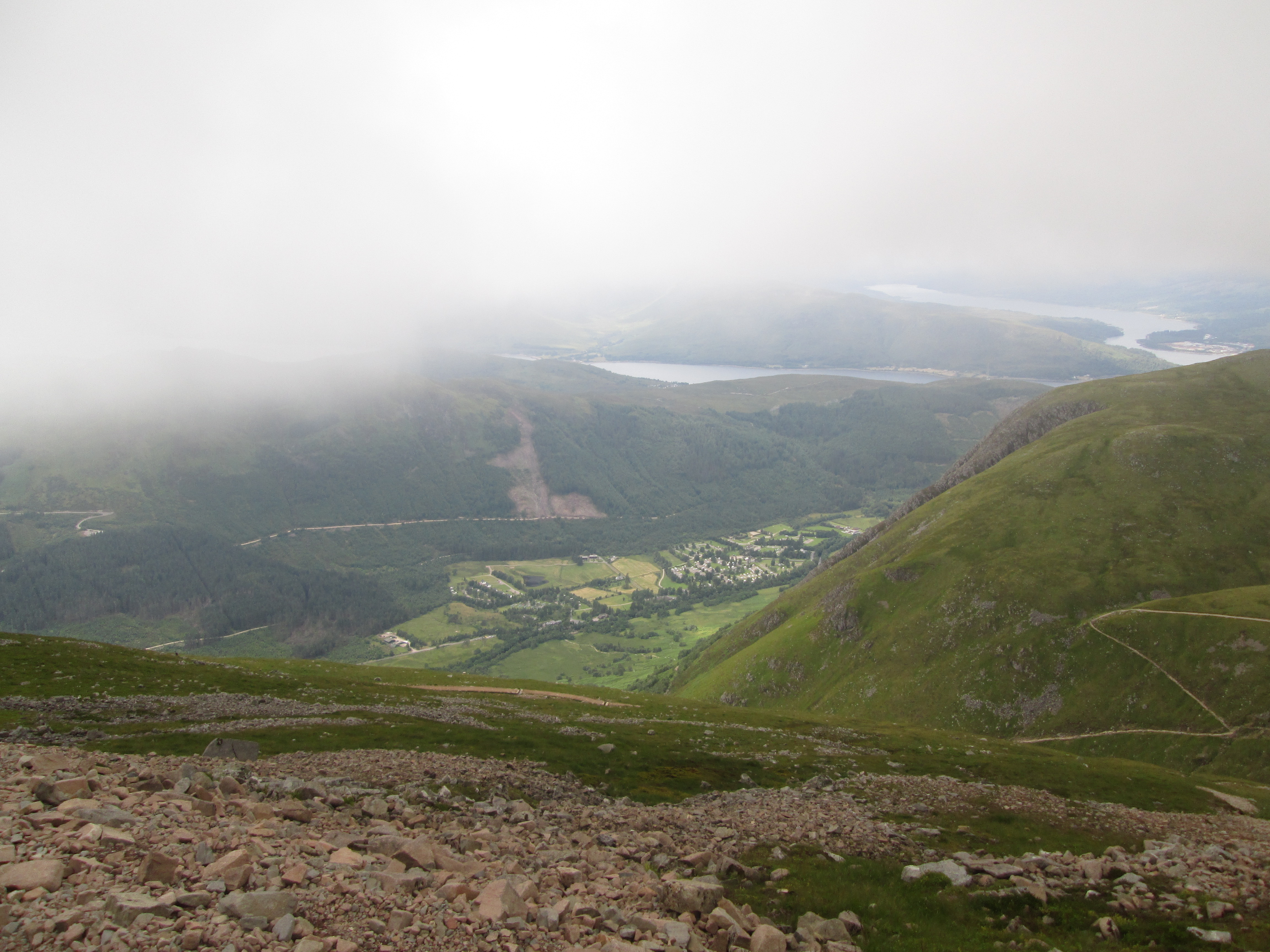 Near the foot of Nevis I start to make silly misjudgements of the terrain. One slide snaps the button holding up my shorts. With no free hands remaining as I hoist up my dignity, I struggle down further. One panorama gets me, and the ground gives in. I slide down onto the verge, knees taking the shock. I eventually reach the base with the trophy of a bloody knee and a mind electrified.