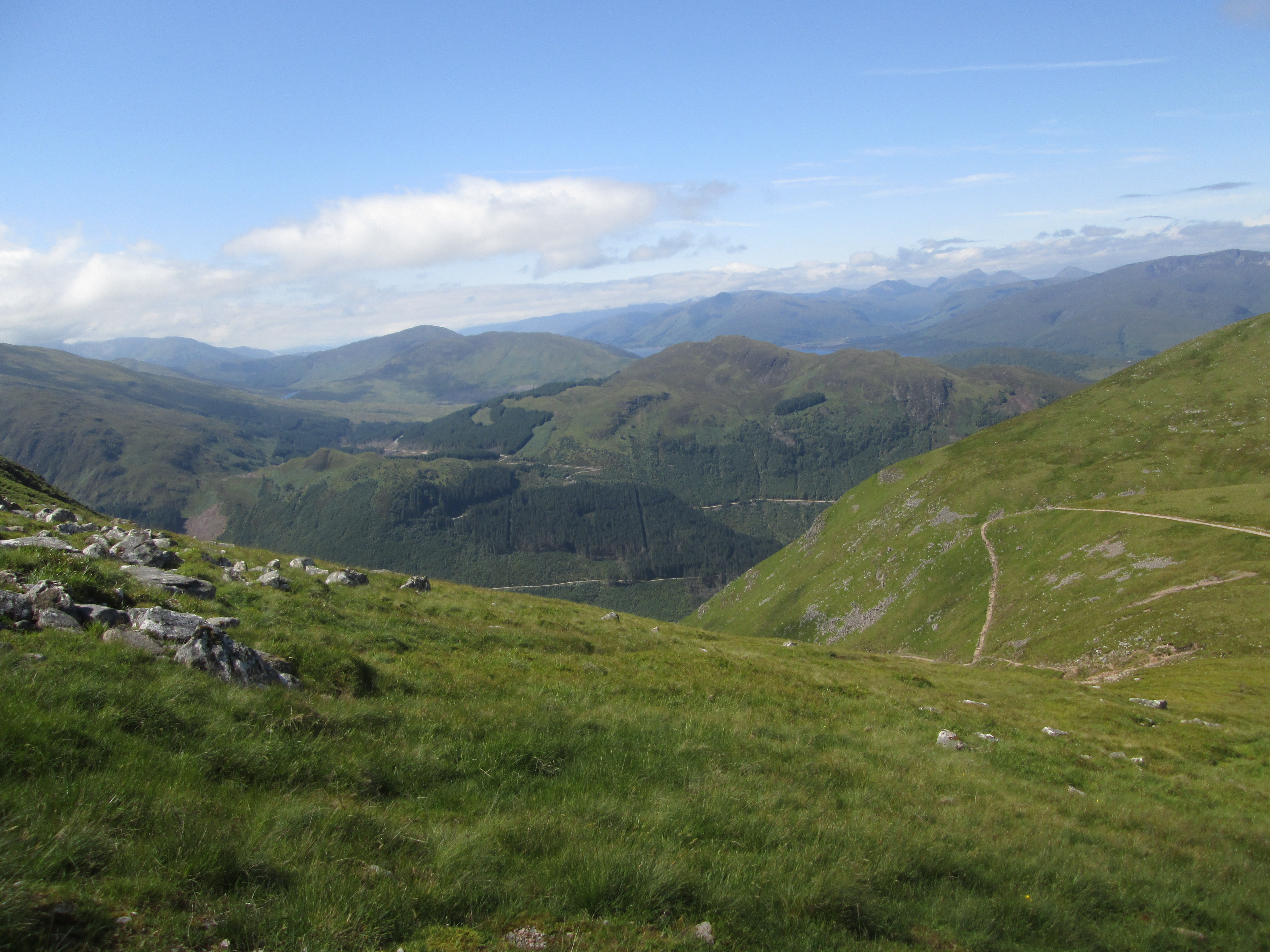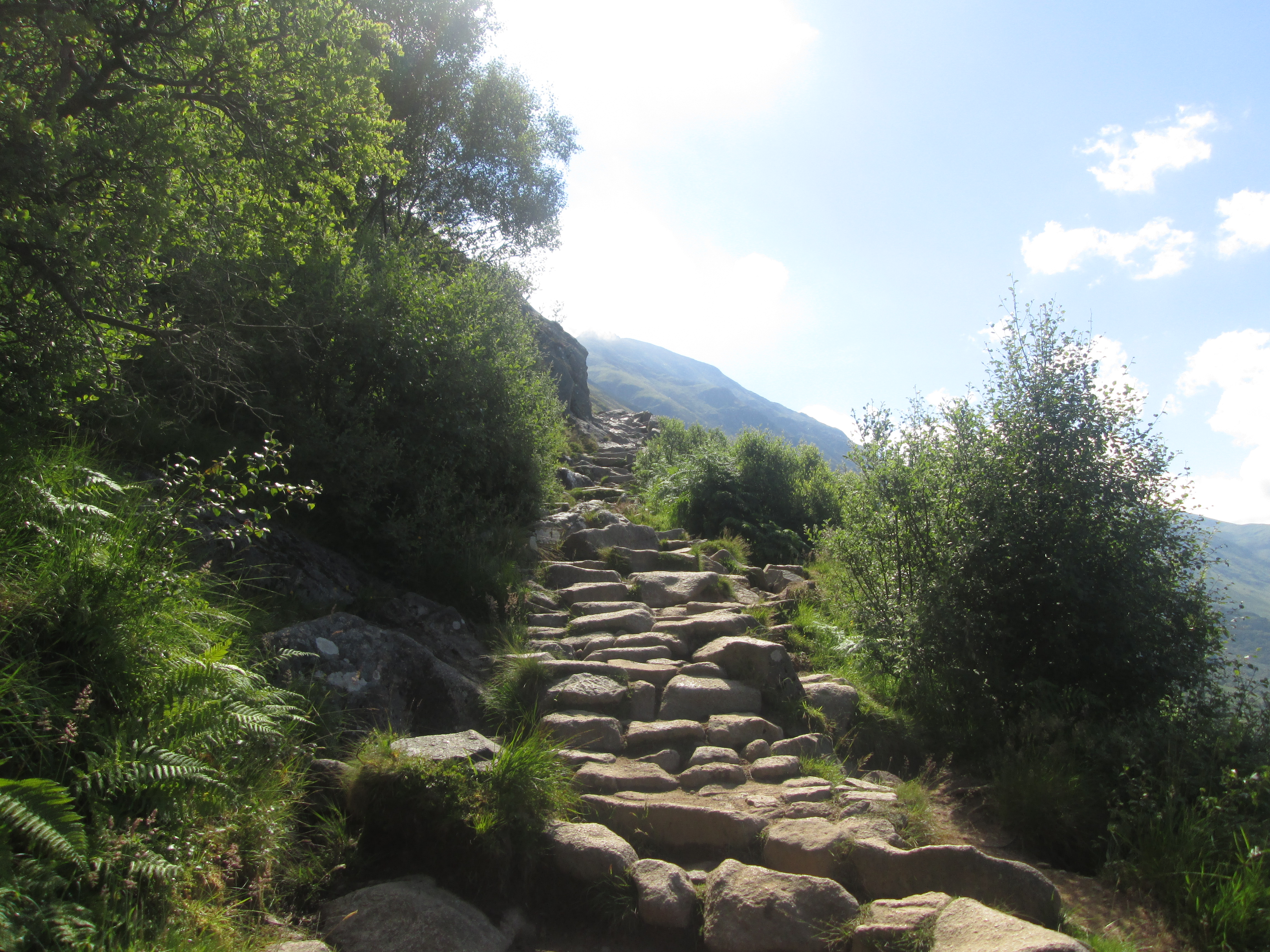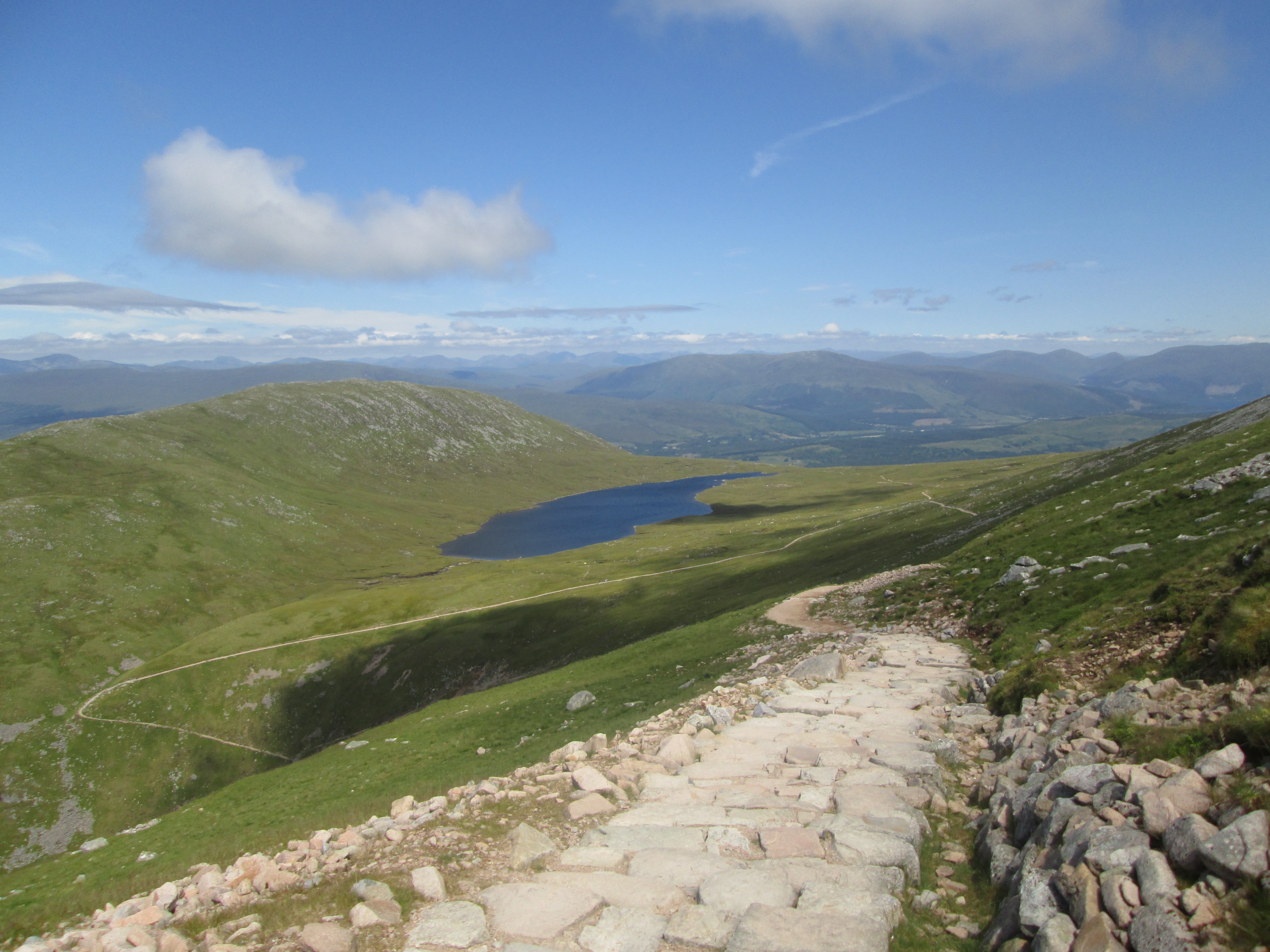The track get steeper, often requiring a hand to keep one’s balance on the dizzingly narrow track. A sense of camaraderie develops among the walkers. Like cyclists on the road, we each say hi and hullo to our fellow walkers. I meet one Chinese-British family who have also dared to scale Ben Nevis without even an iota of prior experience or preparation. I meet European tourists as well as Scottish and English visitors of all ages. This first tough part gives way to a flatter plateau with nice enough views of Glen Nevis. After that, it goes back to bloody steep, the tough track interrupted by the odd feature like a wooden bridge or a waterfall. But my, the views are astonishing.