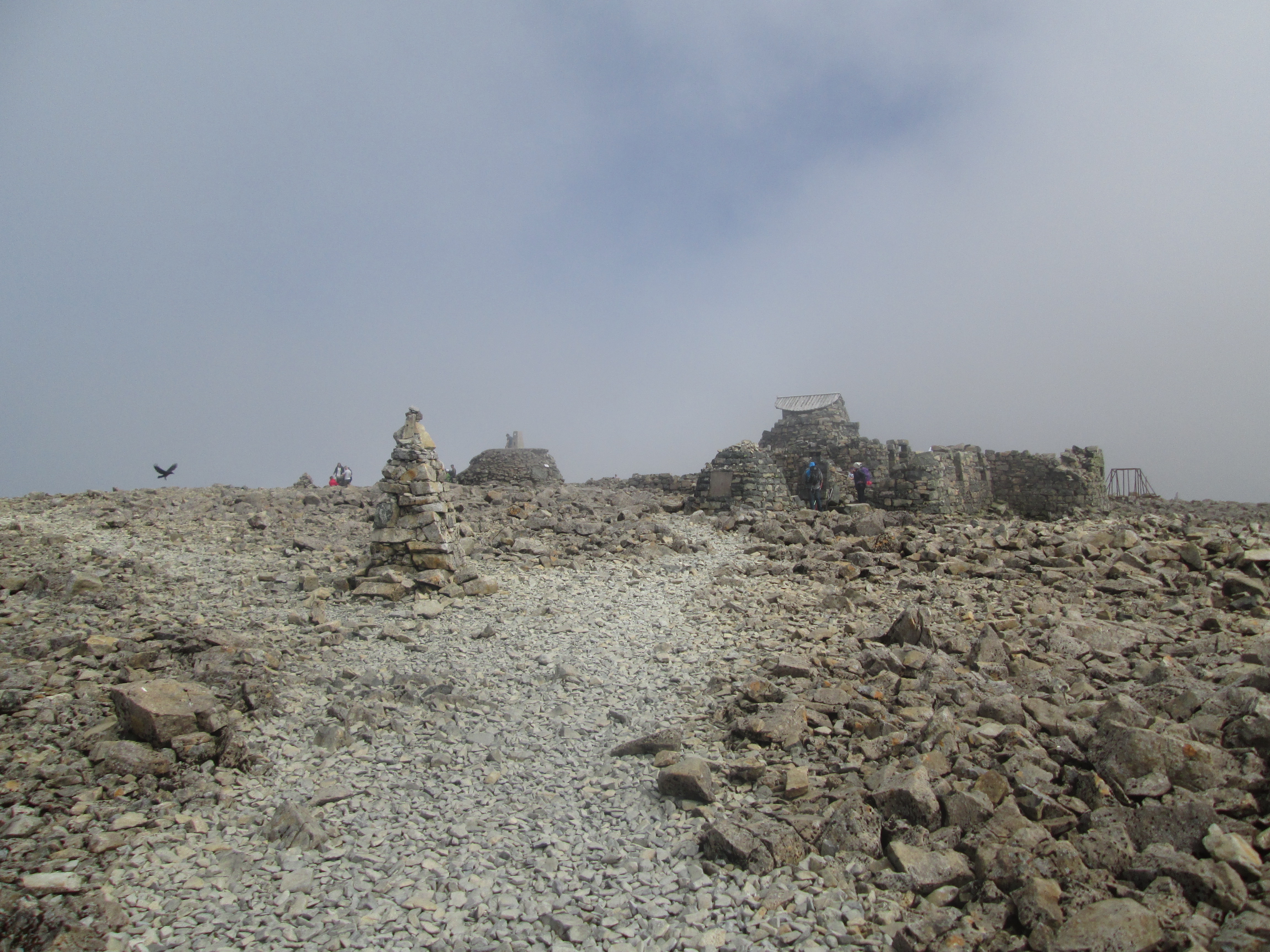 A certain threshold is crossed and the temperature starts to drop rapidly. Great frozen pools of ice line the path, and eventually it disappears. A frozen field of ice and snow stands in the way. I make the shadows of walkers in the distance – the numbers have halved compared to those I saw at the foot of Ben Nevis – and I follow them, clambering across the snow. Eventually the outline of a ruined building appears, the remains of an old observatory that became a B&B a century back. I’m at the top.