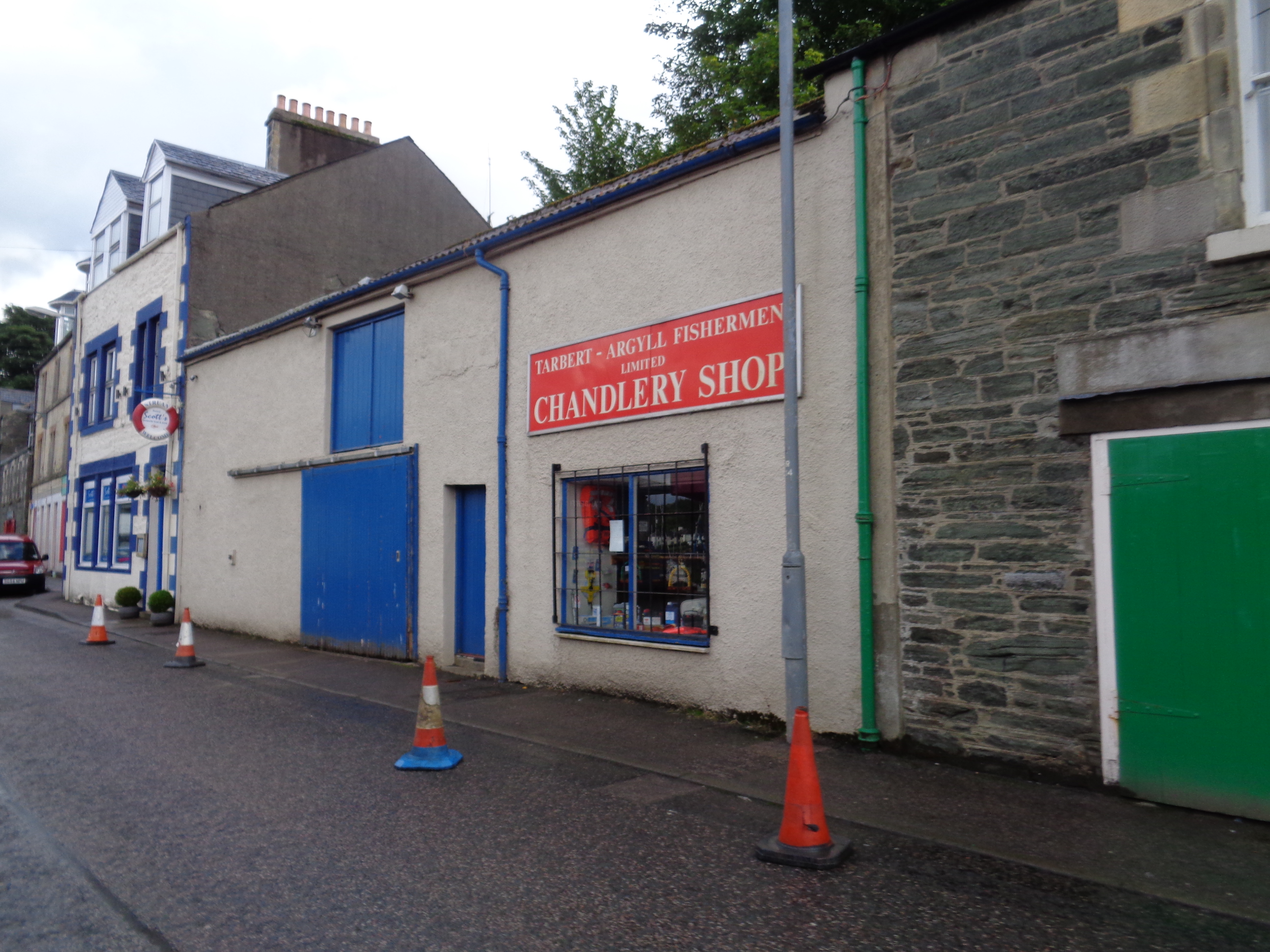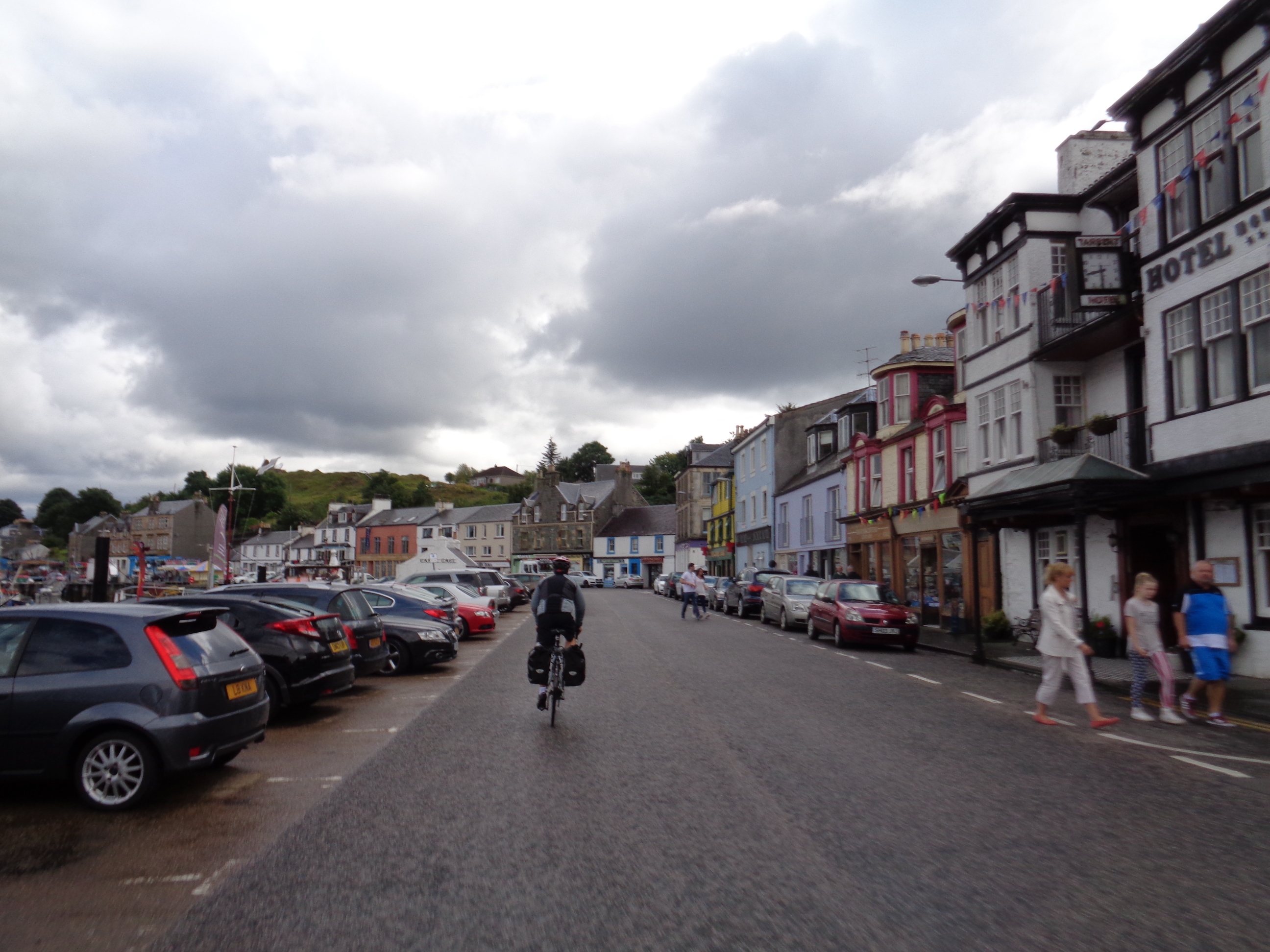We disembark at Kennacraig on Kintyre, but in order to catch the next ferry we’ve got to dash again. There’s fifteen minutes to get to Tarbert, some five miles away, and we race away. Kintyre’s relatively featureless. We sweep by some gently flat hillsides, richly green in places but without the abundance of wildlife, of natural sprawl that I’ve loved cycling alongside elsewhere. There’s some land given over to sheep, and holiday cottages here and there along the undulating hills, but we pass little until we reach Tarbert. It’s a pretty fishing village on the bottom end of Loch Fyne which I’d passed earlier on the way out of Inveraray. It once made its money in the herring trade, but today tourism seems to be the main income. The sea-facing promenade of shops is multi-coloured and cheery, reminiscent of Tobermory on Mull, but a little scruffier. We whizz through and just catch the ferry in time to Portavadie on the other side of Loch Fyne.