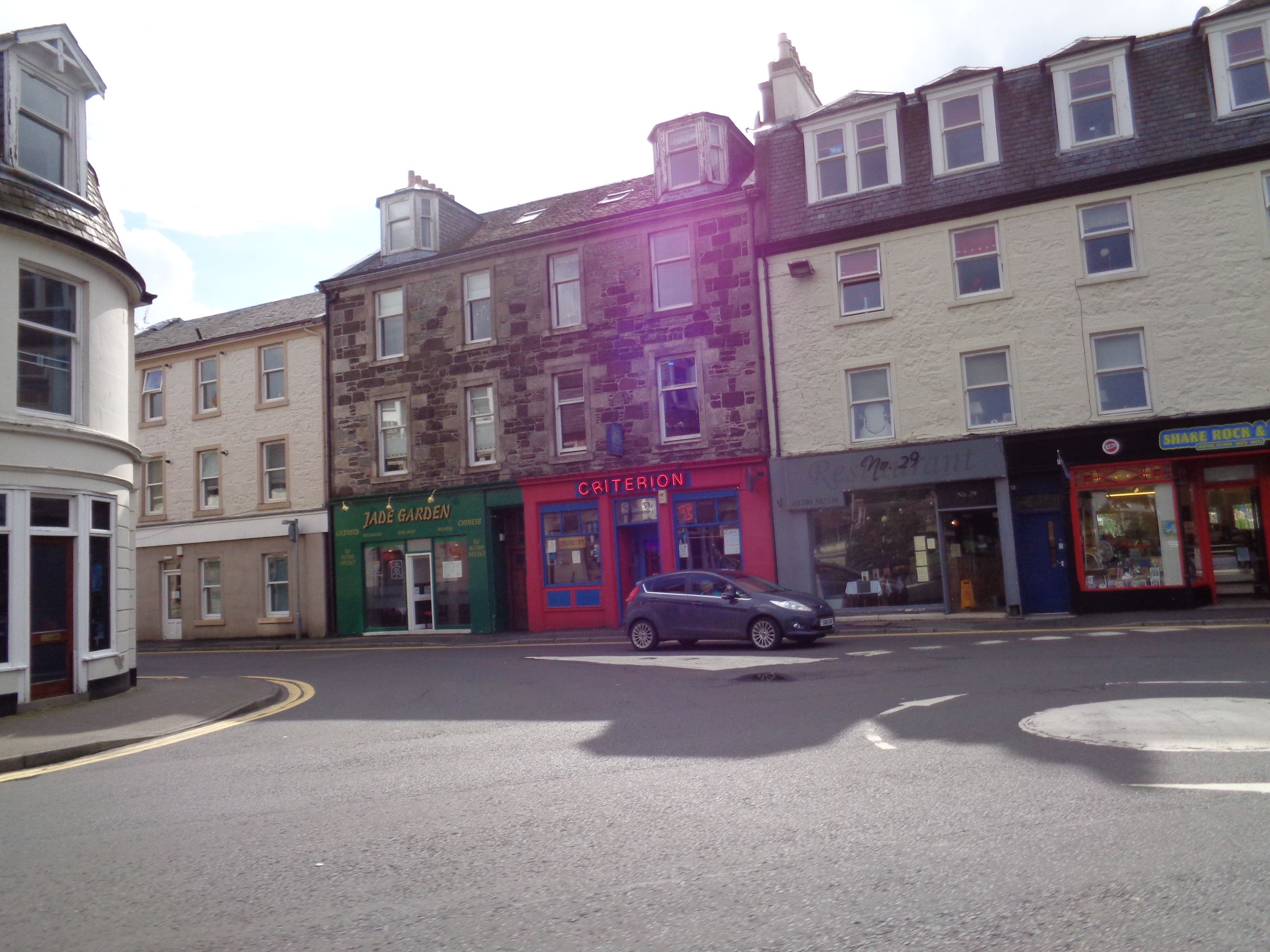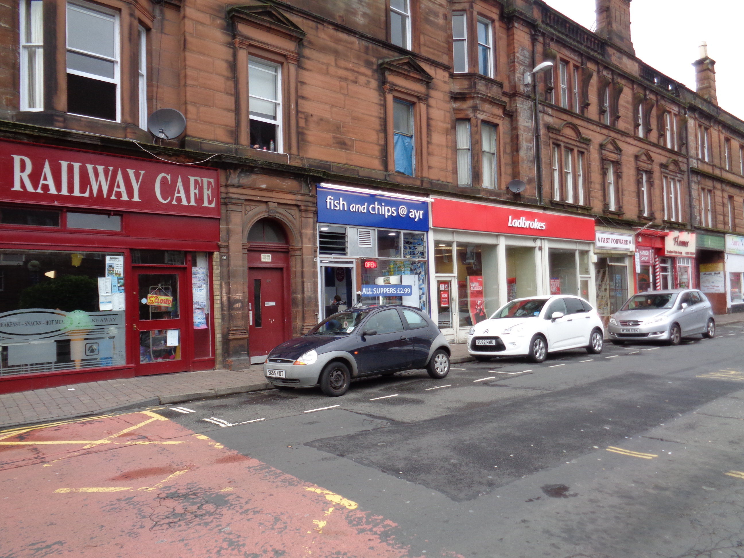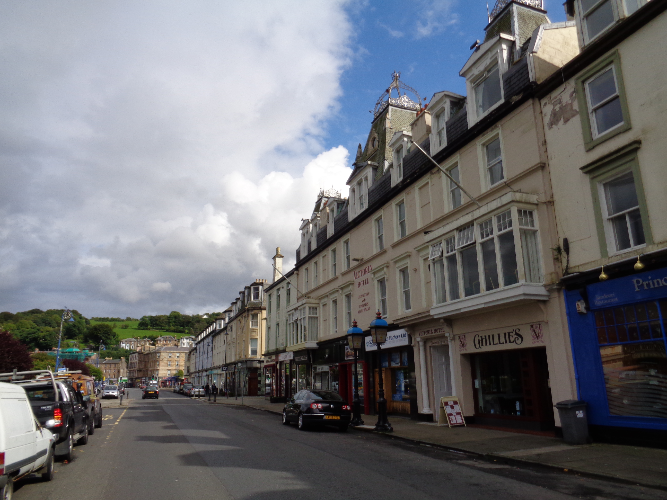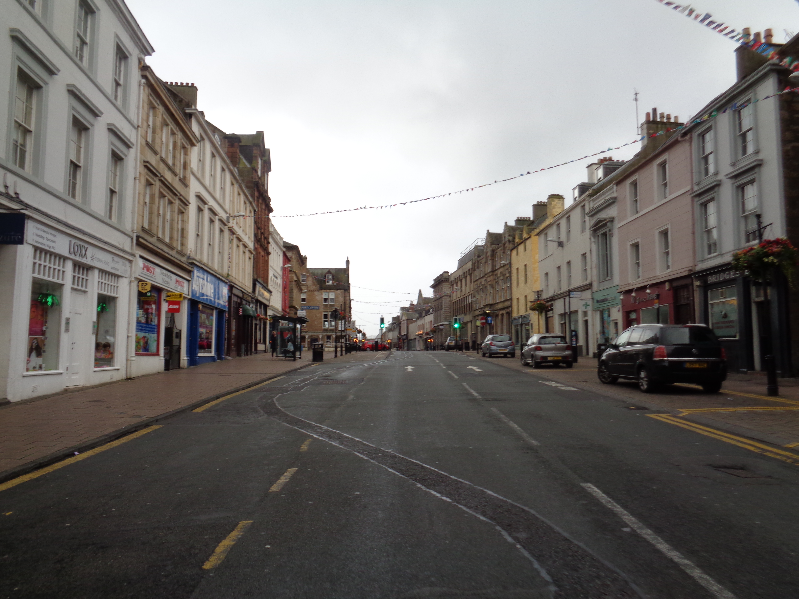 I arrive into Ayr, a small town in a county that bears its name. The ride into Irvine, just north of here, gave the impression of cycling through the countryside of Surrey or Kent in the south of England: rural yet entirely given over to farming, gently undulating and sober, lacking drama or character yet retaining a general specificity in its rich and vivid greenness. One won’t see countryside like south Ayrshire or south Kent in any other country in the world. The town itself appears large but a little run down. A dour and seemingly derelict station hotel towers over the exit of the station, and in the distance is a very shabby Odeon cinema, and a series of chip shops and pubs. I get some chips and head down towards the long high street, a grand parade of Victorian mercantilism. Today the odd Seventies’ Seifert-shite office block interrupts the pride of the place. Young teens in skinny black jeans and hoodies laugh, shriek and chase each other. An old feller tells me that there’s music on in the town tonight, some kind of festival occurring. I press on.