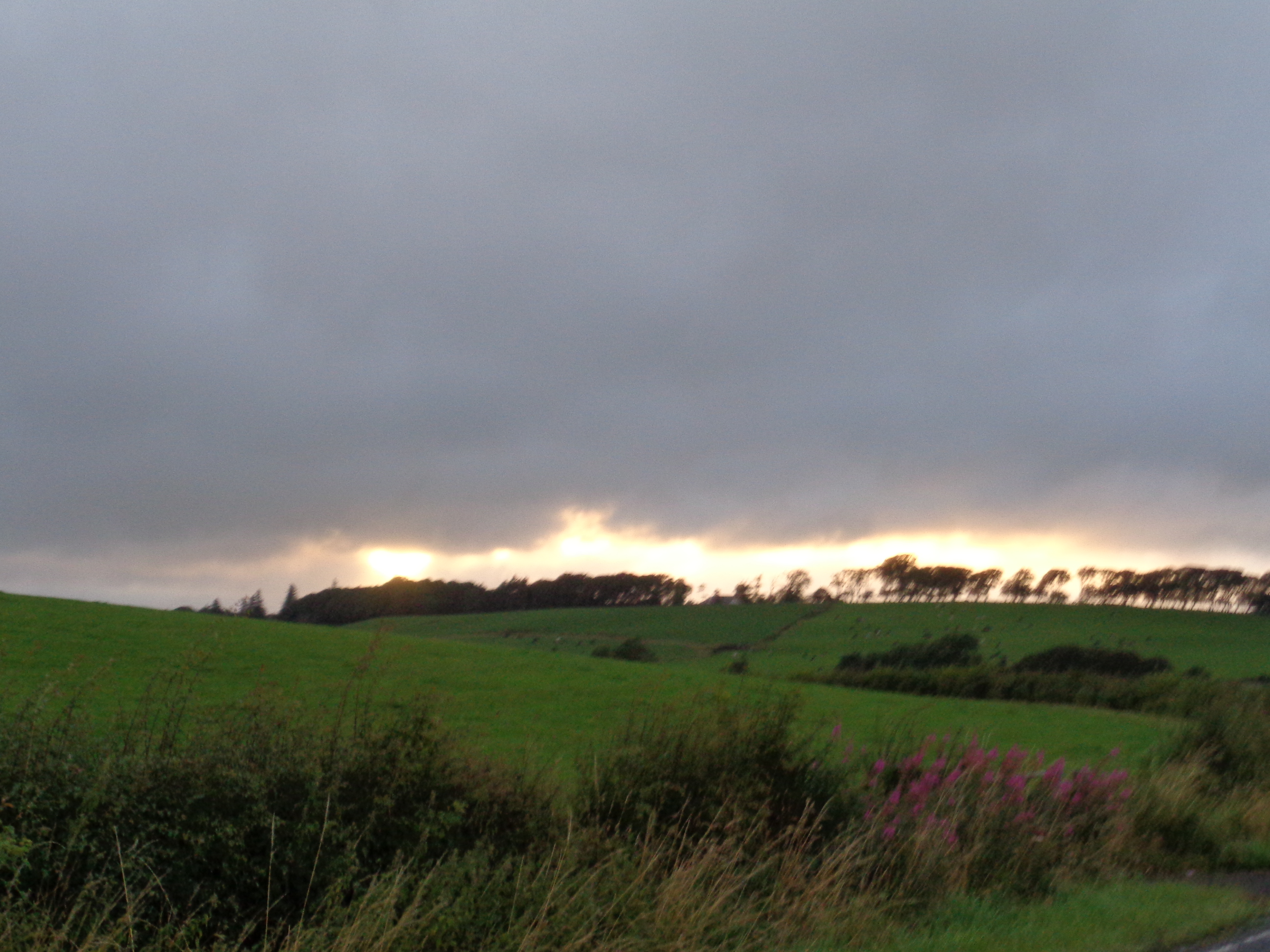I pass a hospital to my right, but the road towards Patna can mainly be characterised by its abundance of strewn rubbish. McDonalds waste and plastic wrappers have been thrown everywhere along the grassy verge. I’ve spotted this problem all across Scotland, from the pretty lowlands that reach up to Stirling to the peaks of the Cairngorms. It’s a shame that such a genial, sharp and sociable people are so loath to hold onto their rubbish until they get home. The road passes through farmland filled with cattle, and behind them, the skies perform another dramatic twist, plunging the valleys and plains into a delightful golden sunset.