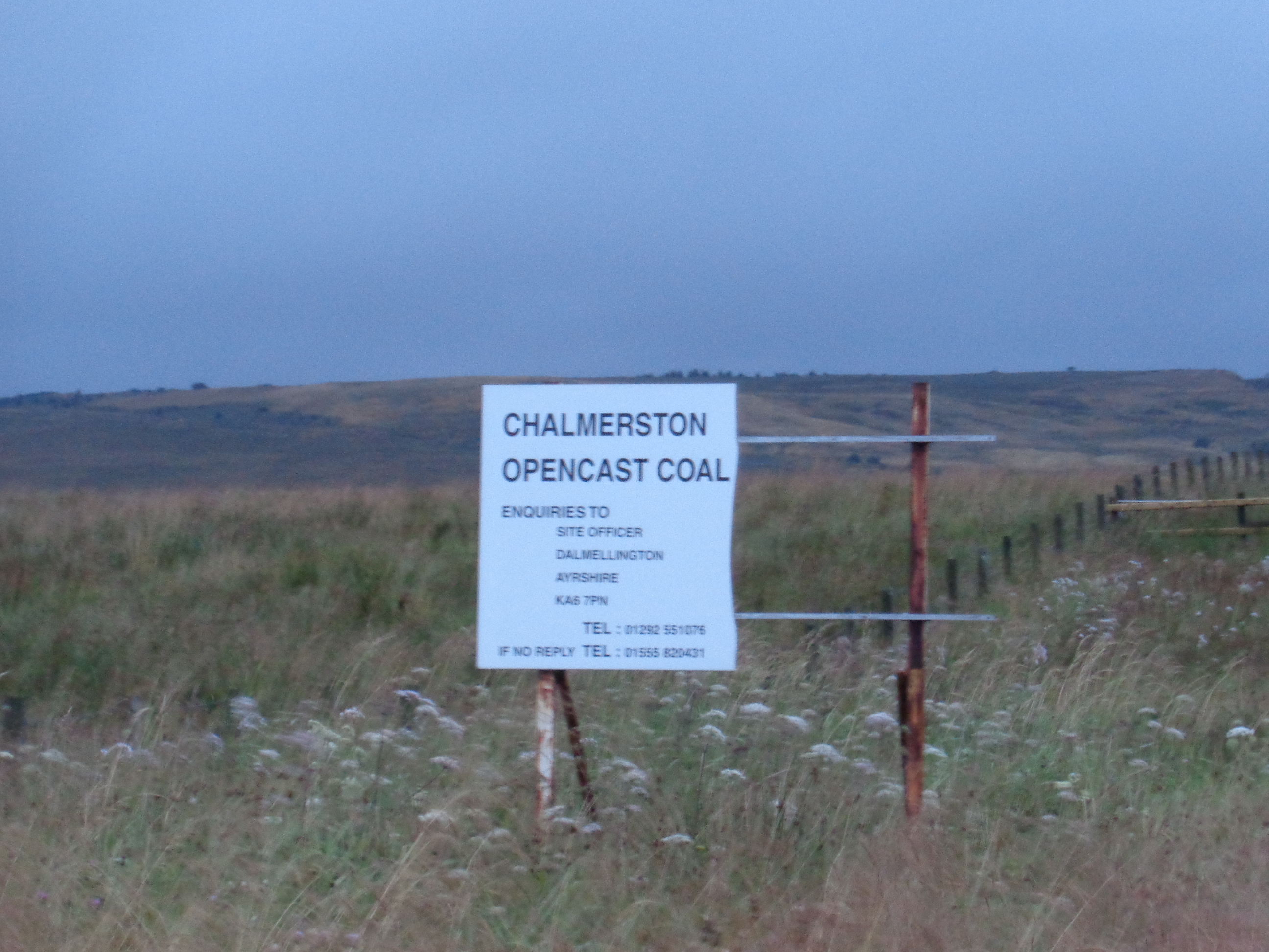 Dalmellington appears, a small mining village situated in a valley. A little after Patna, I’d passed a couple of white stones with ‘in memory of unemployed 1921′ on one, and ’22 23’ on another next to it, suggesting the area’s industrial past and decline. There’s an open-cast mine just outside the village which I pass to my left, but little sign that it’s still in use. I follow a road in, and spy a big feller smoking a cigarette outside a pub. I pop into the Eglinton Hotel in search of information and a can of Irn Bru.