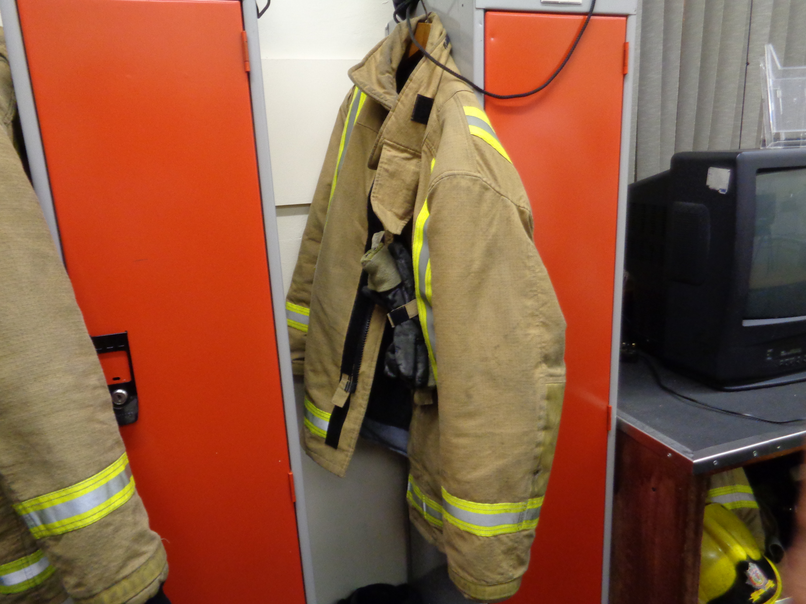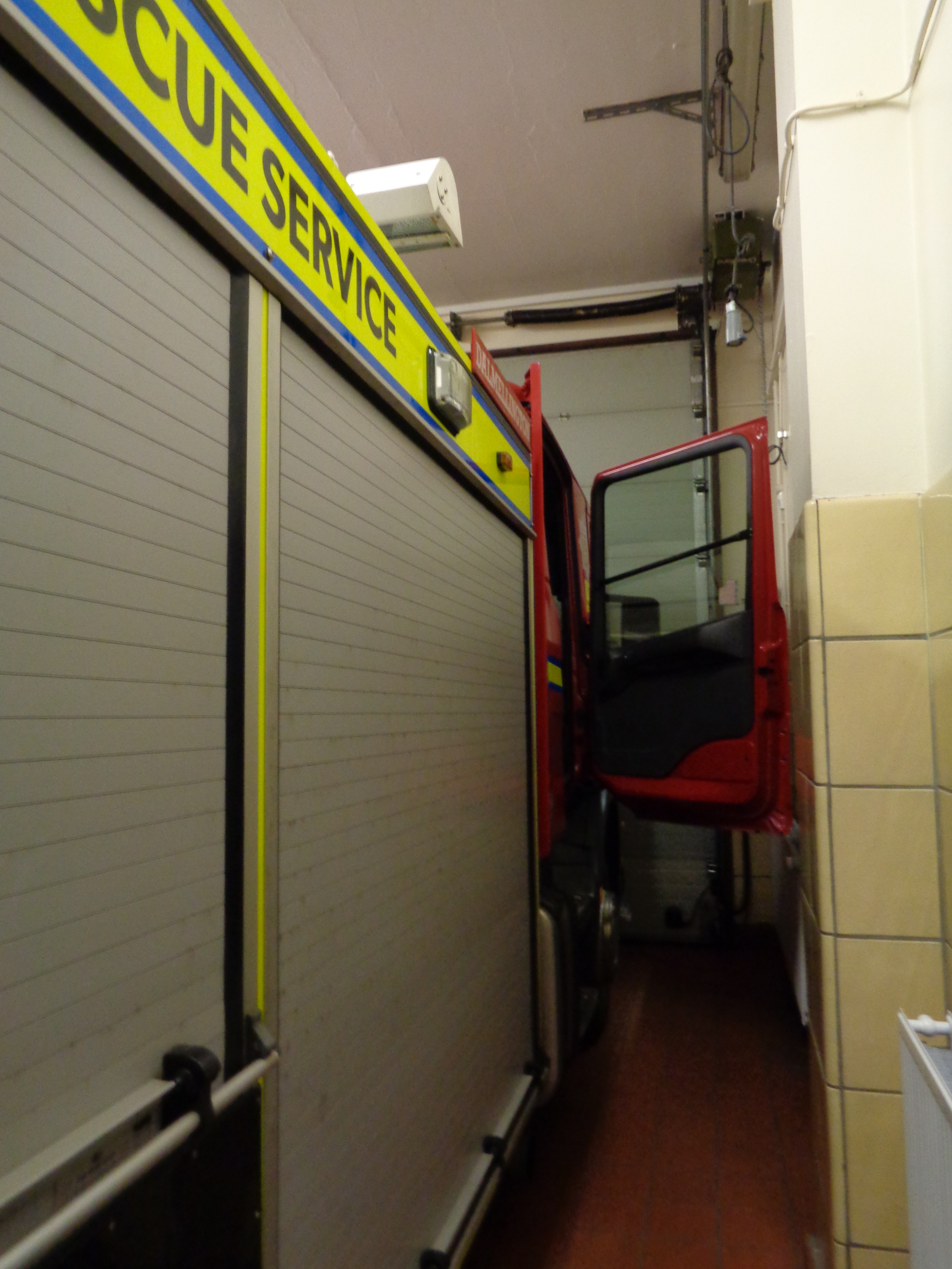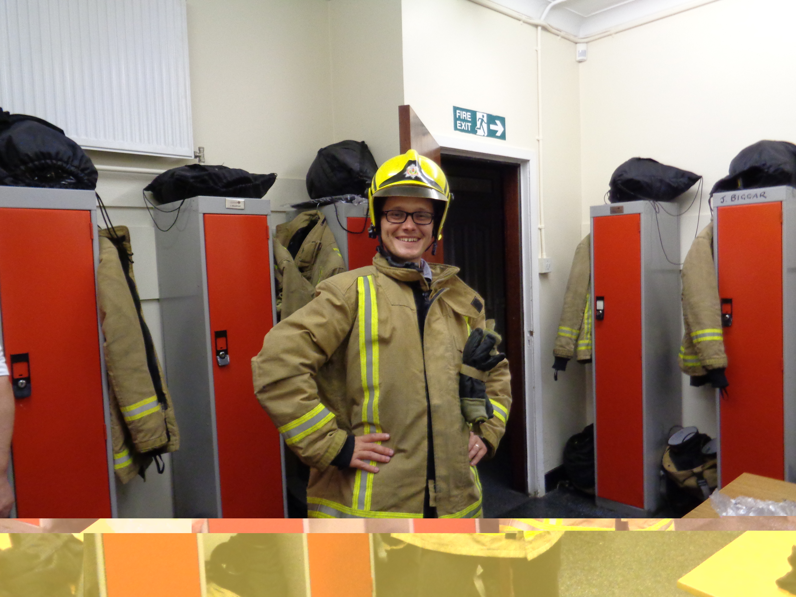 In the station, Billy guides me round and shows me how everything work. There is the fire cat, a kind of fax machine that prints out an address and information whenever the local fire service is needed. Two teams work at this station made up of locals paid on a small retainer, a kind of semi-voluntary role that is heavily underpaid for the work it entails. Billy leads one team, and each take it in turns to serve the station. With Shona and her friend Leonie, we try on the very heavy fire-jackets and hats. It is rather like wearing an astronaut’s costume, and the weight is unbelievable. It gets very hot and suffocating in such gear, and that’s before extra layers like a gas mask, breathing tanks and a gas costume are added. I don’t know how firemen even manage to walk.