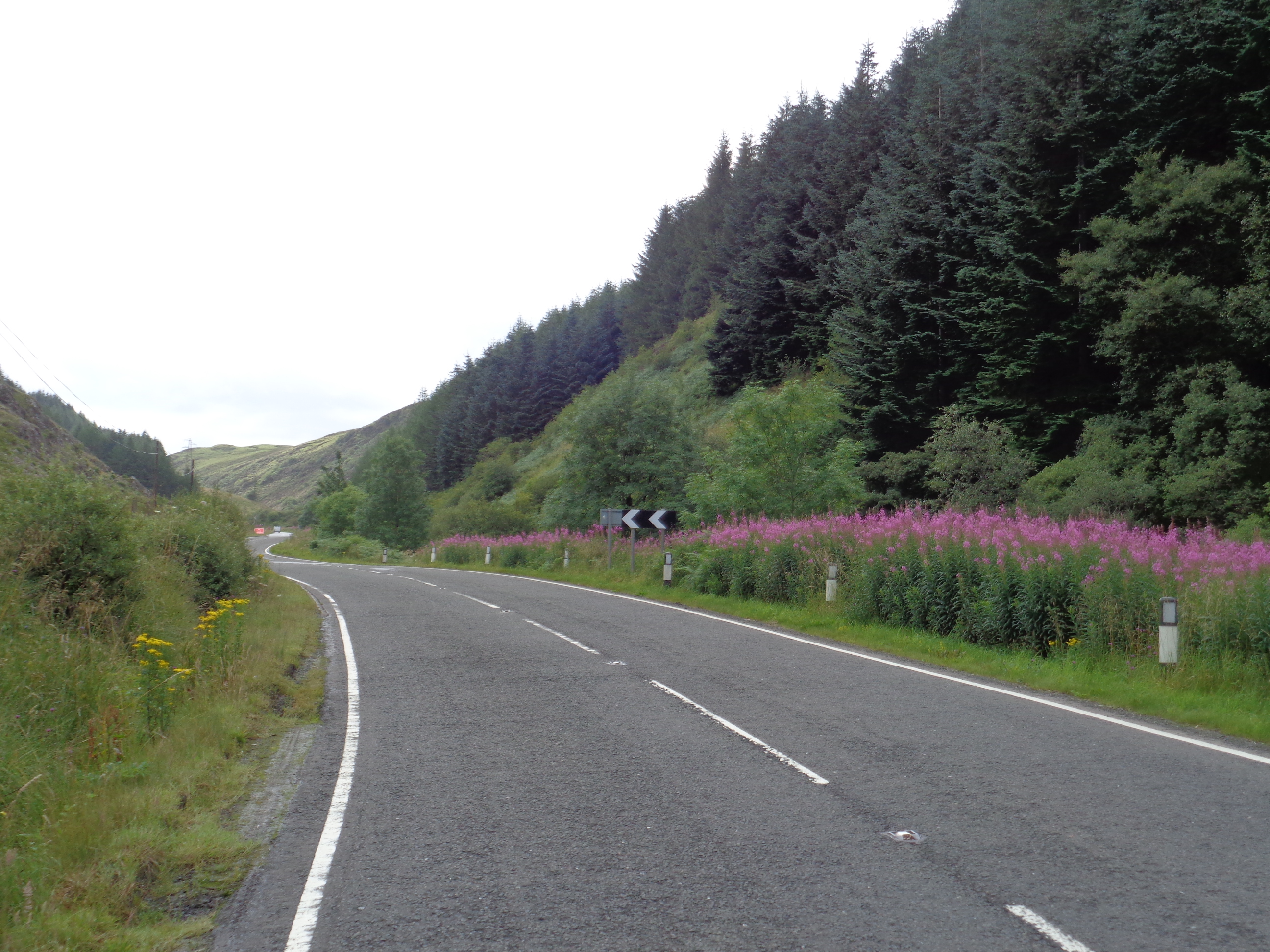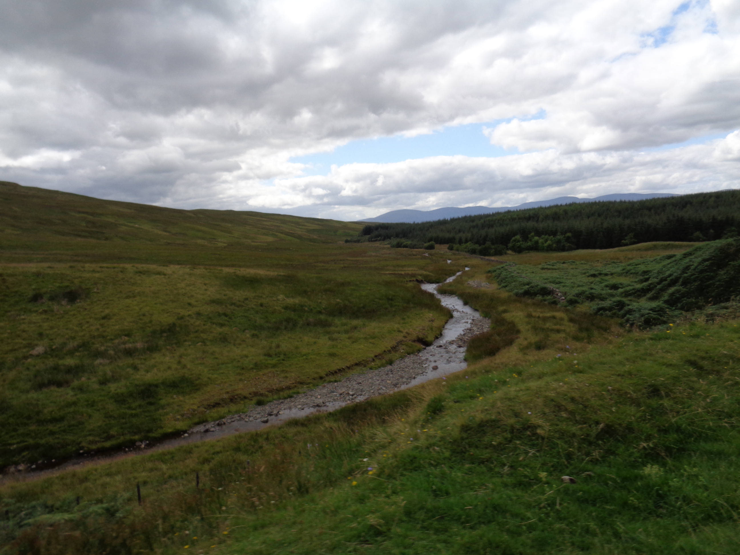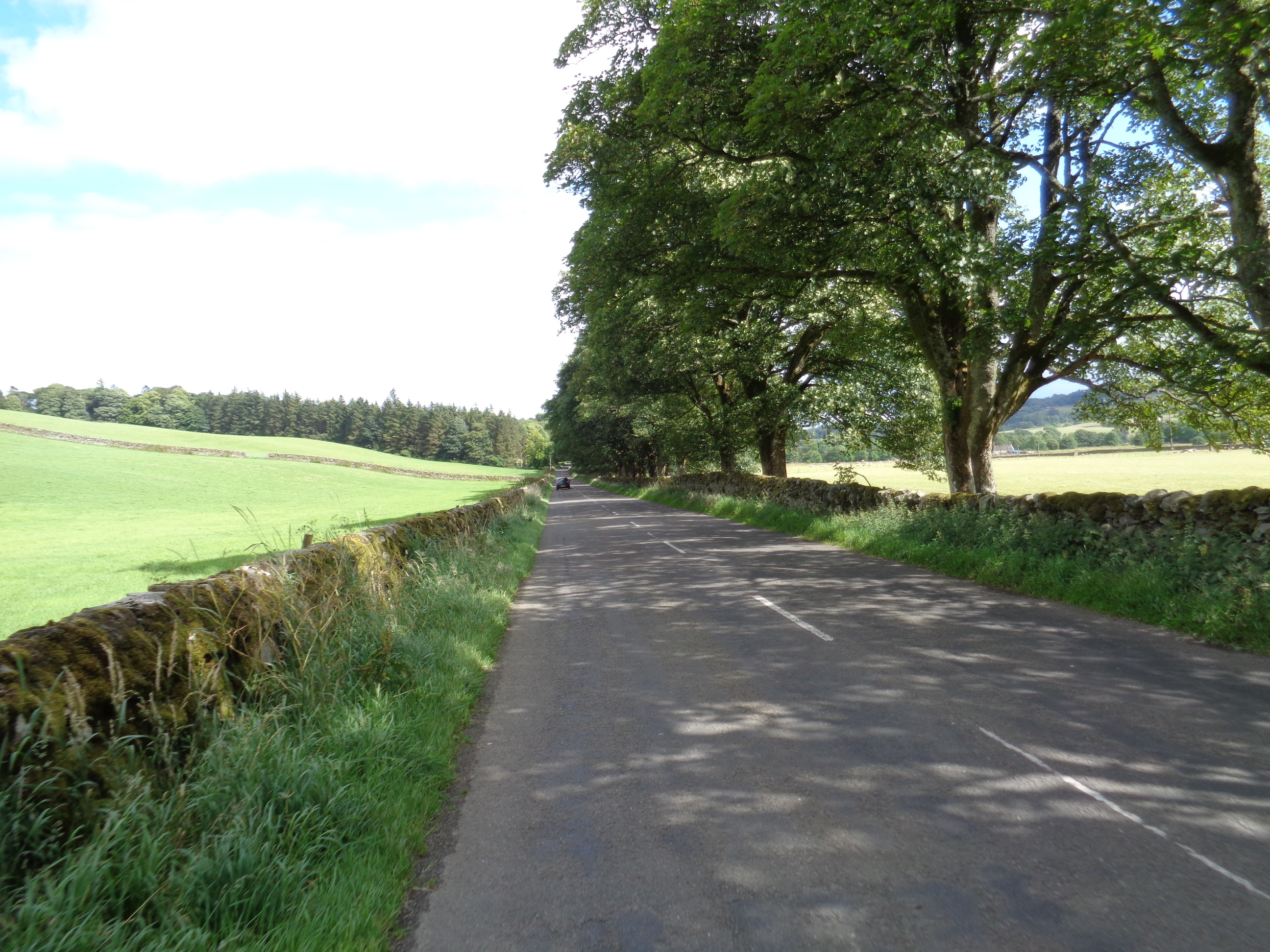 The countryside leaving Dalmellington has been farmed with cattle, as has much of Ayrshire, and it gently slopes here and there with a pleasant though familiar aspect: green, farmed fields give way at their peaks to the beginnings of gentle mountains, marked with bursts of trees and shrubs. Further along, the road drills through a valley, small mountains sloping into the distance. It’s a relatively quiet road and there’s no threat of rain today. I pedal along gently, slowly building up a pace.