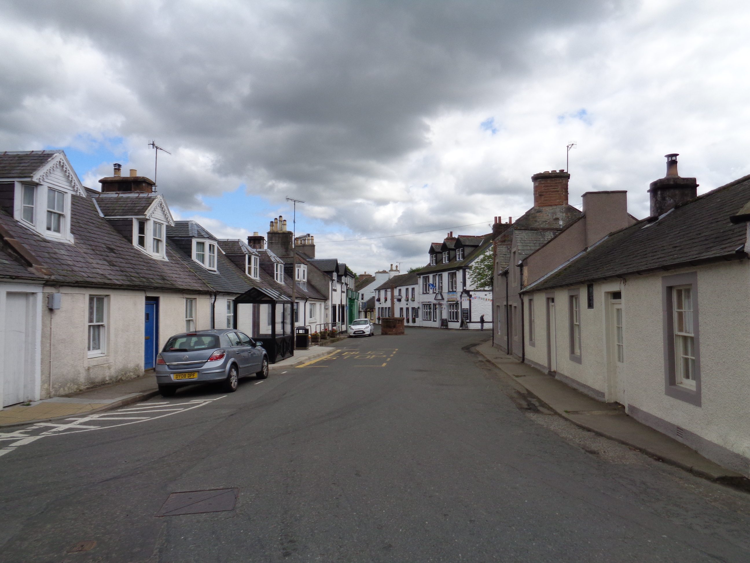 Further up the road I pass the Southern Upland Way, but the road is generally a peaceful and easy pleasure. I past dry-stone walls, which to me seem like a natural wonder. Consider the effort and ingenuity in creating a wall that’s lasted for centuries, without grout, glue, or owt else? Forests at times take the place of fields and river, and eventually I reach the village of Moniaive.