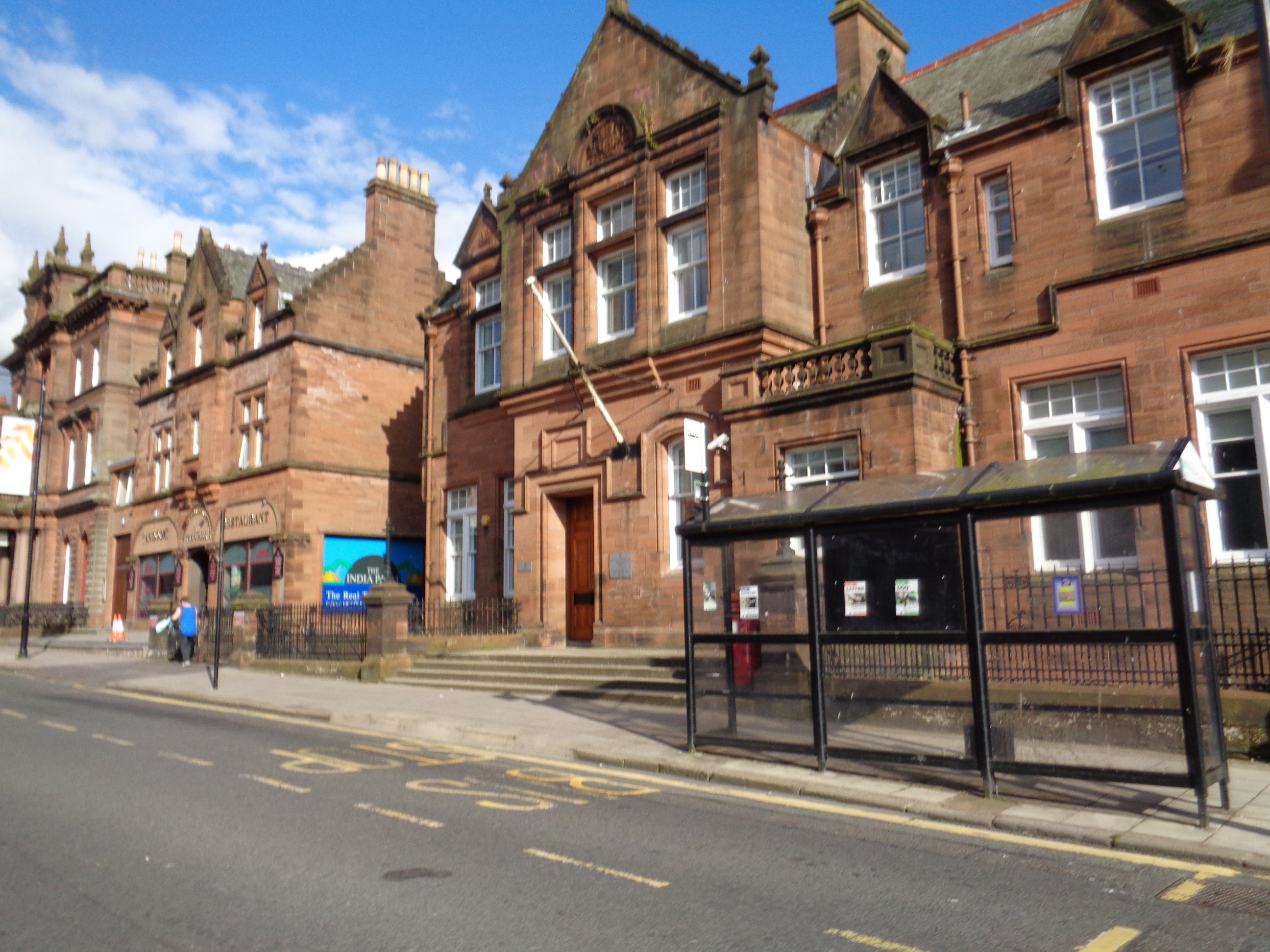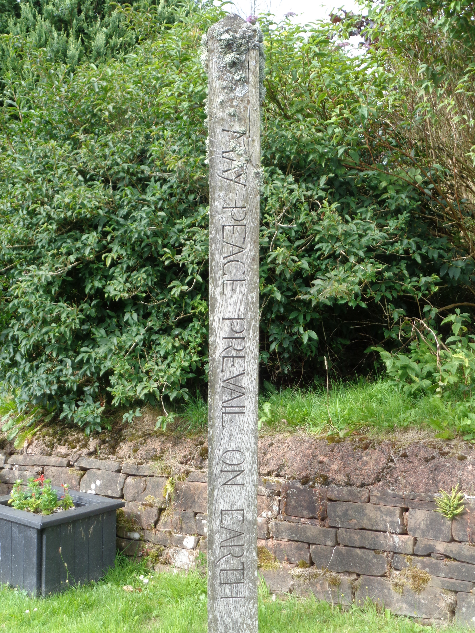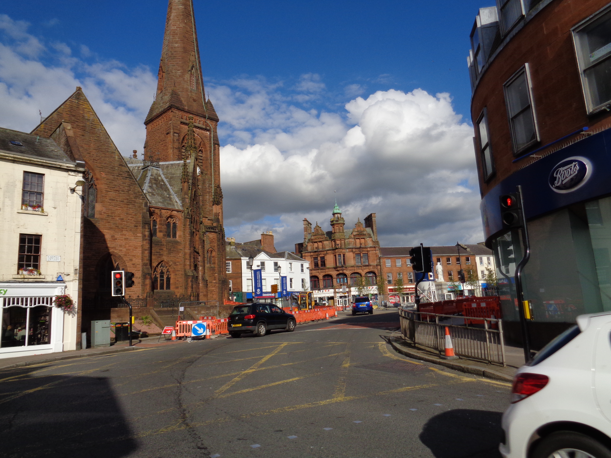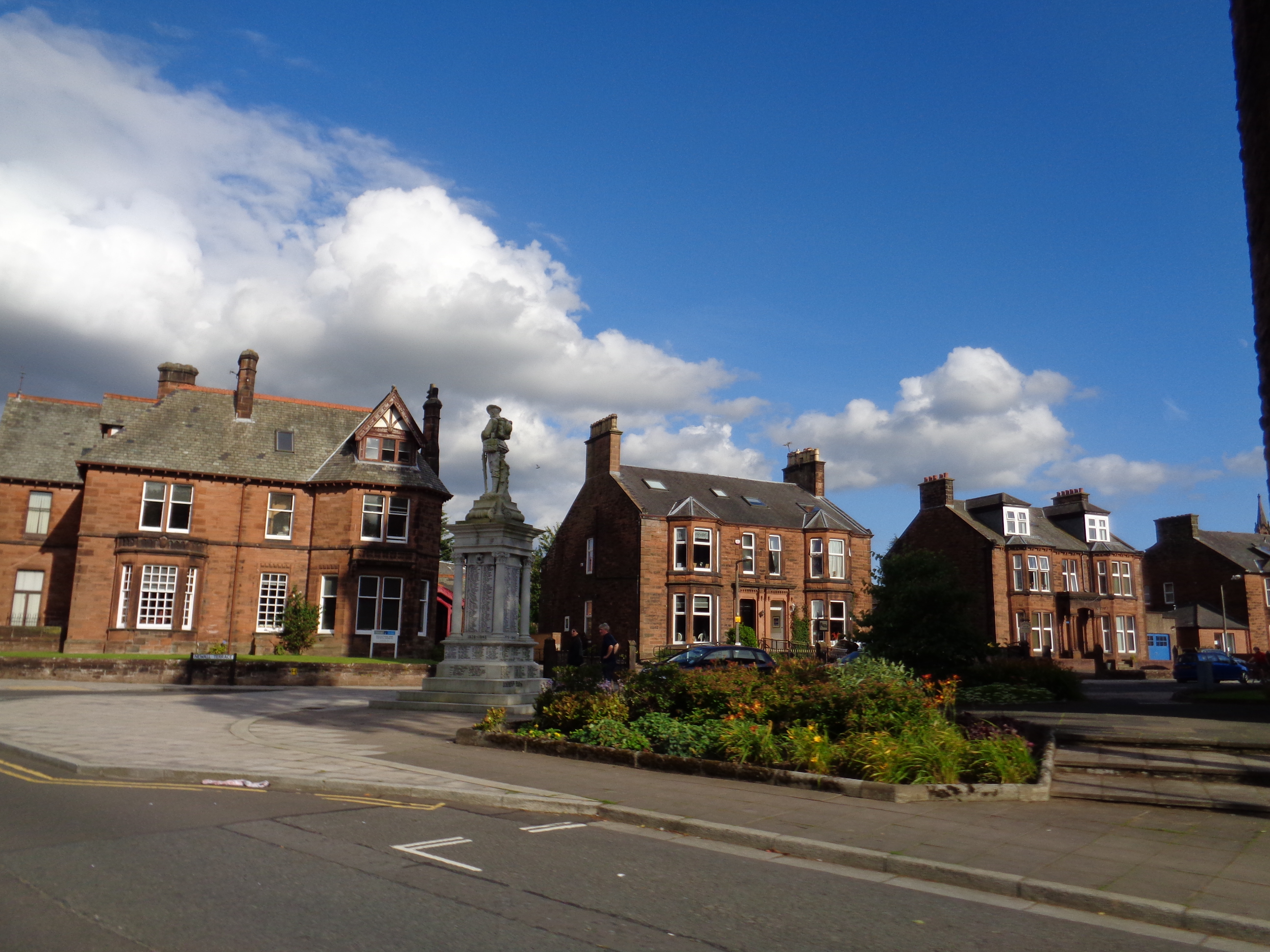 After Moniaive the road rejoins a larger A-road, and the journey becomes less interesting. It passes one or two pretty villages like that of Dunscore, with its blooming floral displays, pretty cottages and unusual wooden stile with its message of peace. There are the occasional ruined cottages I pass, shrubs From countryside it drifts into the vestiges of suburbia. The road becomes a dual carriage-way, and the drivers get over-excited by the additional space and speed up. There’s nothing to distract the imagination here, and the mind starts to become frustrated and bored with the grassy verges, high hedges and sprawl of litter. Dour semi-detached housing looms, and then the more familiar signs of a drive-thru McDonalds, a retail park, and a humongous supermarket loom ahead. Welcome to Dumfries, another British Town Centre, right?