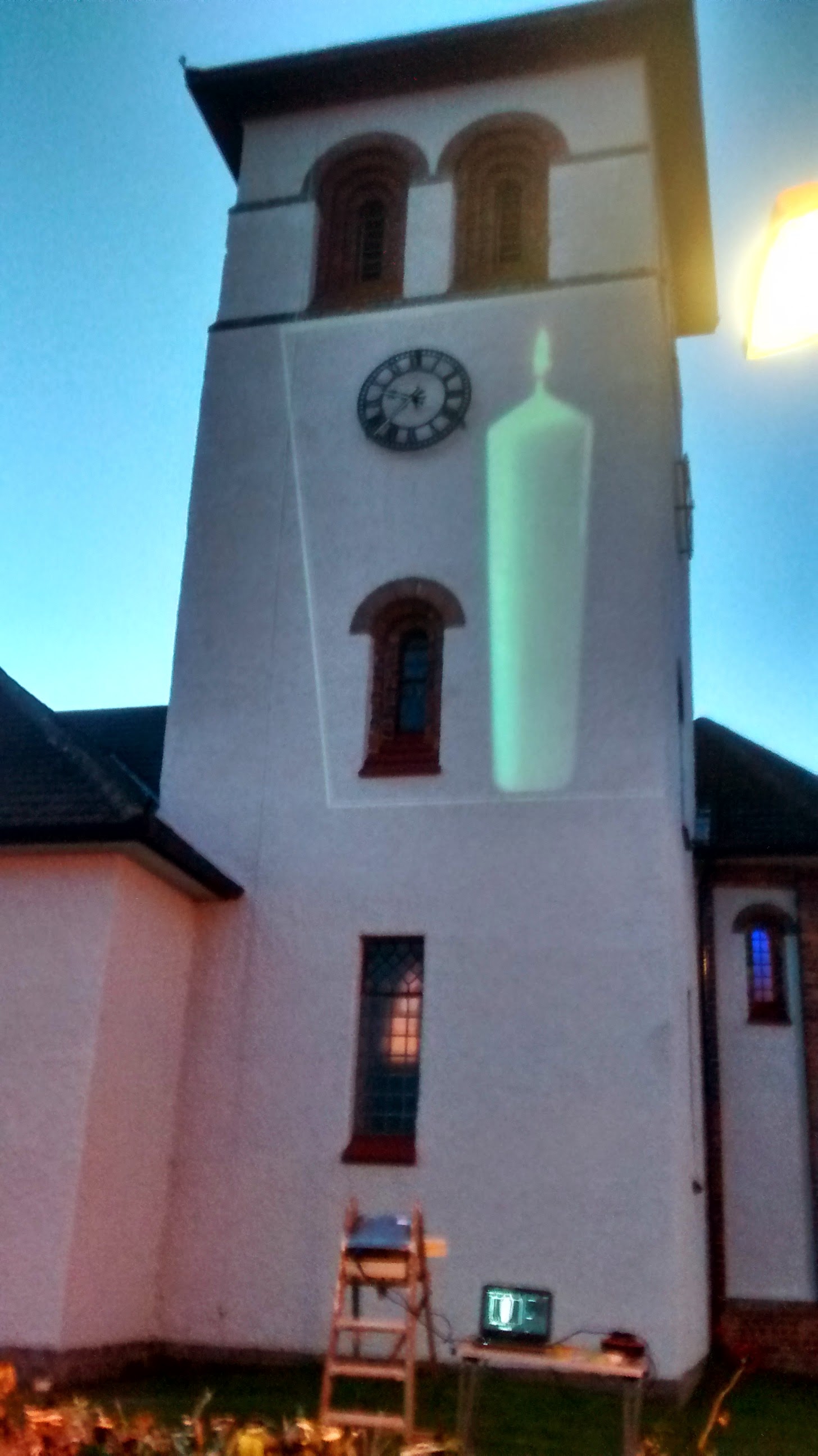 As I arrive at St. Andrew’s Church, a group of late-teenaged girls in munitions worker style costumes practice songs, and a man sets up a projector by the modern-built church tower, launching the image of a candle just beneath the steeple. He brings over another man with military connections when I ask about places I might camp. Some locals chip in with contrary suggestions and, finally, one of the Devil’s porridge volunteers who I’d talked to drives over and, from his window, suggests another location. All are near enough Gretna, but there’s now four places to scout. I’ll worry about it later, and join this friendly group of people into the Church.