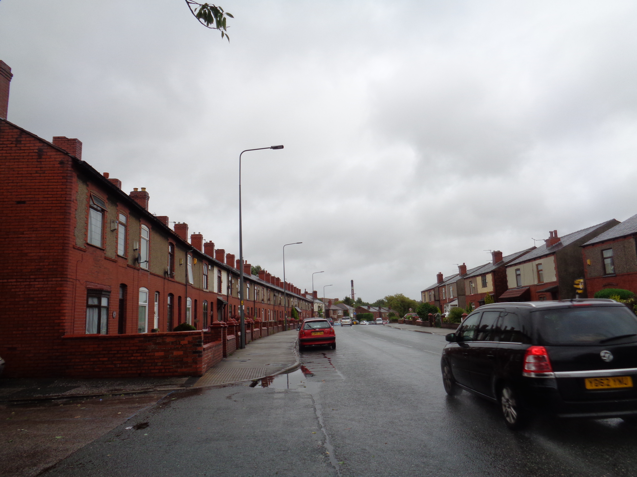 I talk to a woman who points me to Wigan Pier, though when pushed, more clearly suggests just leaving the town to explore the more beautiful countryside. I speak to a man who has lived here for thirty-one years, and who tells me about meeting his wife in a local club, of his children, his work in the Wirral, and of the dangers of going out drinking at night. Petty violence is a problem, he reports. But I don’t get any feel for low-level aggression here. As I stand by the canal, an obscene rainstorm appears and attacks the ground with everything it can muster. Fierce gales form, fortunately in a south-easterly direction, and after taking cover in Dominos, I decide to brave it out.