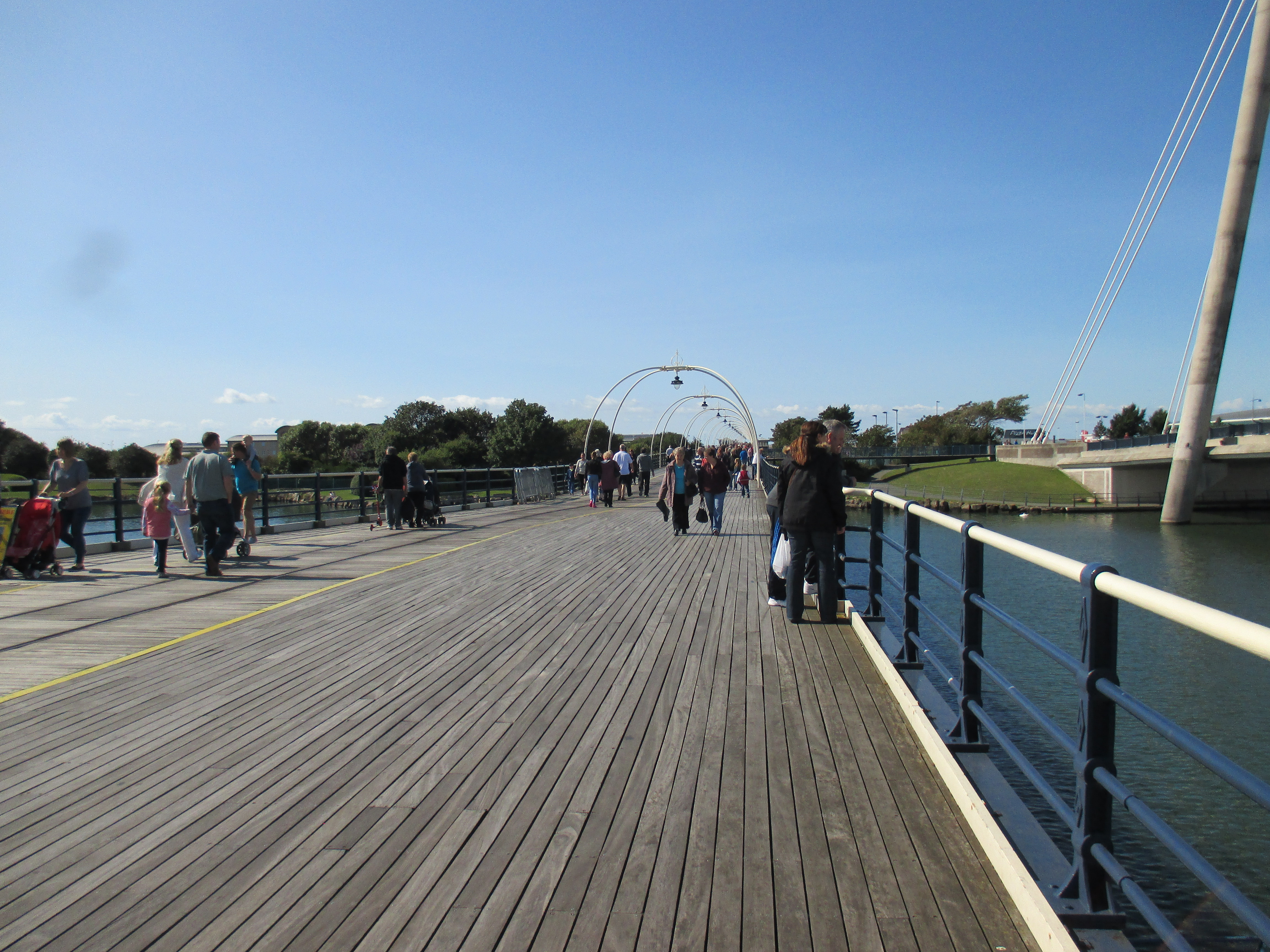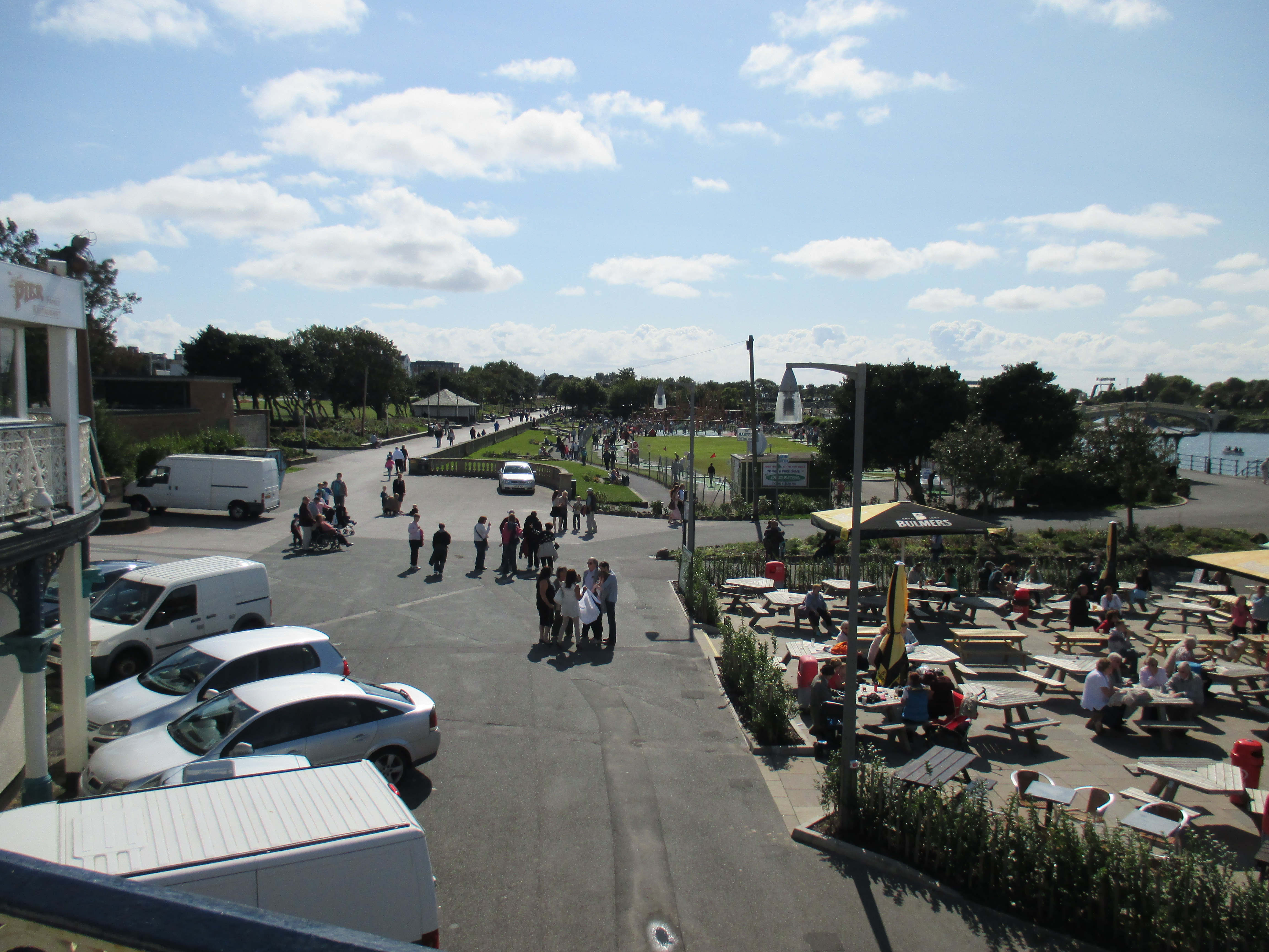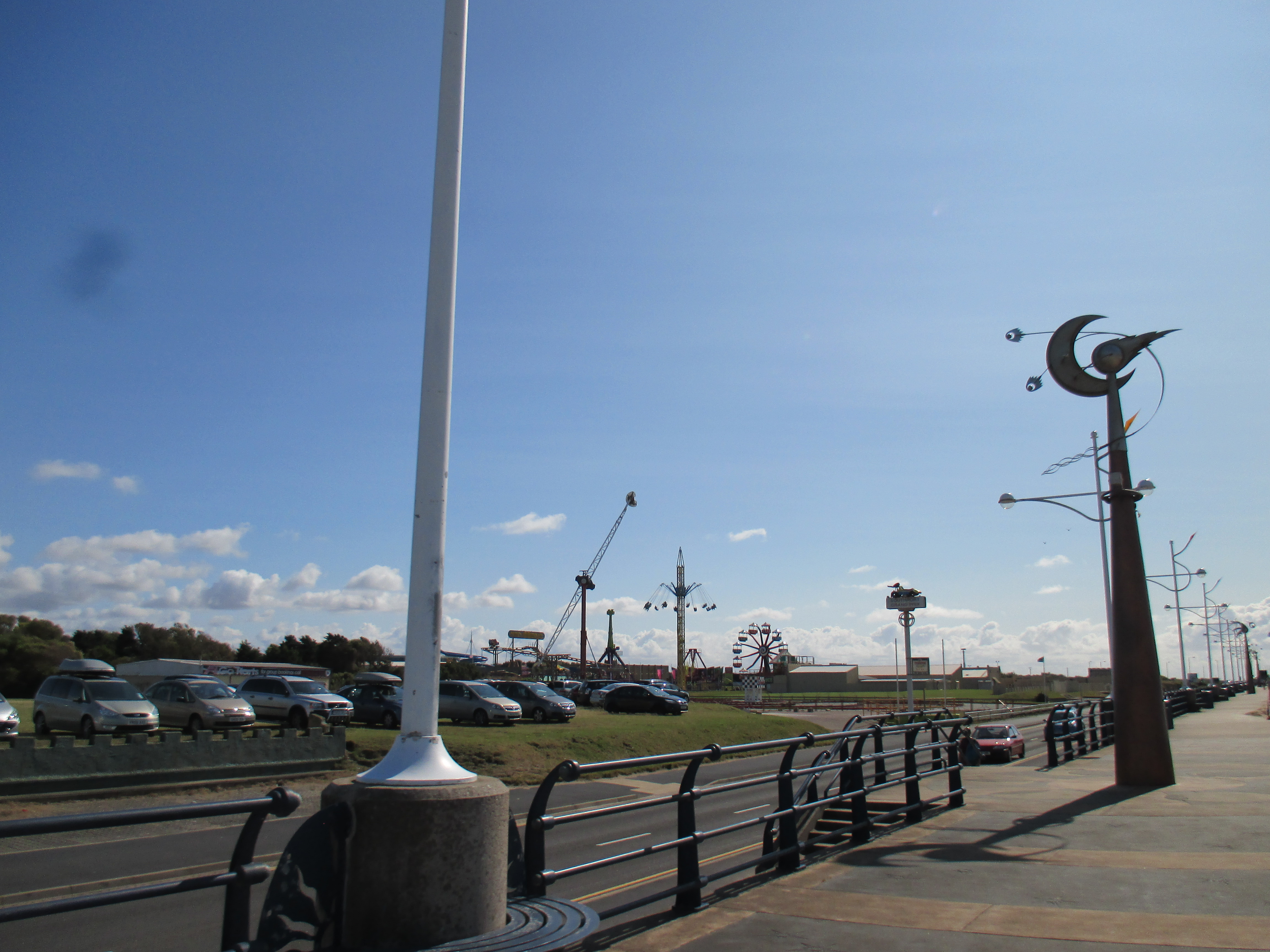 I pass a few small amusements arcades, places selling bargain offer mushy peas and chips, and ice-cream desks in abundance. But the main development’s by the sea. There’s the obligatory overpriced miniature train, as well as a large warehouse-type building on the sea-front full of noisy penny machines and one-armed bandits that optimistically brands itself ‘Funland’. A long timber boardwalk then passes over a waterside bar where a luckless crooner burbles through ‘I’m a Believer’, ‘Hard Day’s Night’ and the curiously tasteless ‘Summer Holiday’ whilst a pre-recorded casio keyboard bounces in the background. Old dears sway and shake their ankles in unison. Further up the boardwalk is a bumpy field passing it off as a golf-course, and a small skate park where a large family of orthodox Jewish holiday-makers gaze at the zippy teenage lads with total fascination. There’s a boating lake where rowboats drift gently around, their bored male drivers exploring the contours of the lake whilst their female partners talk enthusiastically about topics out of earshot.