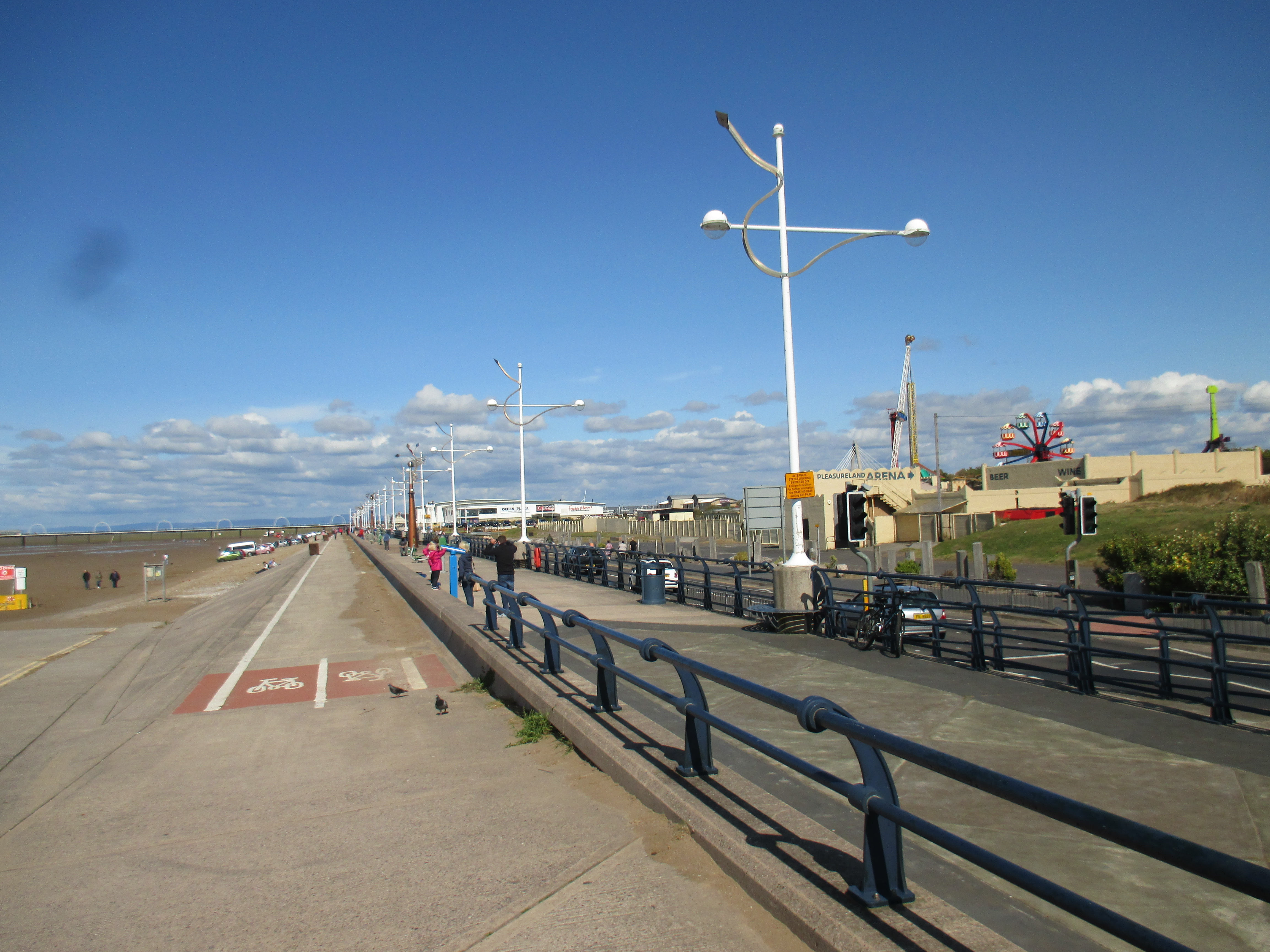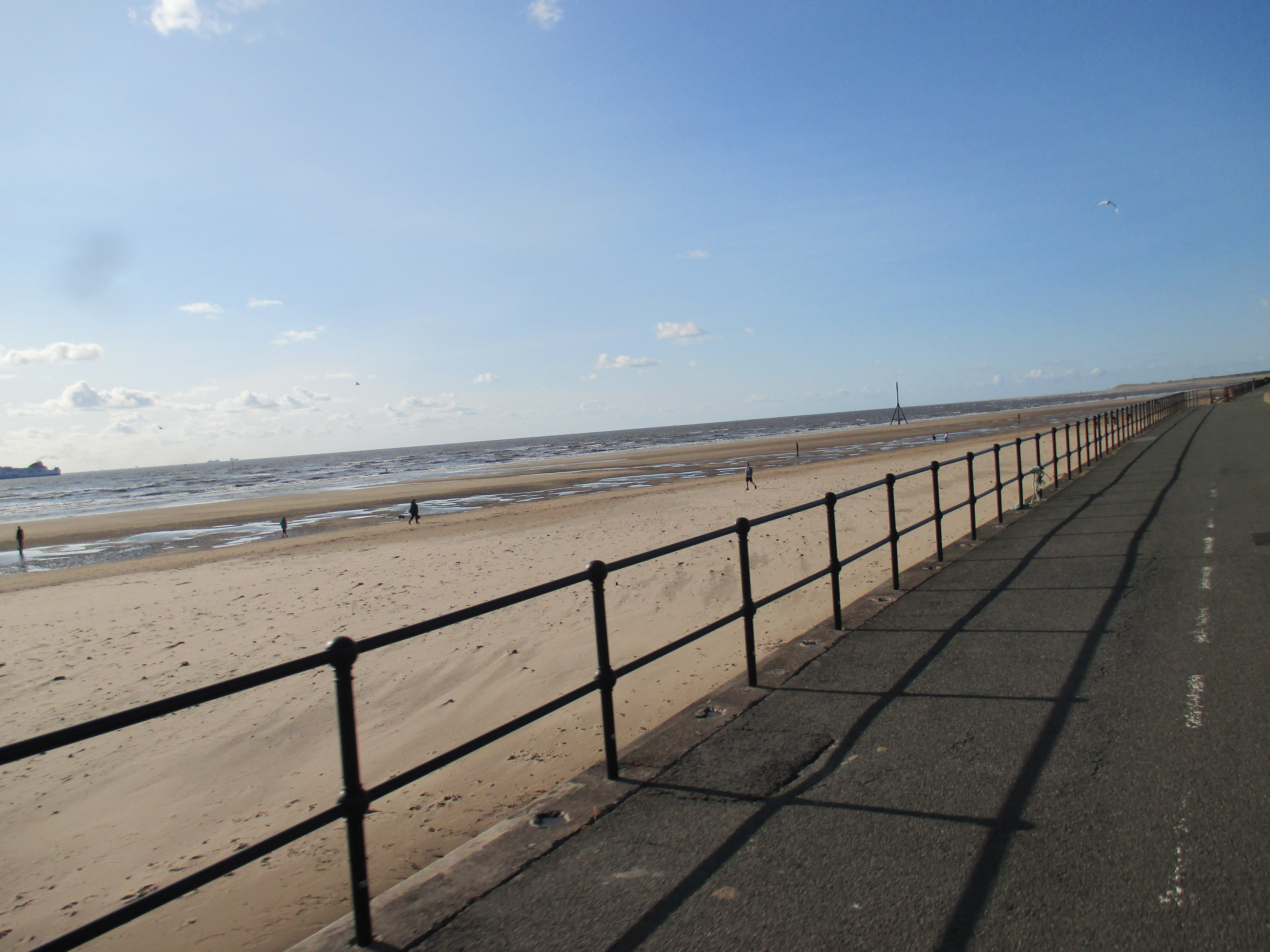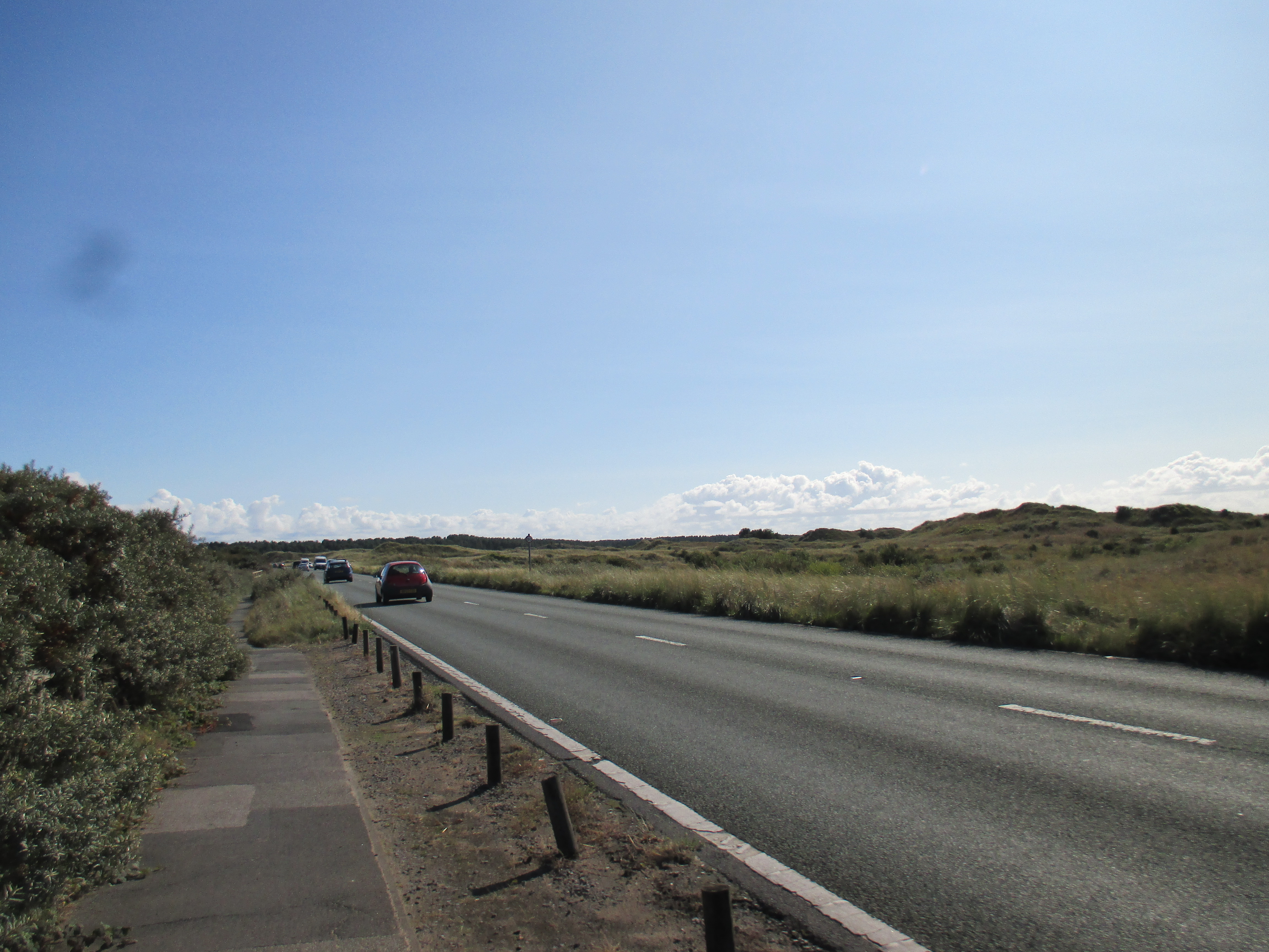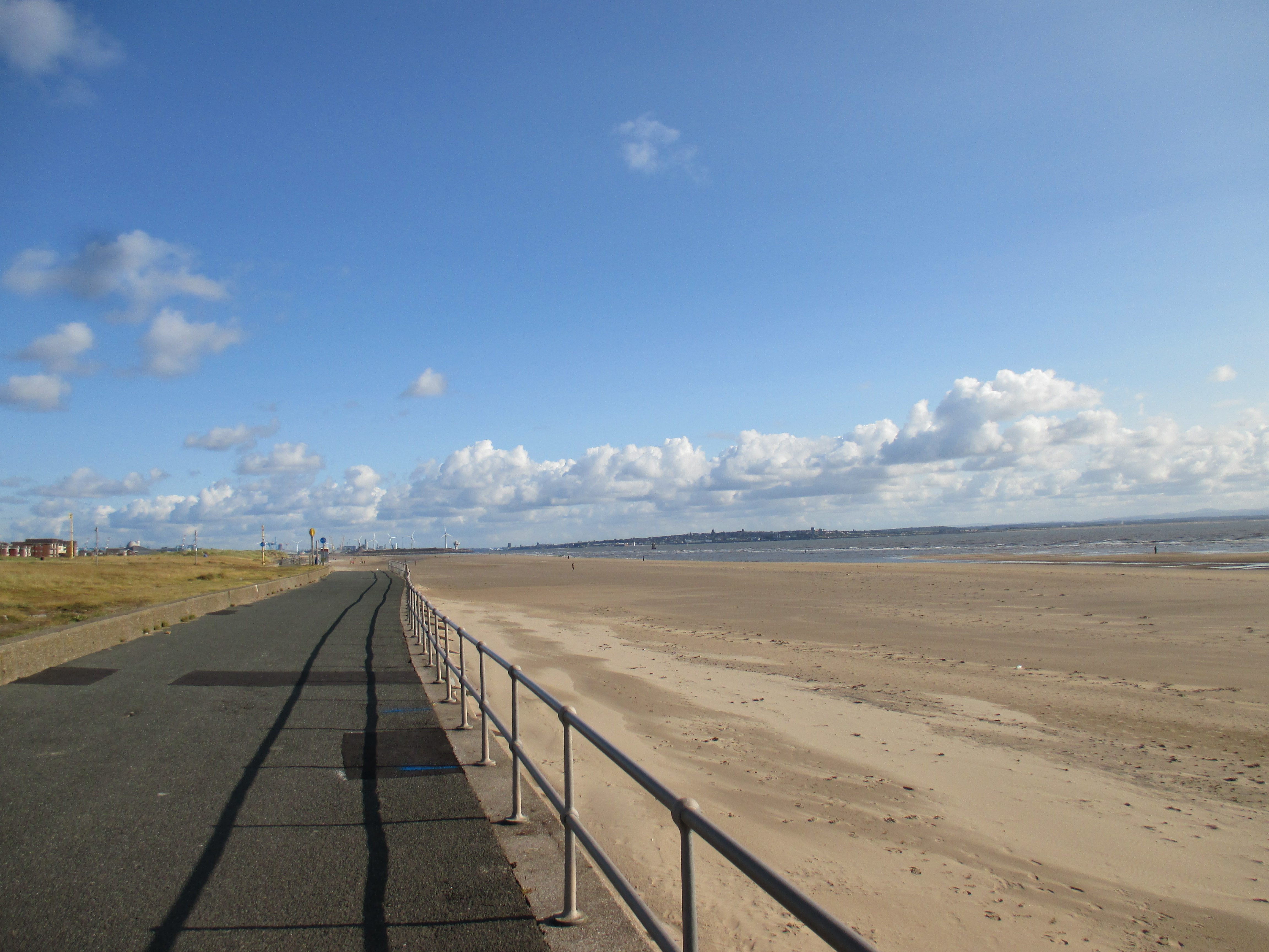 Further up the pier is the Ocean Plaza, an utterly shite retail park that brands itself ‘eat – shop – play’, with a McDonalds, KFC, Premier Inn and various chain restaurants to satisfy such desires. Demolish all this silliness and the place would be lovely, but it’s already good enough for me, and with this spurt of unusually fine weather, very enjoyable. I sit by and watch the world whilst eating muesli and water, the fodder that now sustains me for most of the day. There’s a lovely ride along the promenade after, with long golden sands to my right where children make sandcastles, and a cheerily-populous funfair to my left. The promenade disappears into a road that rides through the Ainsdale sand dunes, a delightful space where nature has been allowed to recuperate, thick and yellowy grasses jutting up through undulating hills which the coastal road neatly cuts through like a knife through warm butter. Southport marks the Merseyside boundary, I think, though the accent’s subtle.