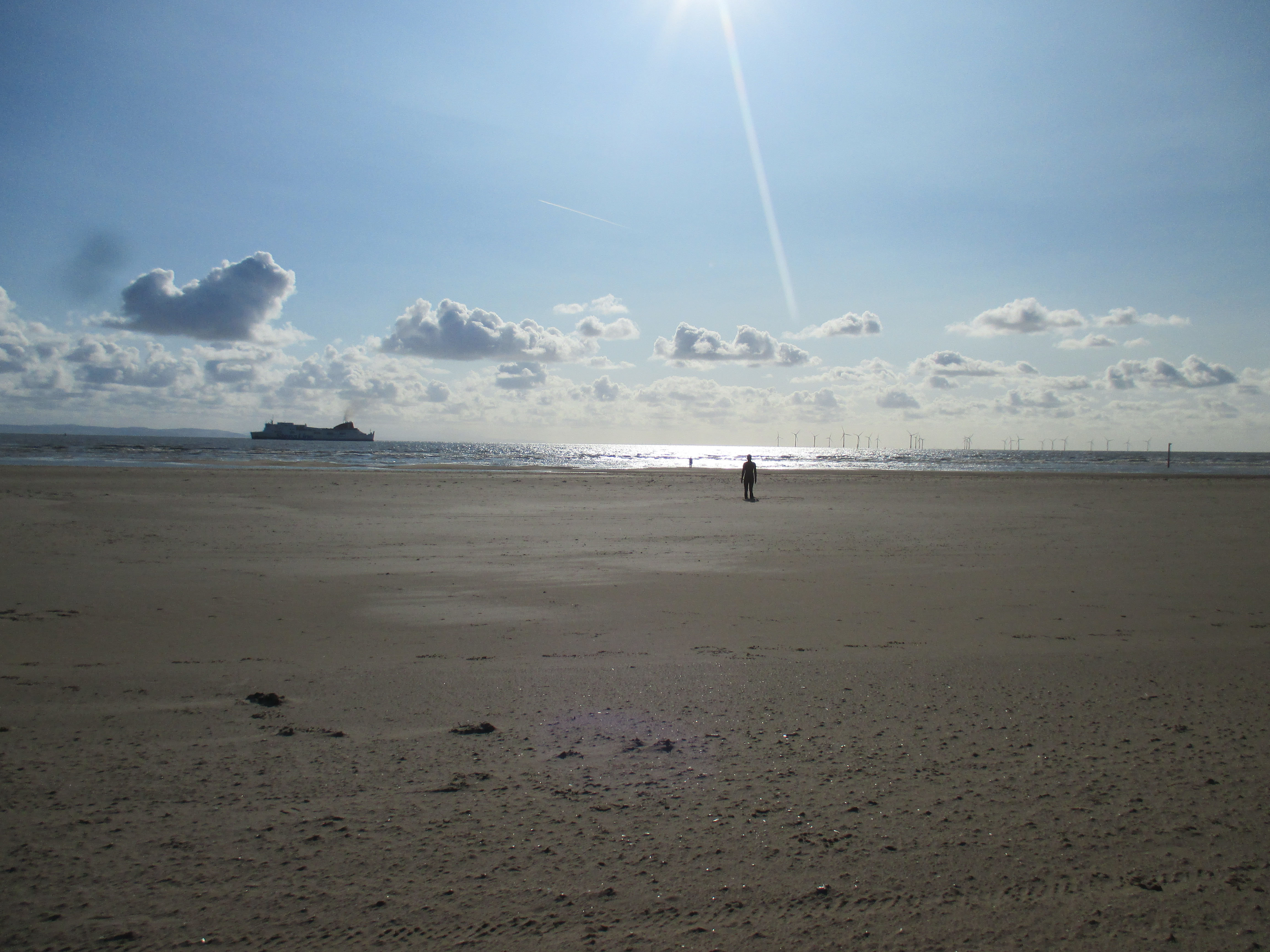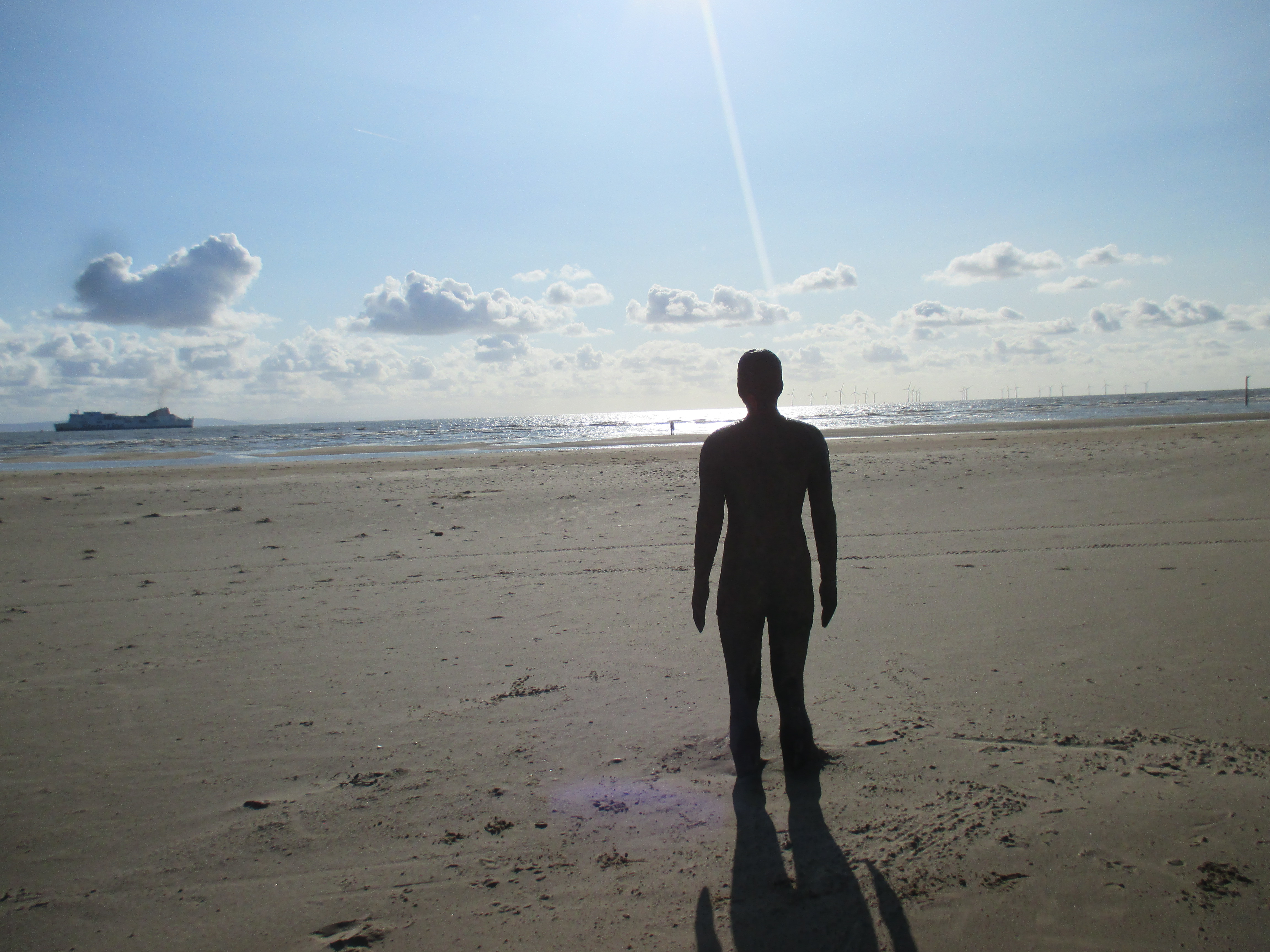 Eventually I cross another part of the Sefton dunes and reach Hightown, then Crosby, the suburbs now looping together to form a consistent whole like chicken wire. The accent’s now tighter, rising up and down, singing out its extended vowels. This is scouse, the song of the Mersey. It’s lovely hearing it, so distinct from its Lancashire neighbours, so harsh with their consonants and flat in their elocution. Someone’s taken that that Lancs accent and blended it with Irish and Welsh. On Crosby beach there are a series of a hundred cast-iron figures standing alone, gazing out into the sea. The sea has reached some, partially submerging them; others stand on the beach. Approaching them, they are surprisingly small, and stand with blank expressions, already rusted. Someone’s humanised one with a winner medallion round its neck. All around me are dog-walkers pacing up the sand, and the port of Liverpool in the distance, gulls crying out in the late afternoon sun.