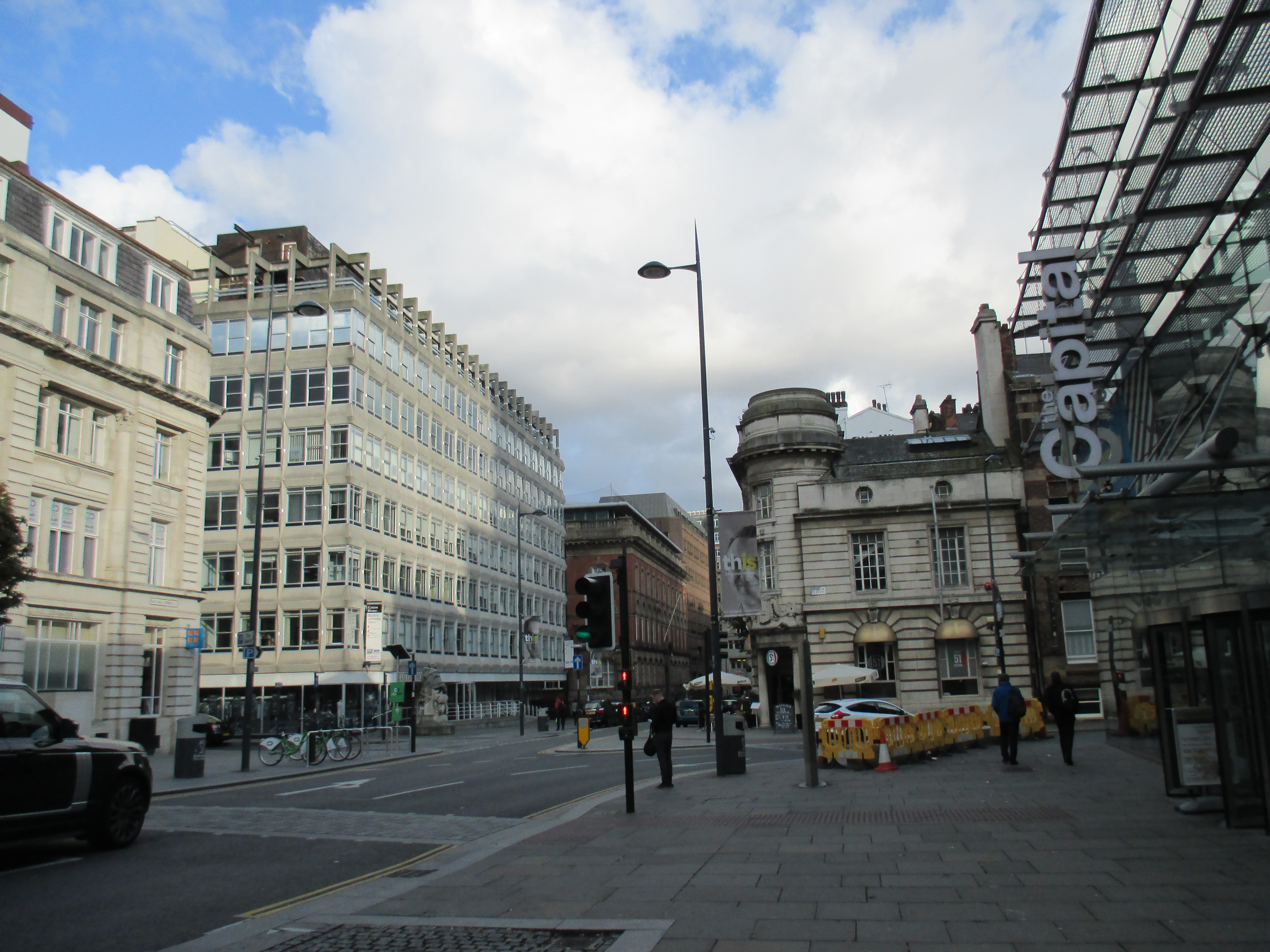 It’s a great ride into the centre of Liverpool, which looks like a bar graph of marine-coloured glass structures. My road threads into what appears to be the financial district, by the Capital building and the passport office, and various corporate looking buildings nearby. Further in is Liverpool’s centre, which already seems strikingly small and compact. Is this it, I wonder, for a city that occupies such a large cultural and political space in the UK? I have two days to find out.