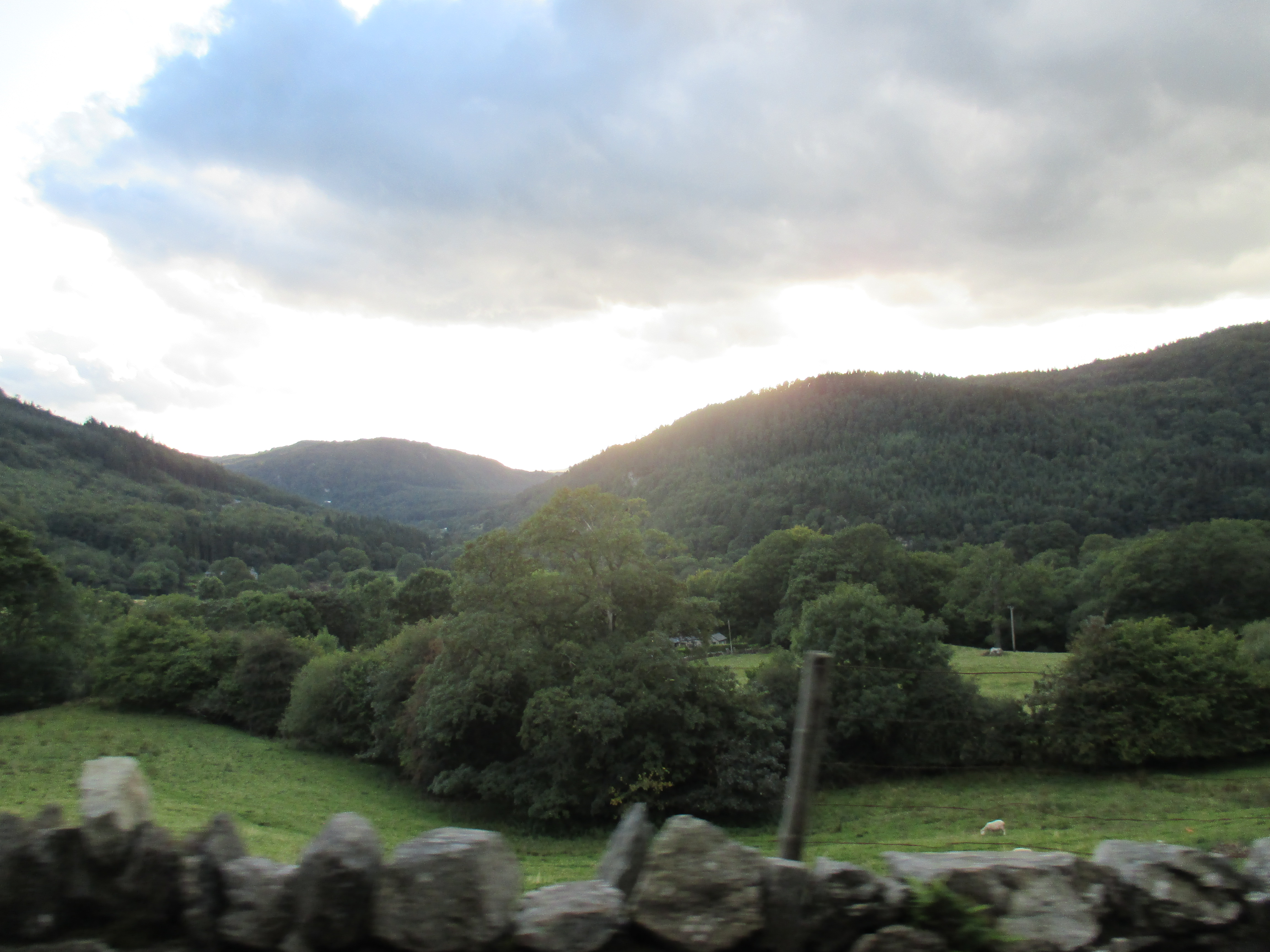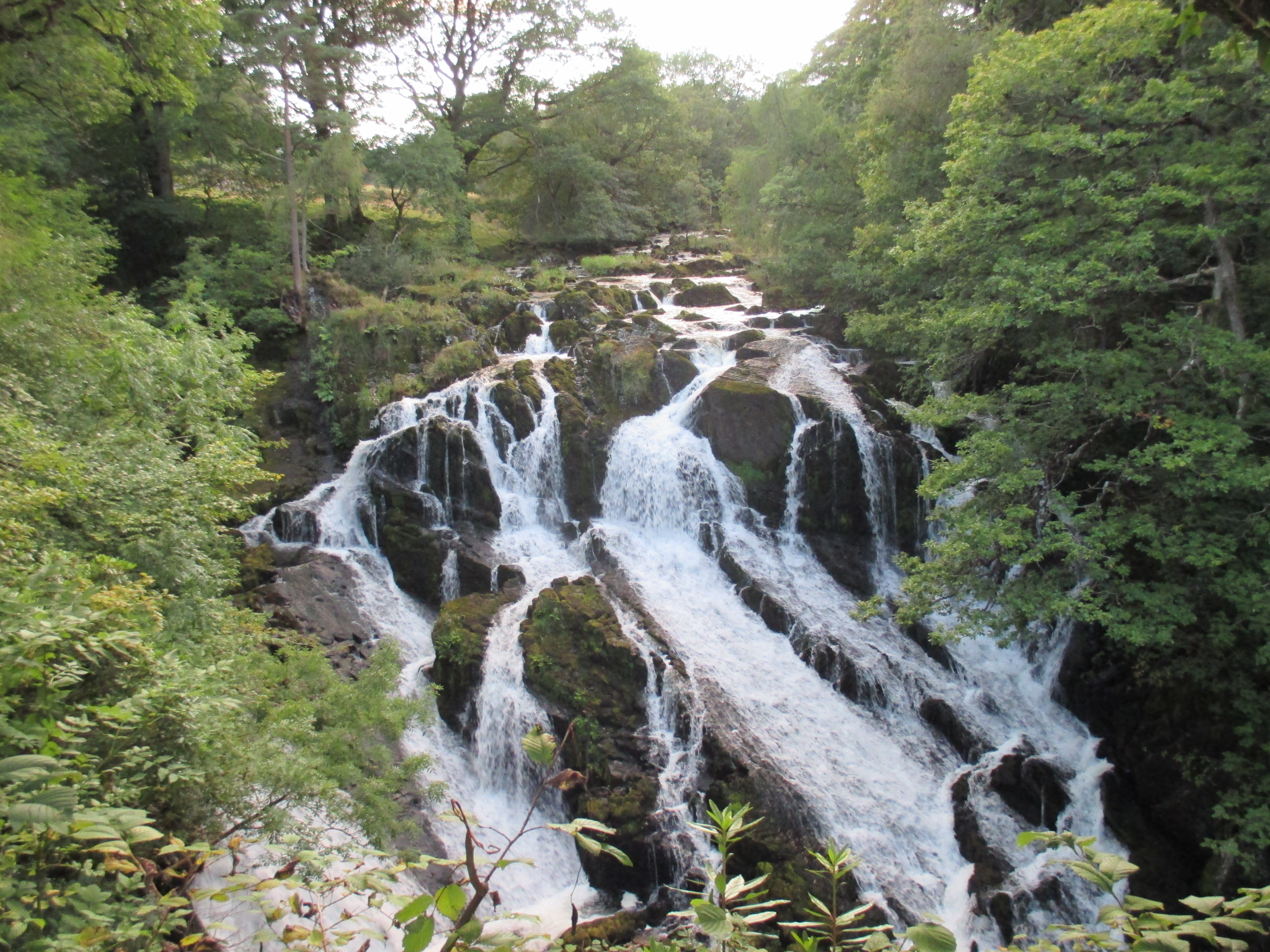 As I ride up into the Snowdonia countryside the landscape becomes increasingly wonderful and beautiful, and I am very glad that I’ve taken this route instead of the coast. The sun’s held out, illuminating the late afternoon clouds with gilded edges whose rays confer a glory and splendour on the sleepy fields, forests and cattle that I pass along. A dark and jagged mountain line is beginning to grow in prominence along the horizon. There are few villages to stop in, but the ride is a pleasure. I cycle on, the road ascending up and up. I take a break at the Conwy waterfalls, which seems to belong not to the Welsh people but to some private owner. There’s a large security gate and turnstile, admission operated by a pound coin deposit. I watch a couple of rascals sneak under the gate, the small size of children having its benefits in such situations.