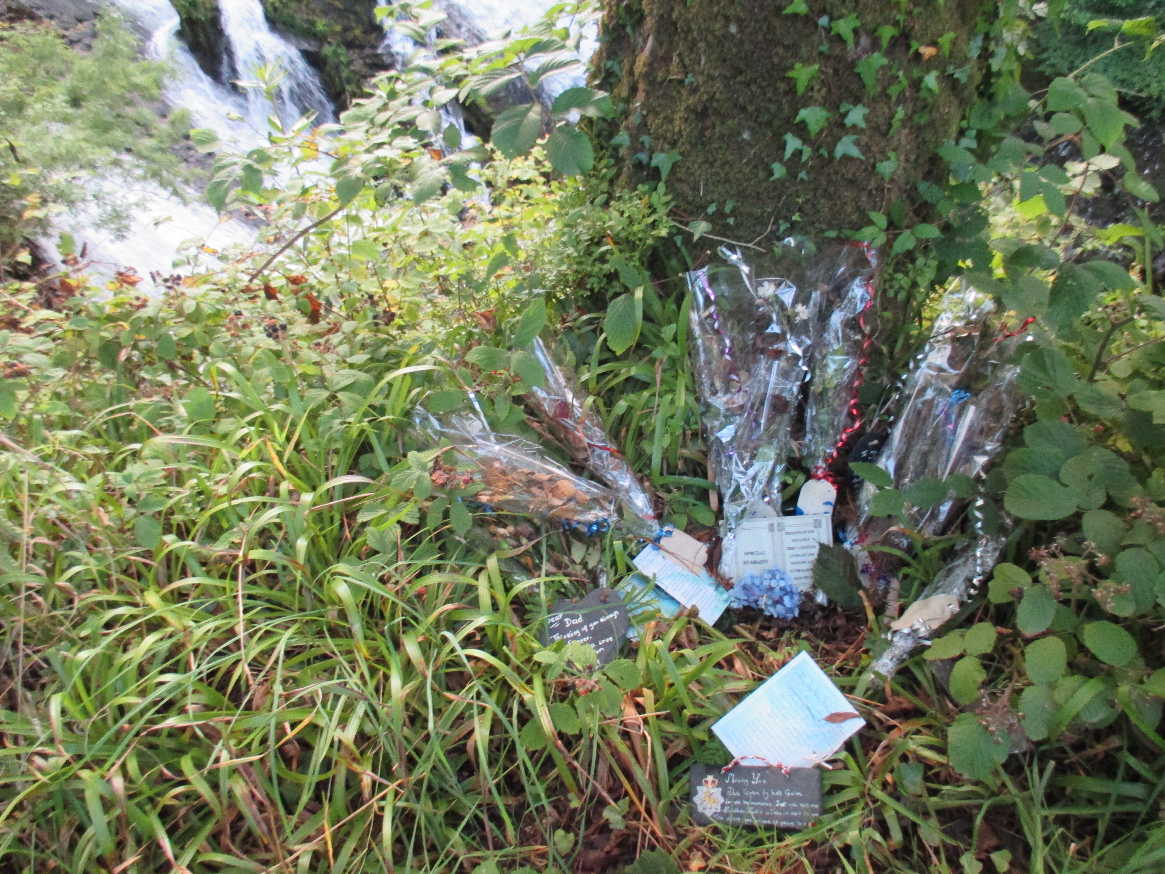 I cycle out of Betwys for around a mile, reaching the Swallow Falls further west. Entrance is again guarded by a large and imposing security fence with a football ground turnstile. £1.50 secures admission into a gushing waterfall that my weary impressions drift under, caught in the gaze, thinking awhile about the possibility of falling in and under. There are memorial flowers here to someone’s lost dad. Indian tourists sit on benches by the waterfall and talk quietly in the early evening.