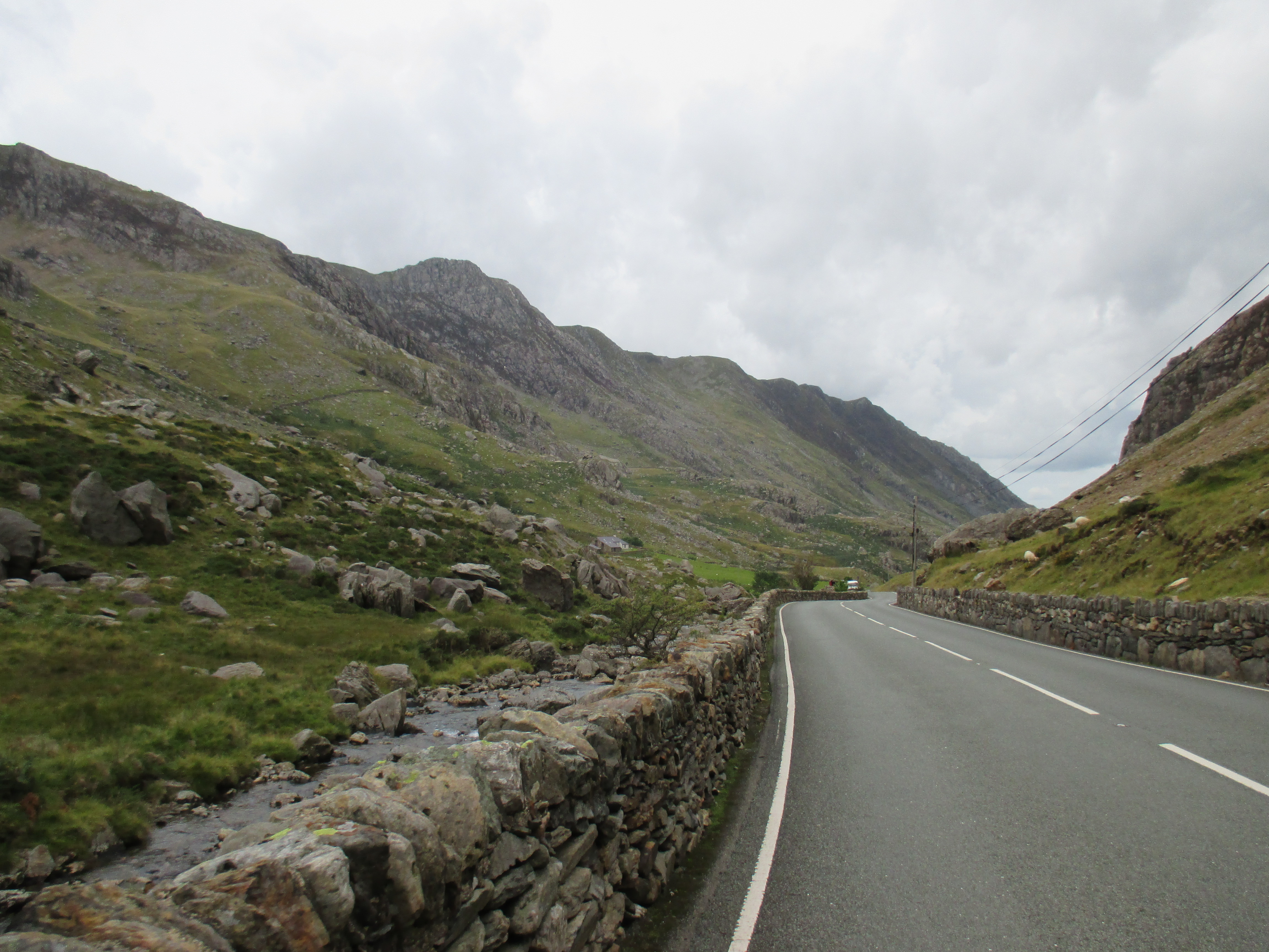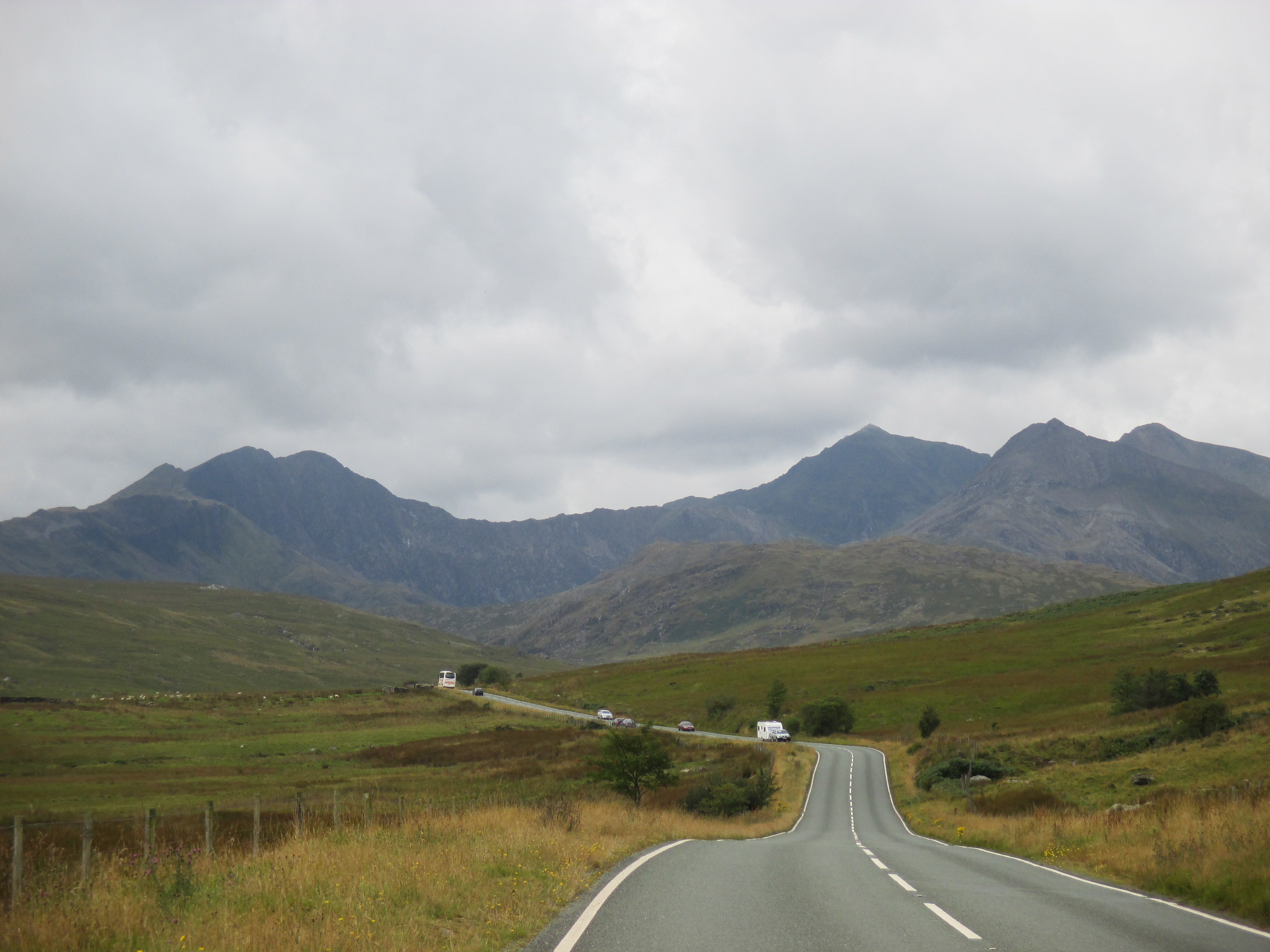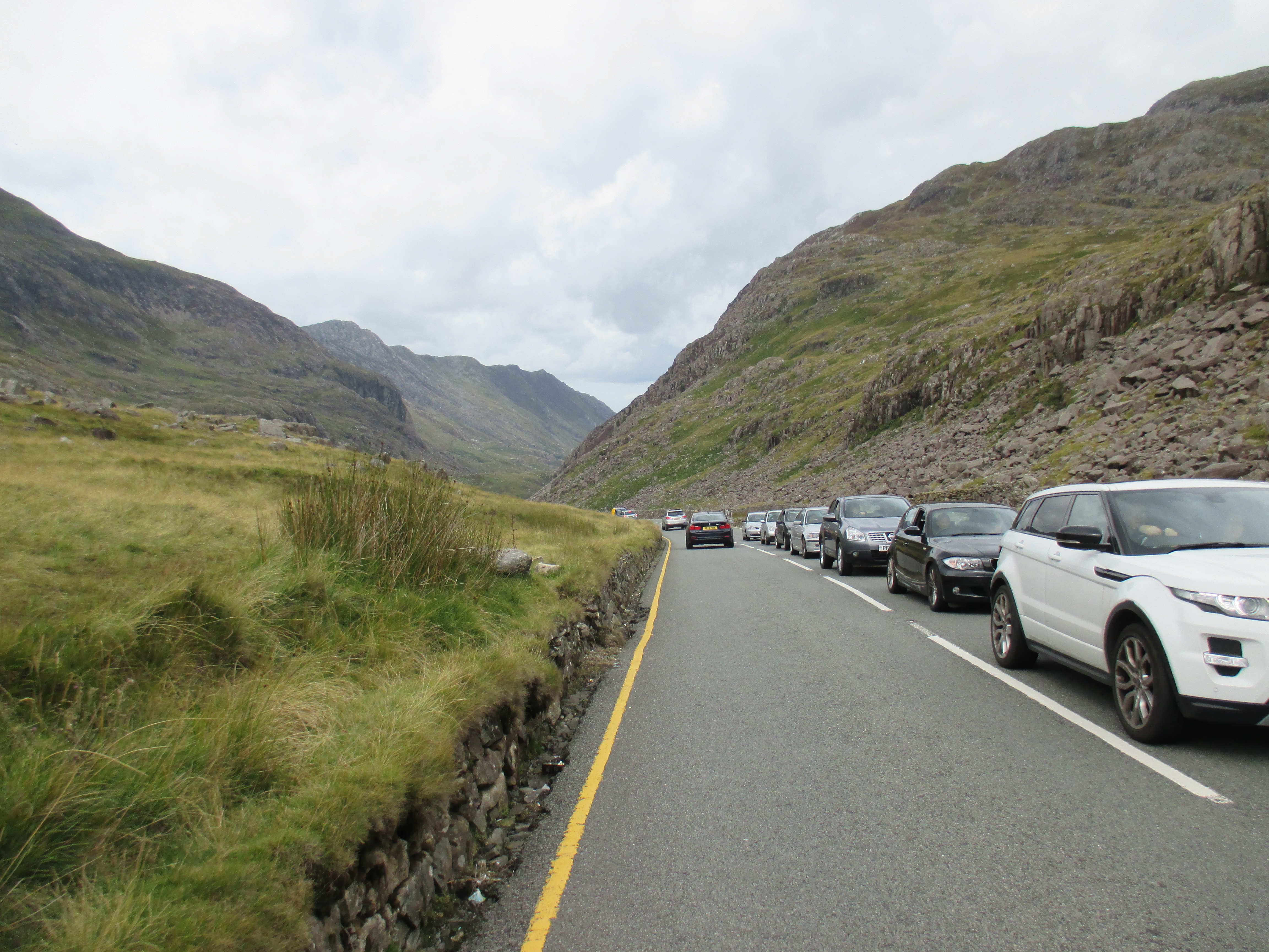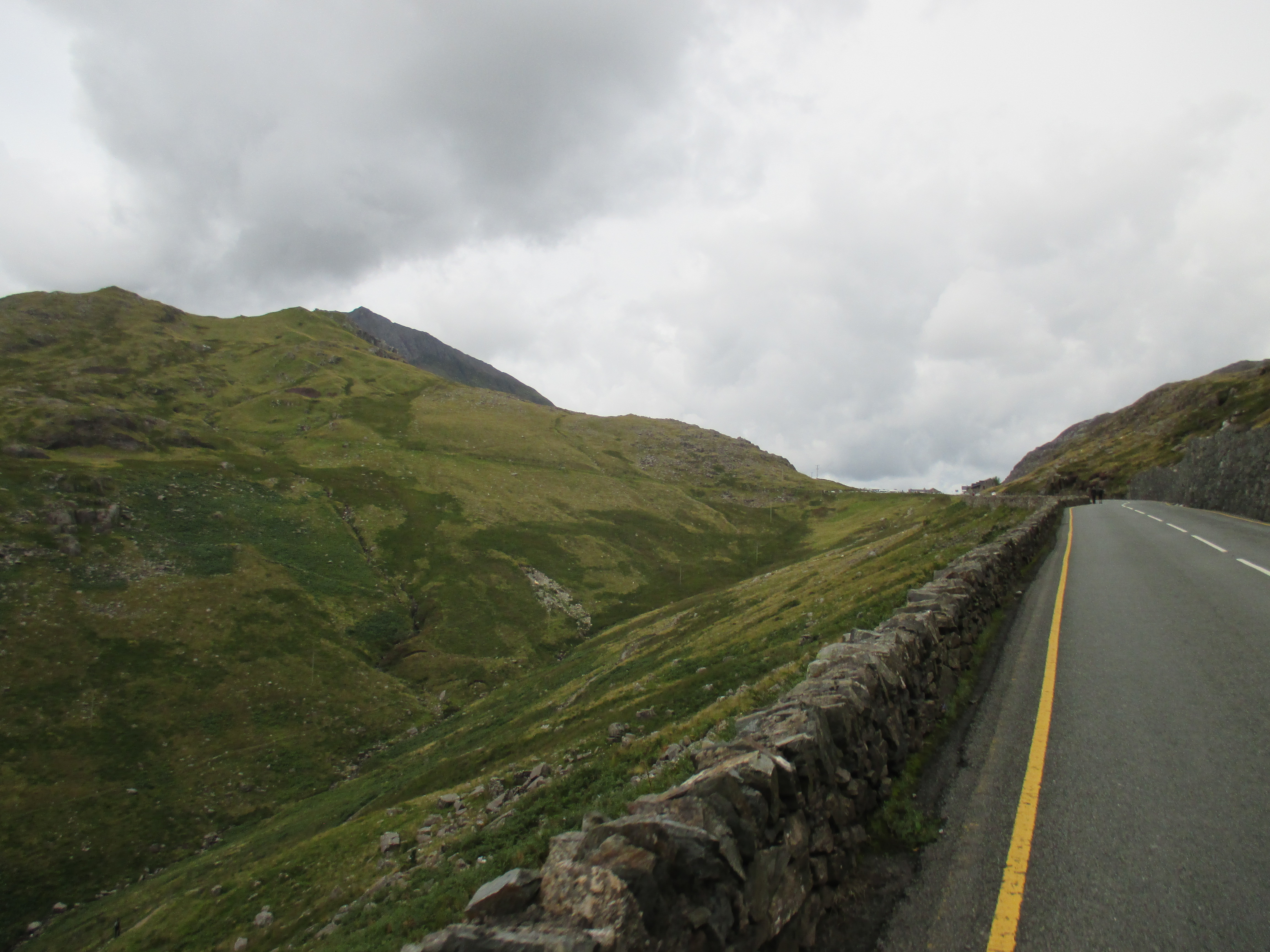 Rivers splay everywhere across this enchanted landscape, taking a form like the spindly lines of human blood capillaries, flowing down into the valleys. The road is steep and busy with cars taking their passengers up to one of Snowdon’s six mountain trails. The pedals require some stamping and standing to continue their operation up these heights, but I’m just in love with the rugged rocks, heather hillsides and impressions of serenity and peace I drink up along the road to Snowdon itself. I start to pass hikers beginning the long and relatively gentle ascent up. The road forks again, one path heading down to Beddgelert and lined with parked cars; another ascending up towards the clouds. Here’s my route. I’m strangely excited by the prospect ahead. With difficult and laborious movements, I huff up to Pen-y-Pass, the peak wherein some climb a shorter route to Snowdon. The views of the surrounding valleys are just delightful, sufficient to forgive the plague of cars and buses blocking the roads either way.