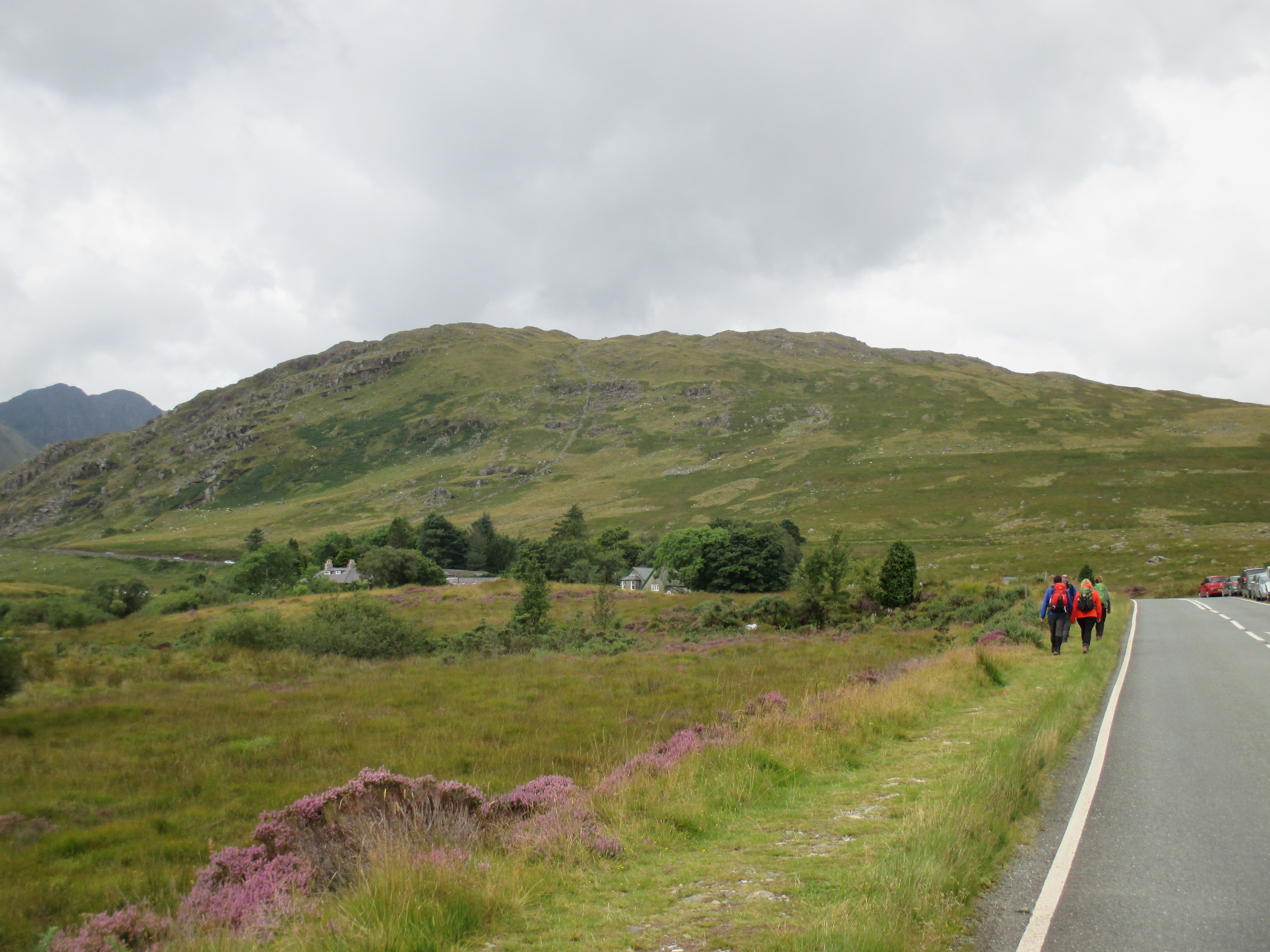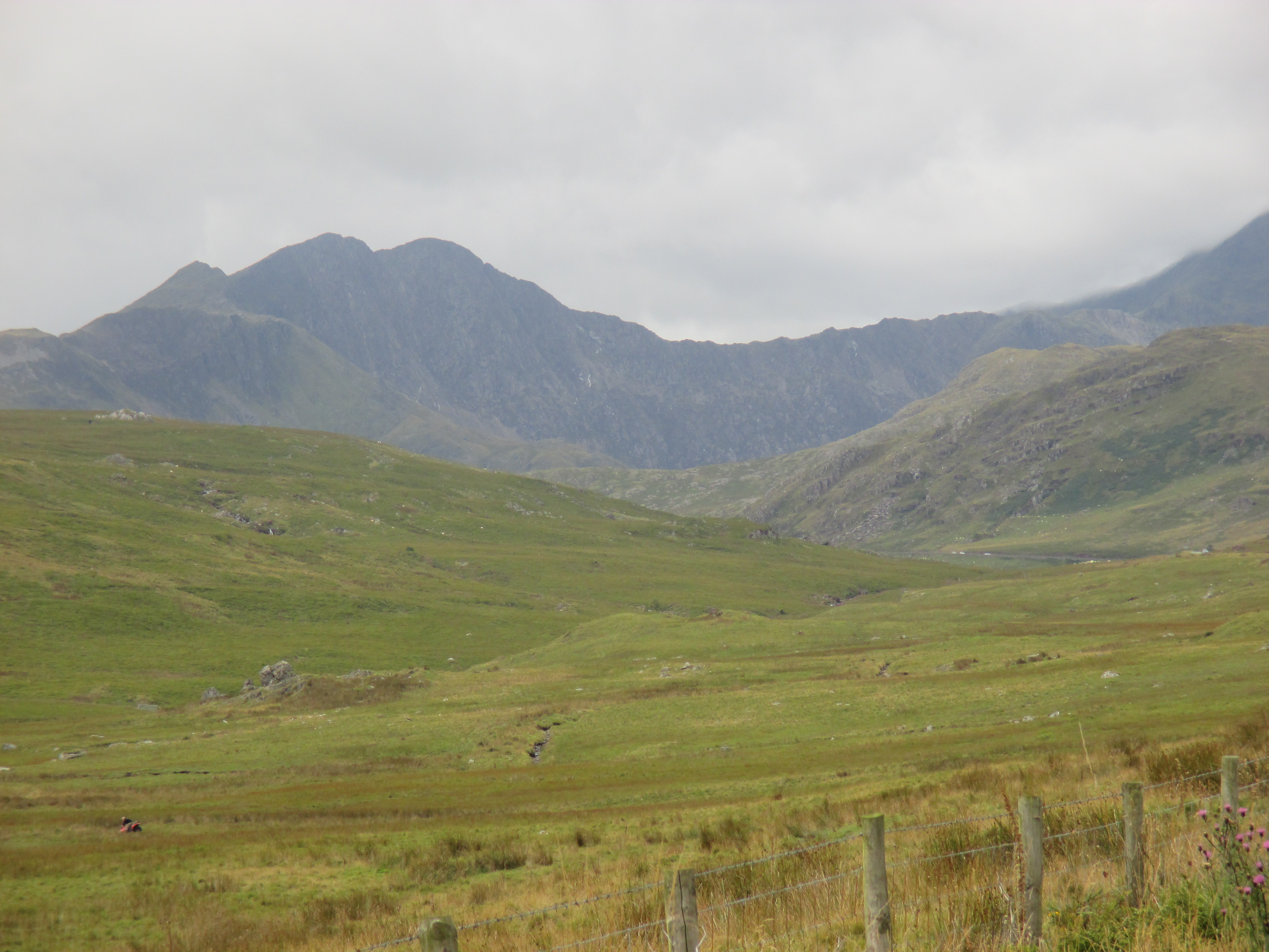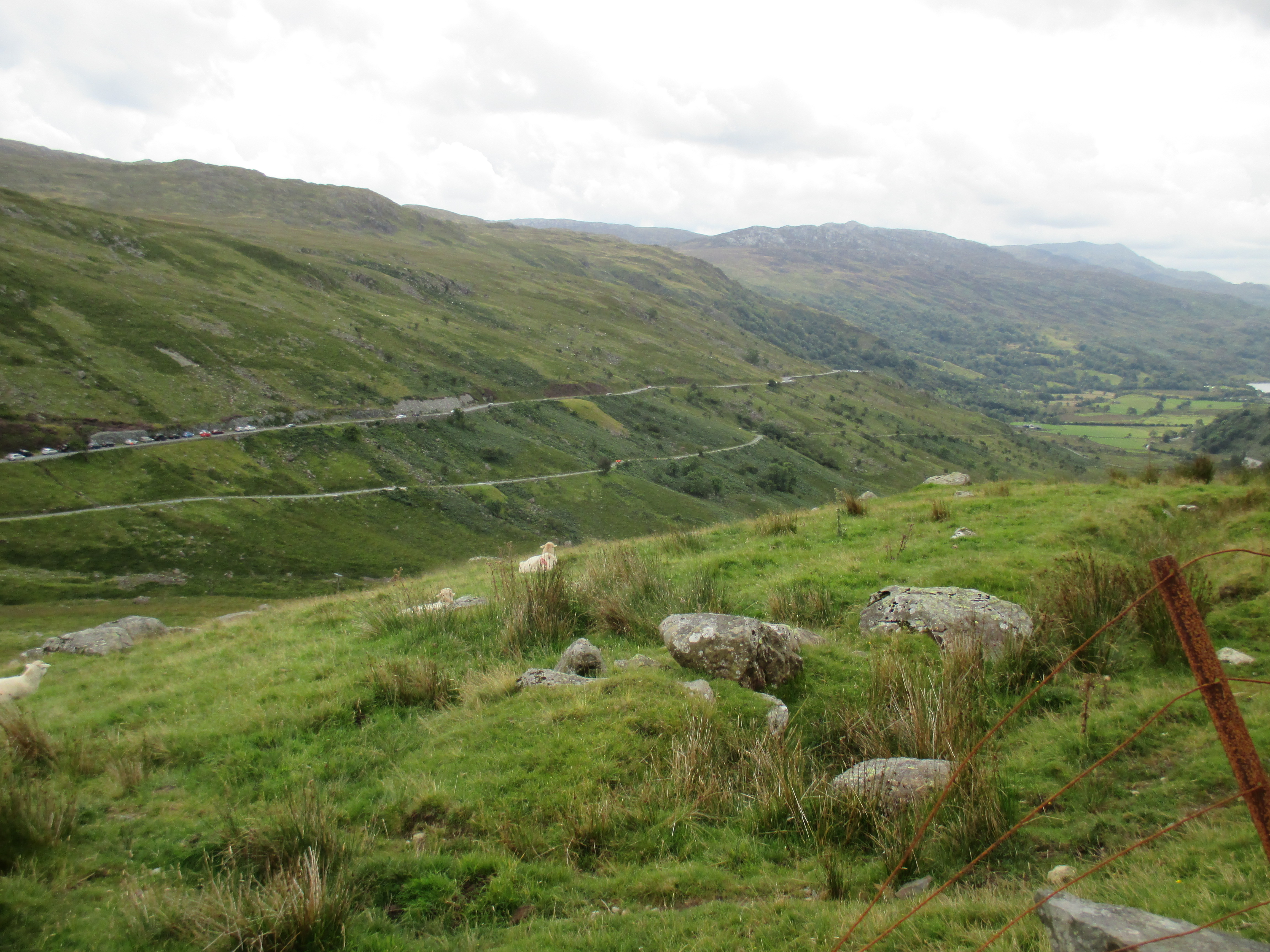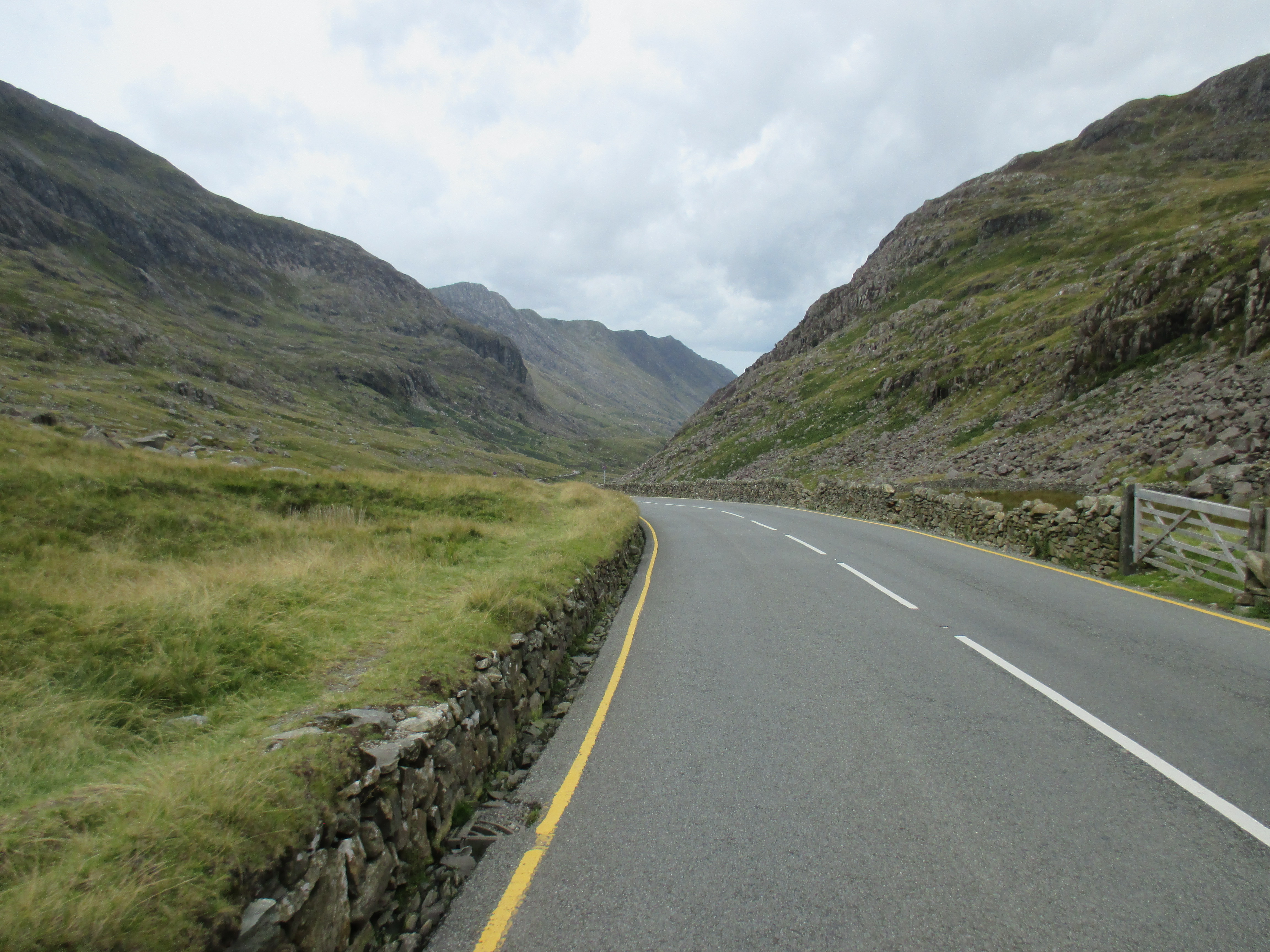 Rivers splay everywhere across this enchanted landscape, taking a form like the spindly lines of human blood capillaries, flowing down into the valleys. The road is steep and busy with cars taking their passengers up to one of Snowdon’s six mountain trails. The pedals require some stamping and standing to continue their operation up these heights, but I’m just in love with the rugged rocks, heather hillsides and impressions of serenity and peace I drink up along the road to Snowdon itself. I start to pass hikers beginning the long and relatively gentle ascent up. The road forks again, one path heading down to Beddgelert and lined with parked cars; another ascending up towards the clouds. Here’s my route. I’m strangely excited by the prospect ahead. With difficult and laborious movements, I huff up to Pen-y-Pass, the peak wherein some climb a shorter route to Snowdon. The views of the surrounding valleys are just delightful, sufficient to forgive the plague of cars and buses blocking the roads either way.