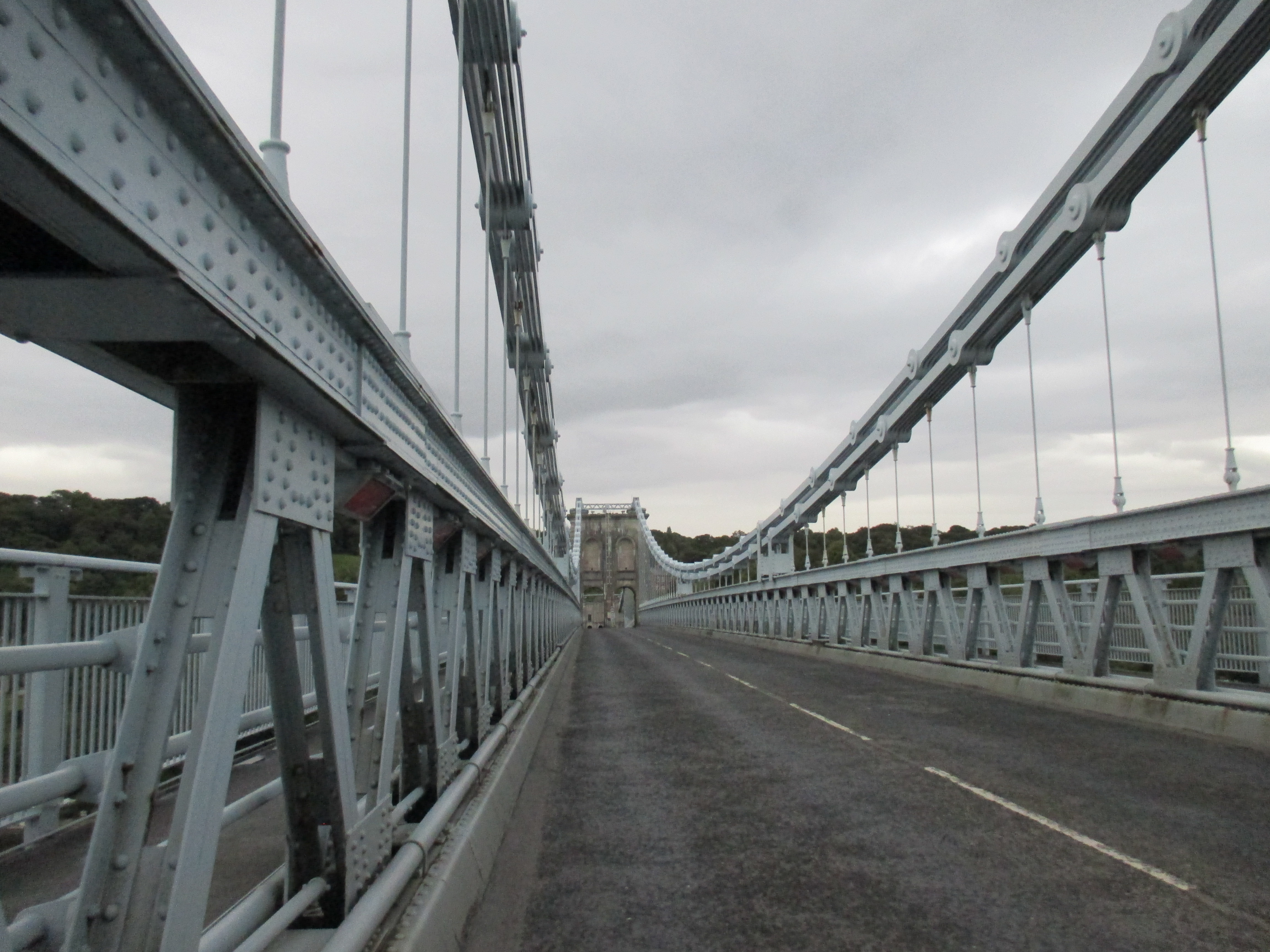 I battle with the traffic on the road to Holyhead, most heading for the ferry to Ireland. The scene opens up at Britannia Bridge, crossing the Menai Strait into Anglesey. It was originally built for trains but an accidental fire set by two lads forced the bridge to be reconstructed for road traffic too back in 1970. Like much of that era, function’s the thing, and there are no concessions to beauty or pleasure in its design. On the other side I find a mediocre hotel and a toilet where the remainder of my stomach disappears. I can easily manage cycling sixty or seventy miles the next day after a few beers, but combine wine and all else in and my body struggles to pay the bill.