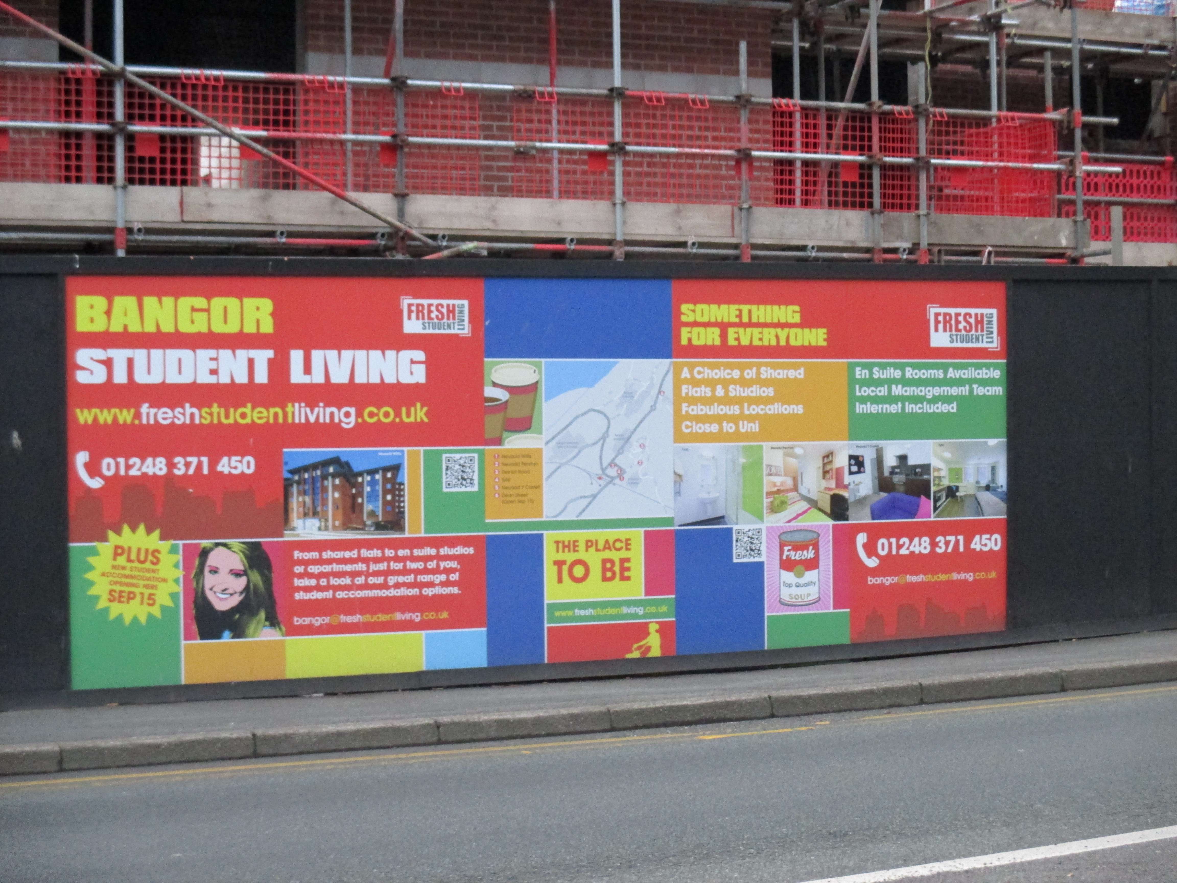 There are some curious buildings along the road back to the Menai Bridge, Anglesey’s other crossing to the Welsh mainland – an utterly misplaced high-rise apartment block made of some kind of concrete, followed by the gloriously pretentious Chateau Rhianfu, a large mansion overlooking the Menai with a palisade of priapic chimneys. I cycle through the small but cheery town of Menai Bridge, then head over the suspension bridge back onto the mainland. A little further up a hill and I reach the outskirts of Bangor, a town that’s both small and unevenly developed, defined by its university buildings, large supermarkets, and utterly undersized town centre. I’m staying with Simon, who has kindly offered to host me through the Couchsurfing website. I find his place in the western part of the small town, off its old high street, and we quickly get talking.
