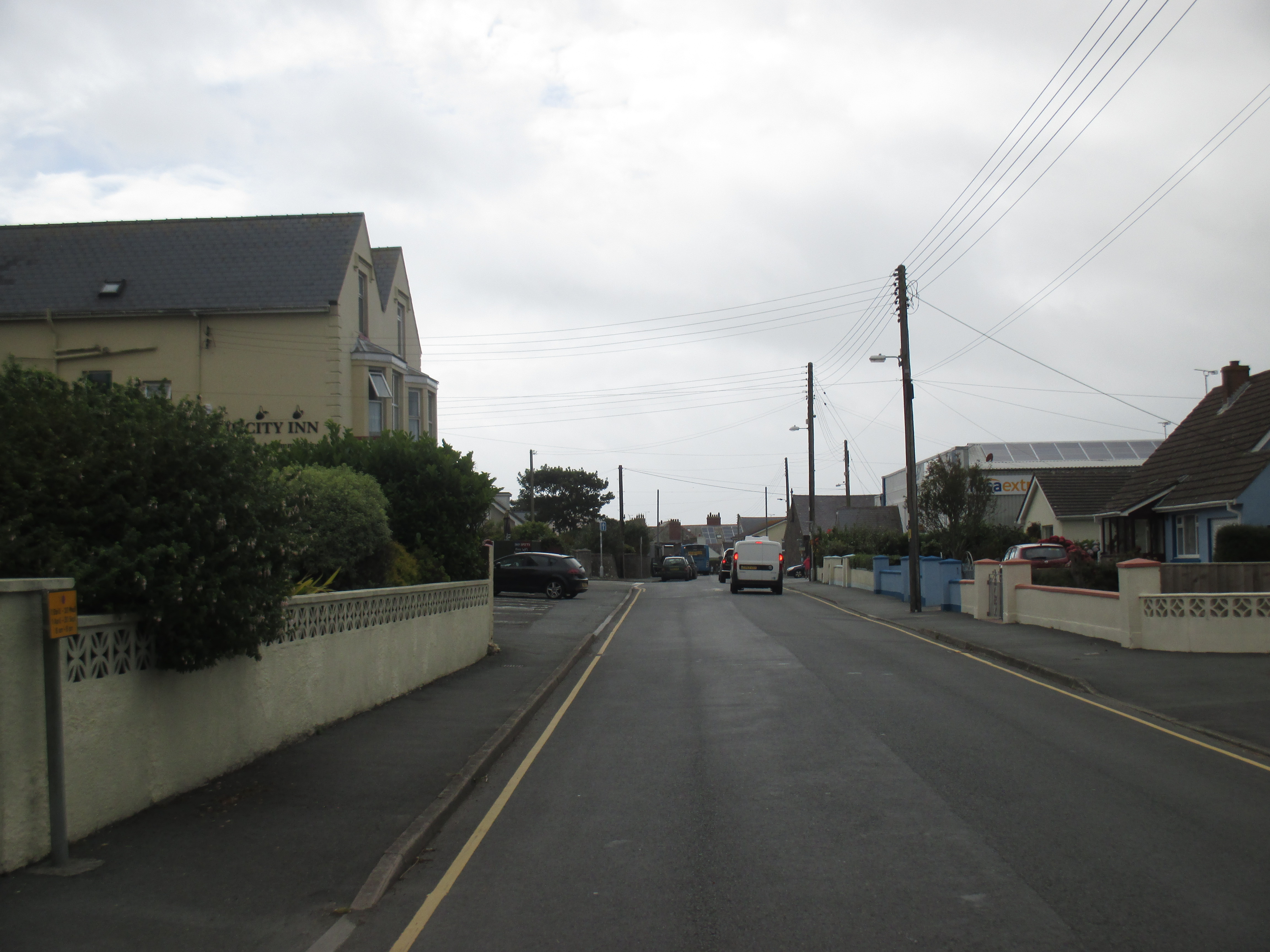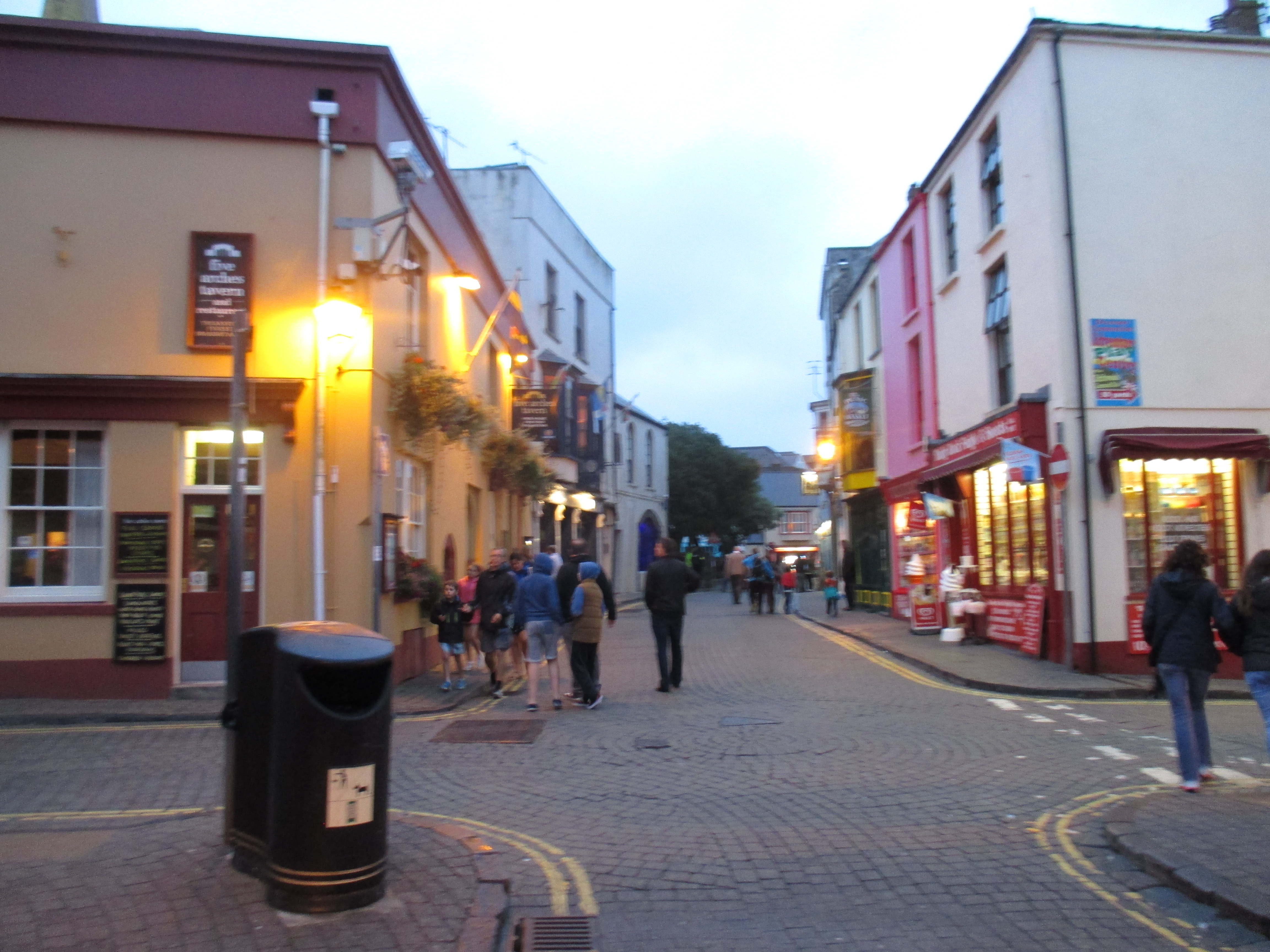 There are no cyclists around here, nor have there been for a few days. As the ladies in the café back in Newport noted, it’s a Friday, the day when holiday home stays usually end. Or perhaps it’s the route, exploring everywhere may be just too much for some. There’s little distinctive about this road or landscape. A small MOD base wakes me up, a desolate fish and chip kiosk nearby. After a day of small hills, the road starts to descend down. It’s getting dark, now 8pm, but the cycling’s easy, and there are some majestic views of the rocky outcrops around the area. Eventually I reach Tenby, a small Victorian seaside resort. There are terraces of hotels and countless competing fish and chip shops as well as bright and brassy stores selling sticks of rock. Drawing closer to the seafront, the town is surrounding in an old brick wall that circles a tightly-webbed series of streets inside. I cycle around and then through them, and manage to locate the place of my host, Declan.