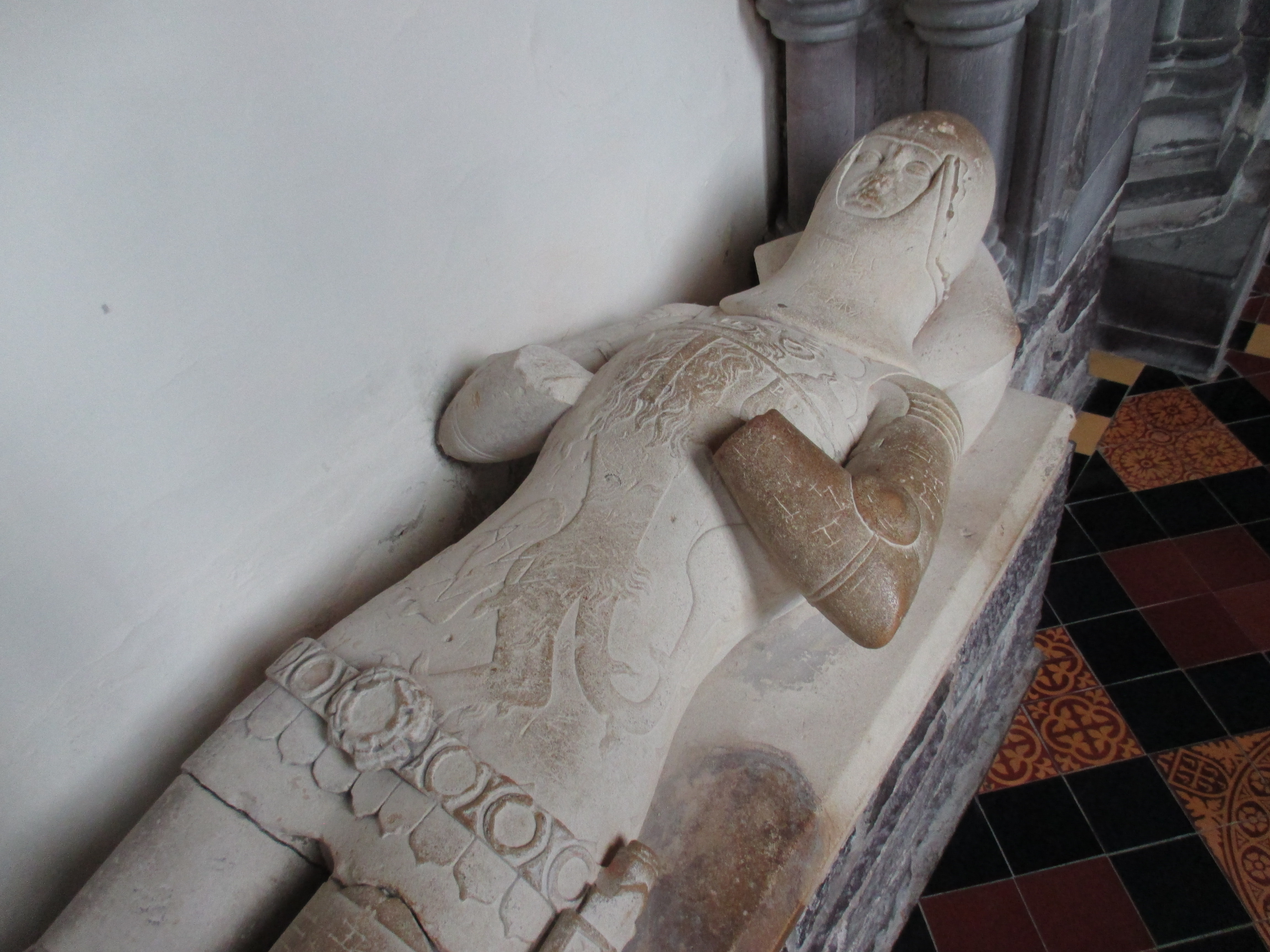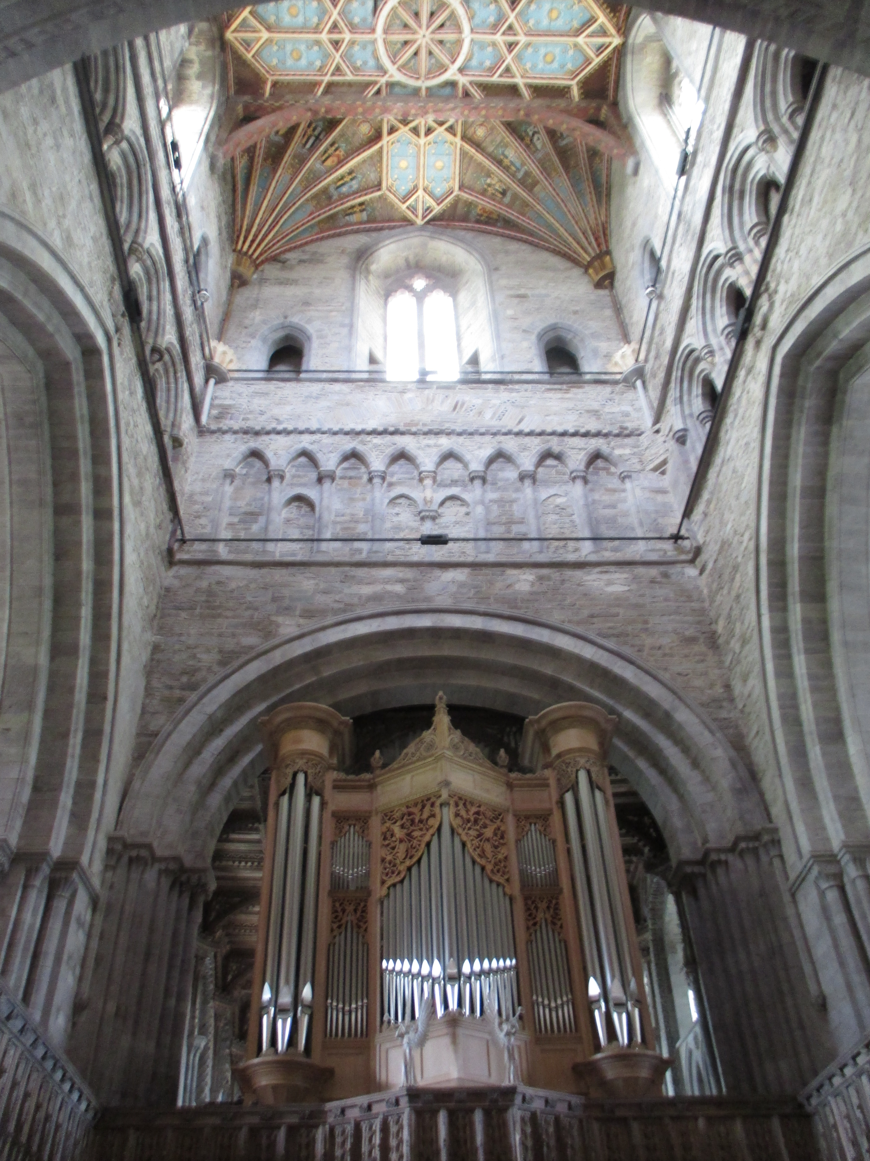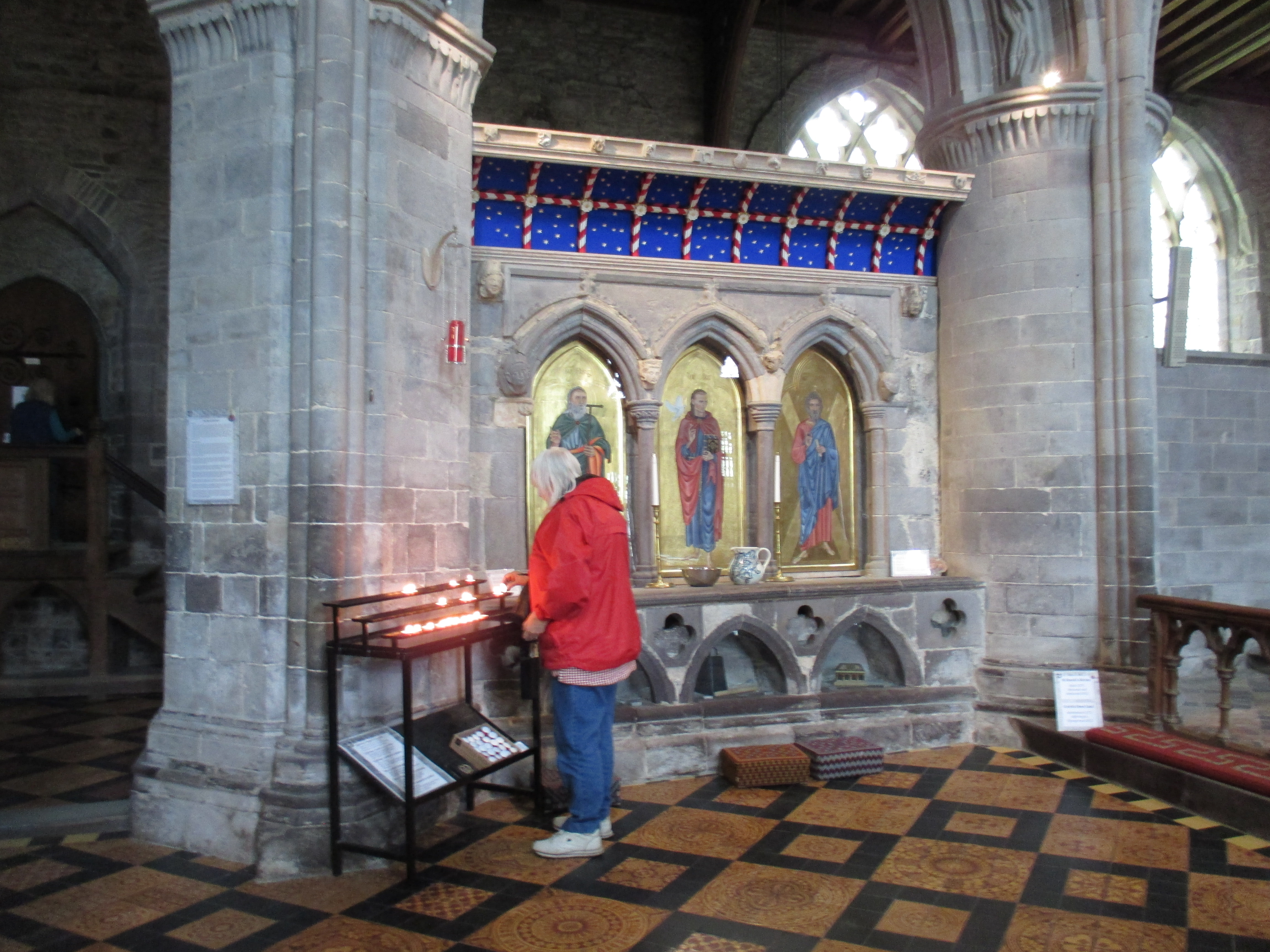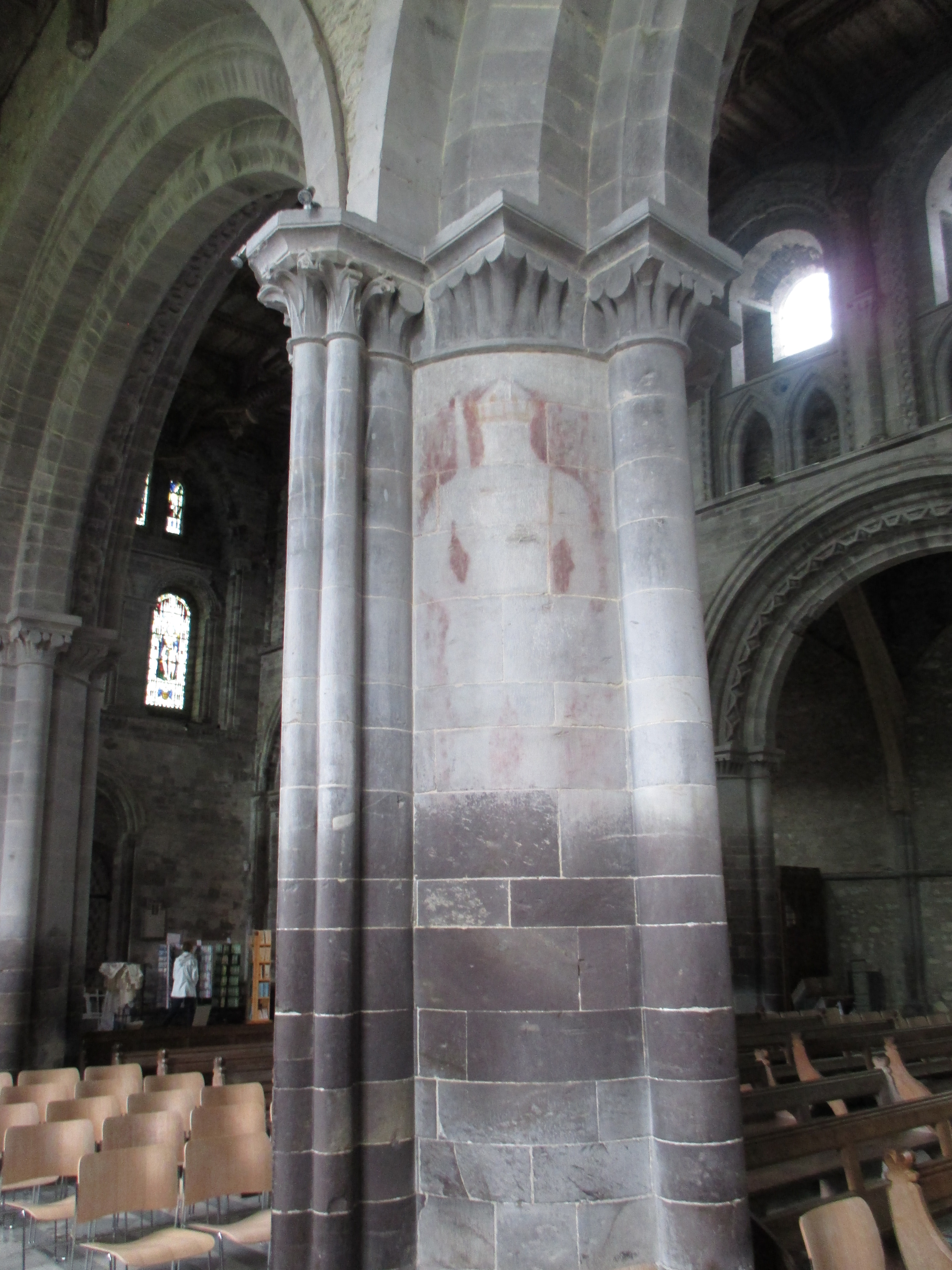 The cathedral itself is large though not particularly impressive. There’s a curious timber roof with artistic knots crafted in. Most of the stained glass is from the last century, the church being refurbished by the Victorians after falling into a degree of ruin following the Reformation. Some statues of deceased knights have graffiti scratched in, and hands and feet smashed off. I notice the outline of a man on one pillar and ask a volunteer about it. He tells me that Puritans whitewashed away the illustrations on these pillars in an attack on all form of idolatry. ‘It was a mistake’, he tells me, as the local people couldn’t understand Latin, nor could they understand English: they needed these illustrations.