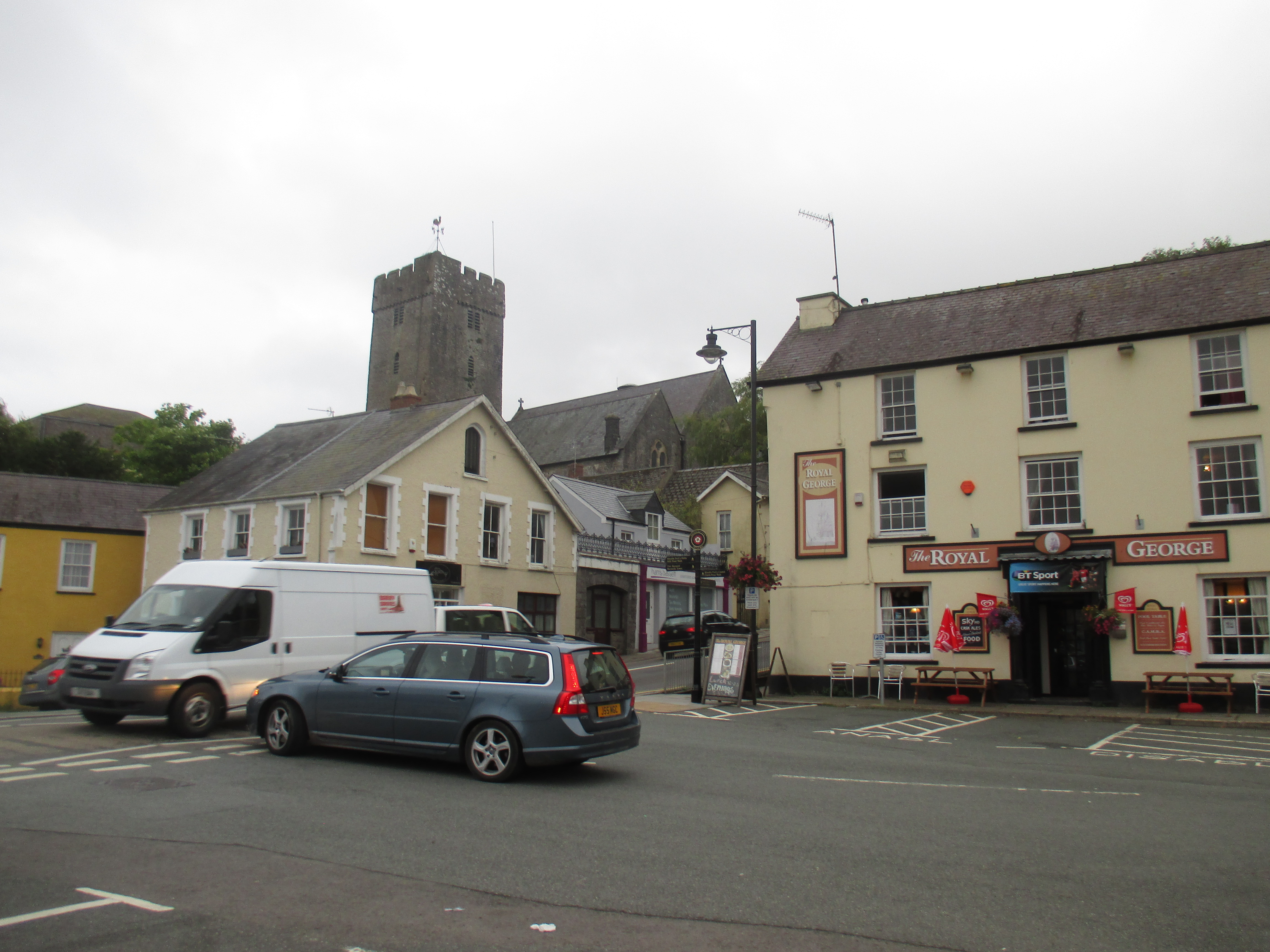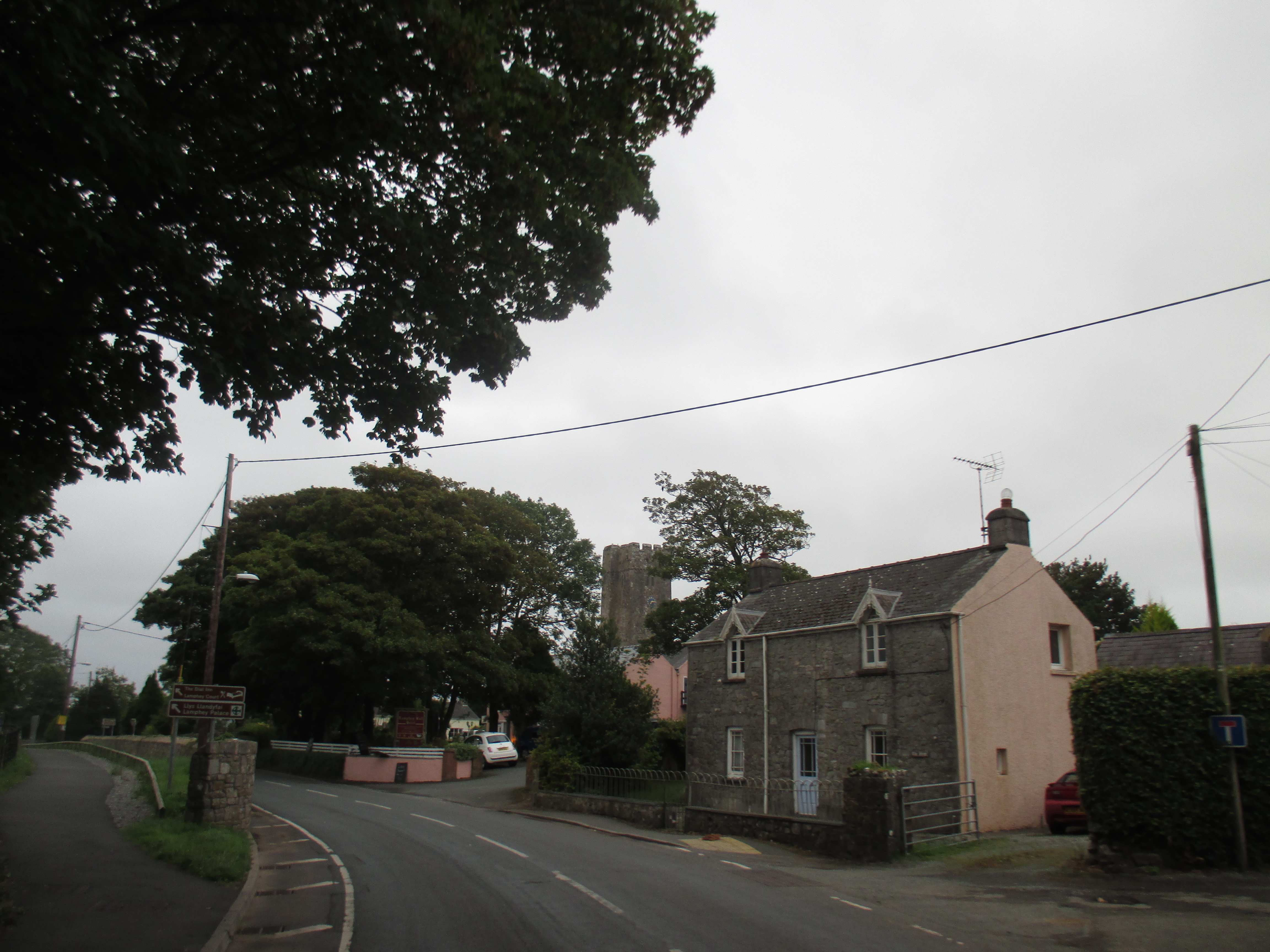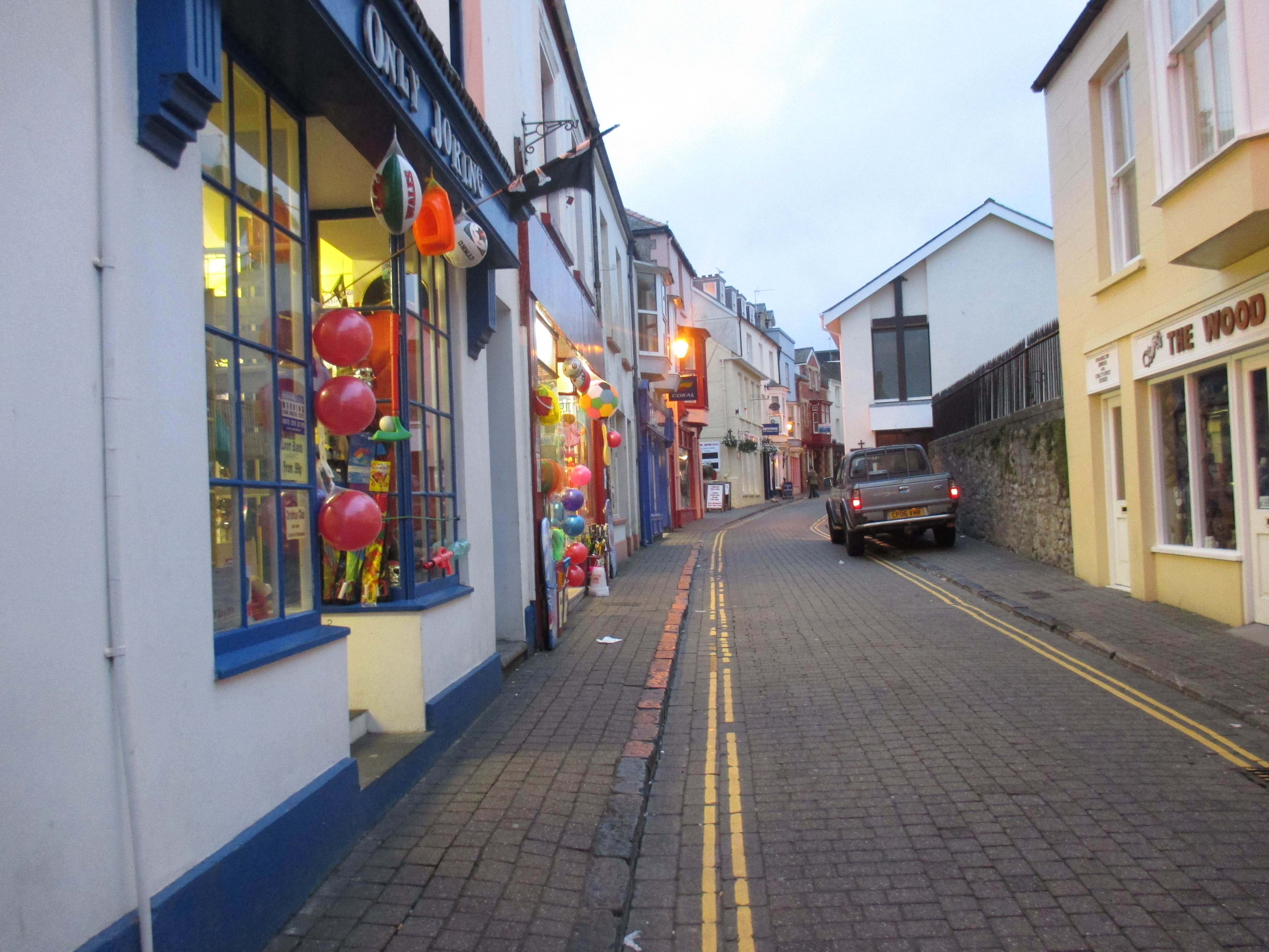 The road cuts along to Pembroke Dock, a small settlement which is just that. Then Pembroke follows a couple of miles later, a surprisingly small town for the name it lends the surrounding county. There’s a looming old castle and St. Mary’s Church in the distance, and cycle up into the town splayed across its hills and one will discover a series of shops and curious buildings, some of which possess an aged charm. It’s a little lively in the Royal George, and outside a group of girls in towering hills and glittery outfits clamber into a corny van where a man serves them champagne, bad europop blaring out. Content that this is enough right now to know of Pembroke, I head out.