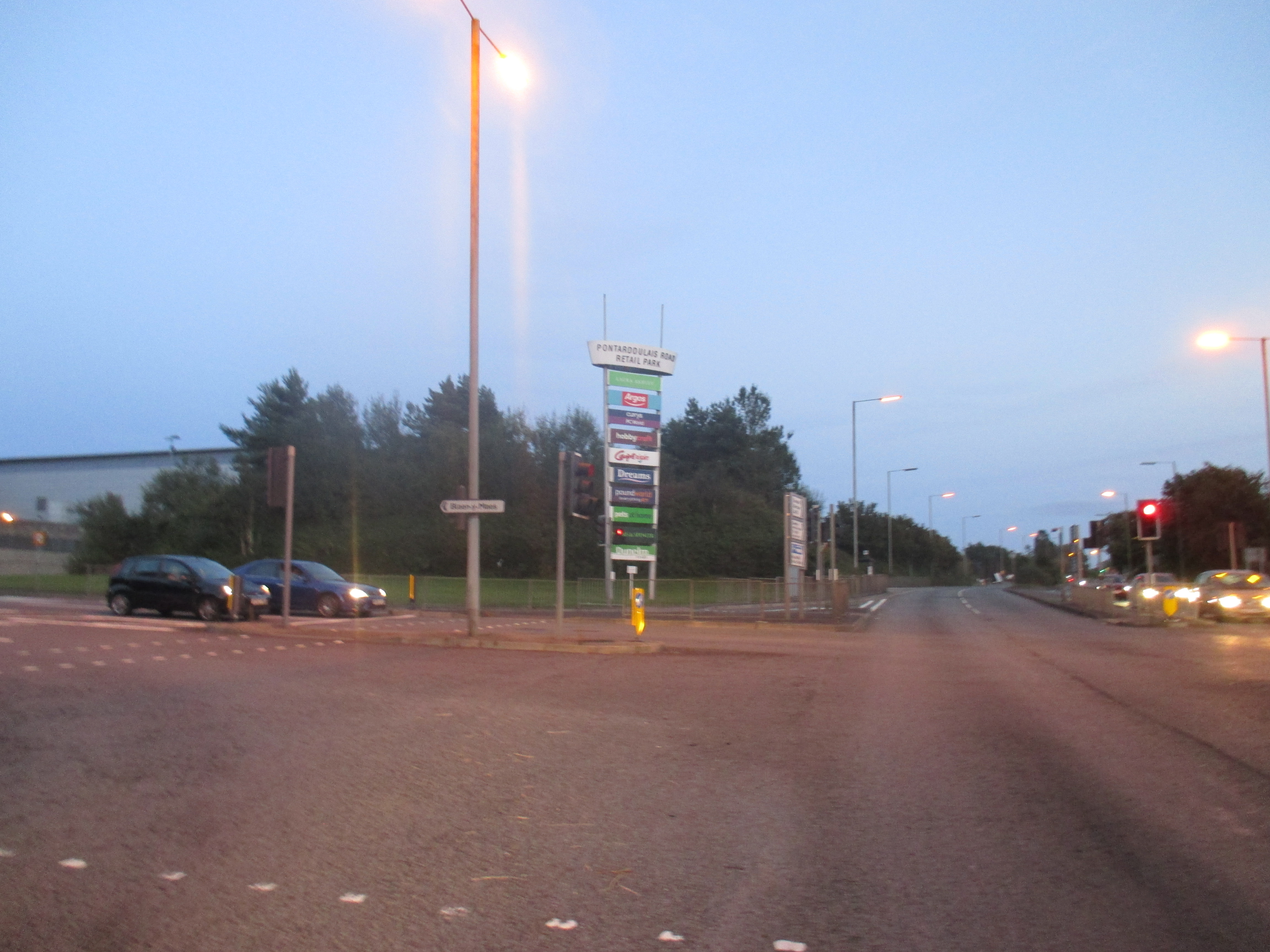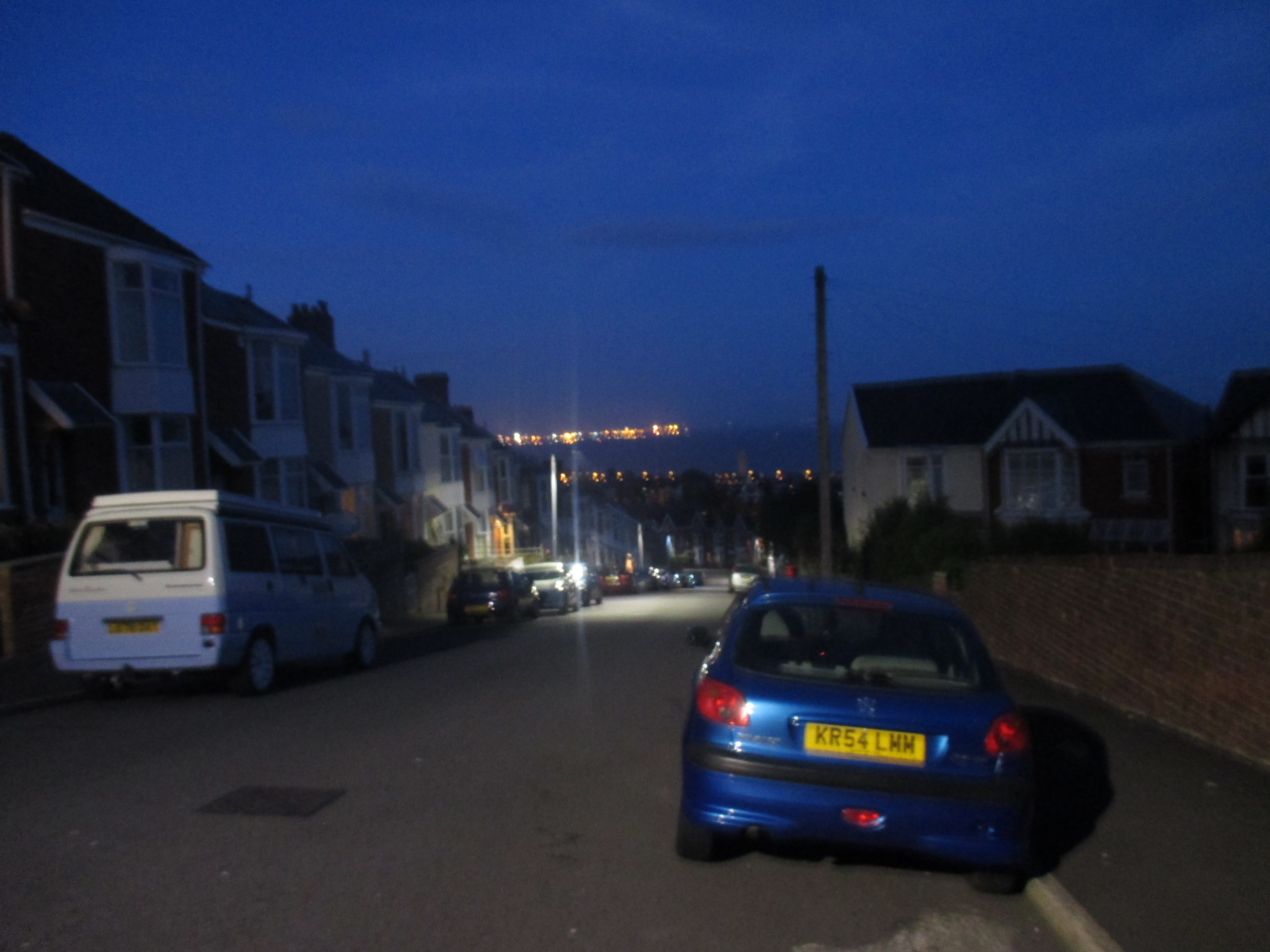 I need to reach Swansea for 8.30, and it’s around 8. I aim to take a shortcut into Swansea centre but the road signs are so confusing, and I end up on a massive diversion following the main car route, a thick and speedy main road through difficult and heavy traffic. It’s become so dark that I require all my lights, and the journey into Swansea is dangerous! I pass two large bland retail parks, then enter a largely-residential and underwhelming town, passing up a couple of steep hills through residential suburbia before tumbling down another, with the lights of what I think might be Bristol in the distance. Here in Uplands, the student area of Swansea, I reach my destination.