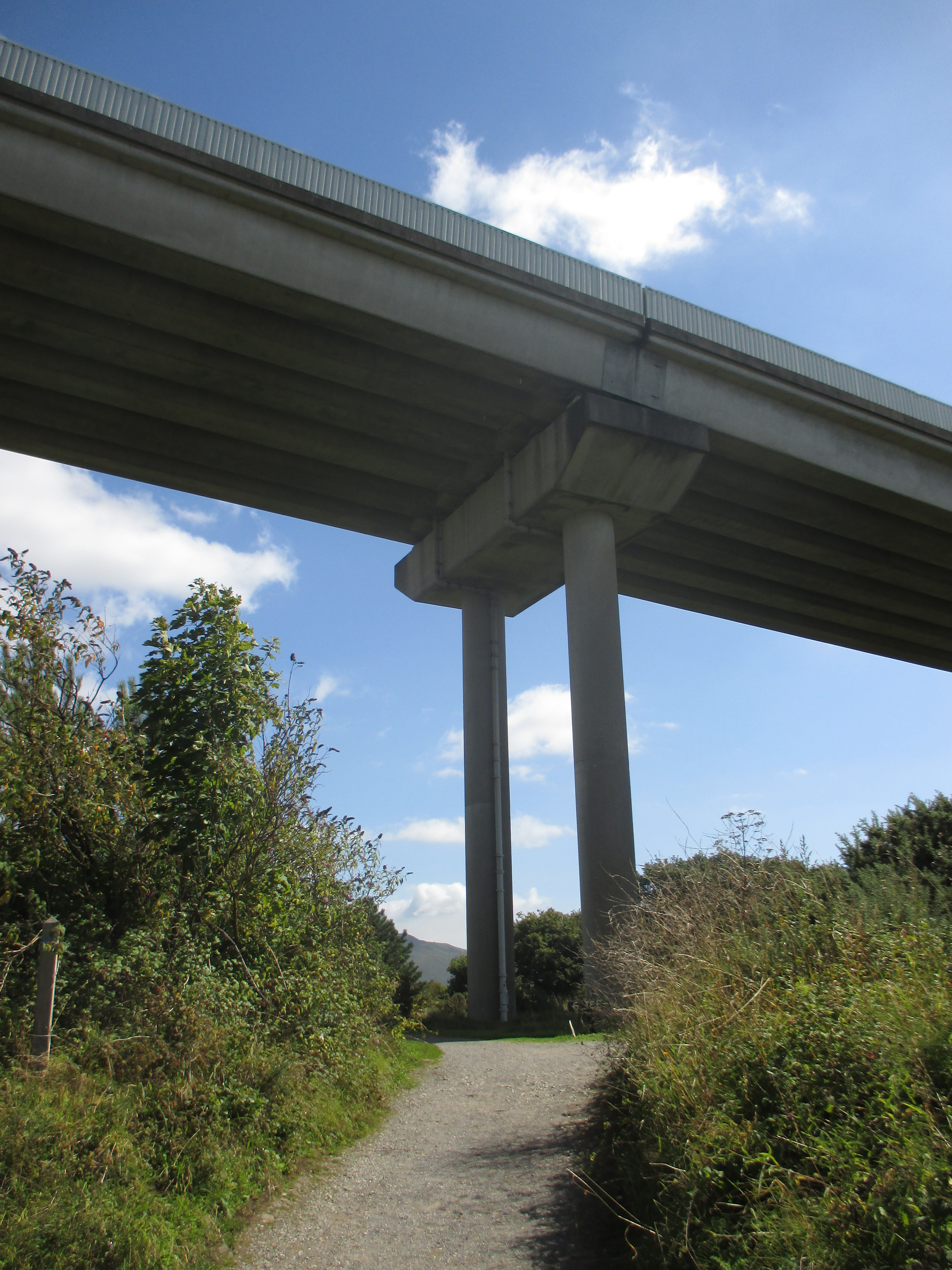 I cycle out along a very busy road, sticking to a cycle route until that quite typically disappears. I rejoin the road, passing Amazon’s huge warehouse and its own street, my phone’s internet access temporarily blocked by all the employee anti-procrastination measures they have here. A huge Royal Mail lorry leaves the place packed with the gadgets and gifts purchased during a million midnight pished online shopping sprees. I rejoin the track, heading towards a place called Briton Ferry, but mainly seeing only busy dusty dual carriageways. This doesn’t change much. I get under the M4 where I read a pedestrian tunnel’s depressed and bored graffiti – ‘smoke your life away’, ‘I’m sick of this shit’, ineloquent in expression but artistic in design, paeans to no-one about nobody. I peer up at the concrete stilts of a motorway flyover, and wonder what species of life after humans have become extinct will make of such structures, what they might reckon of their purpose. A runway for flight? An abstract religious symbol?