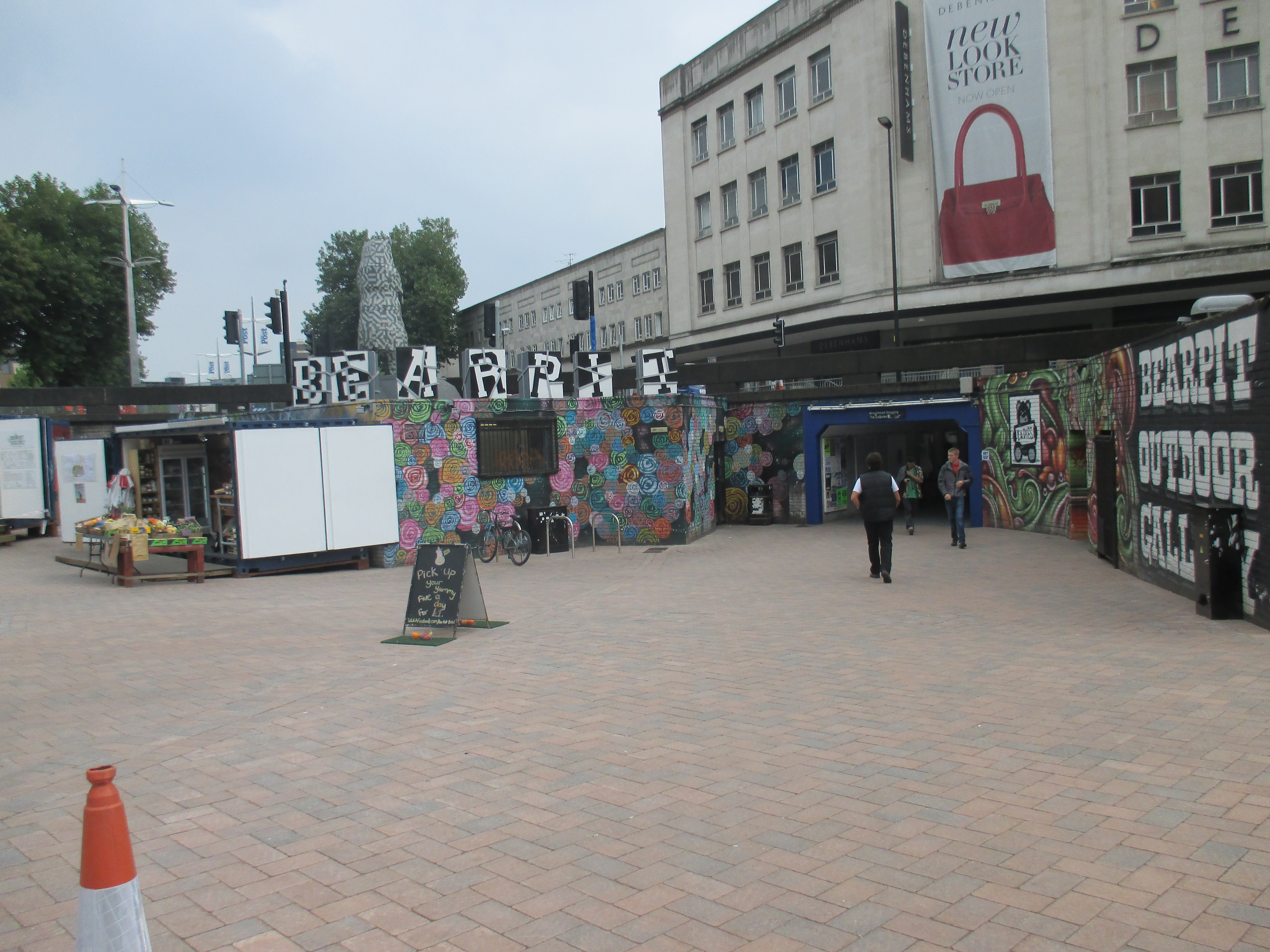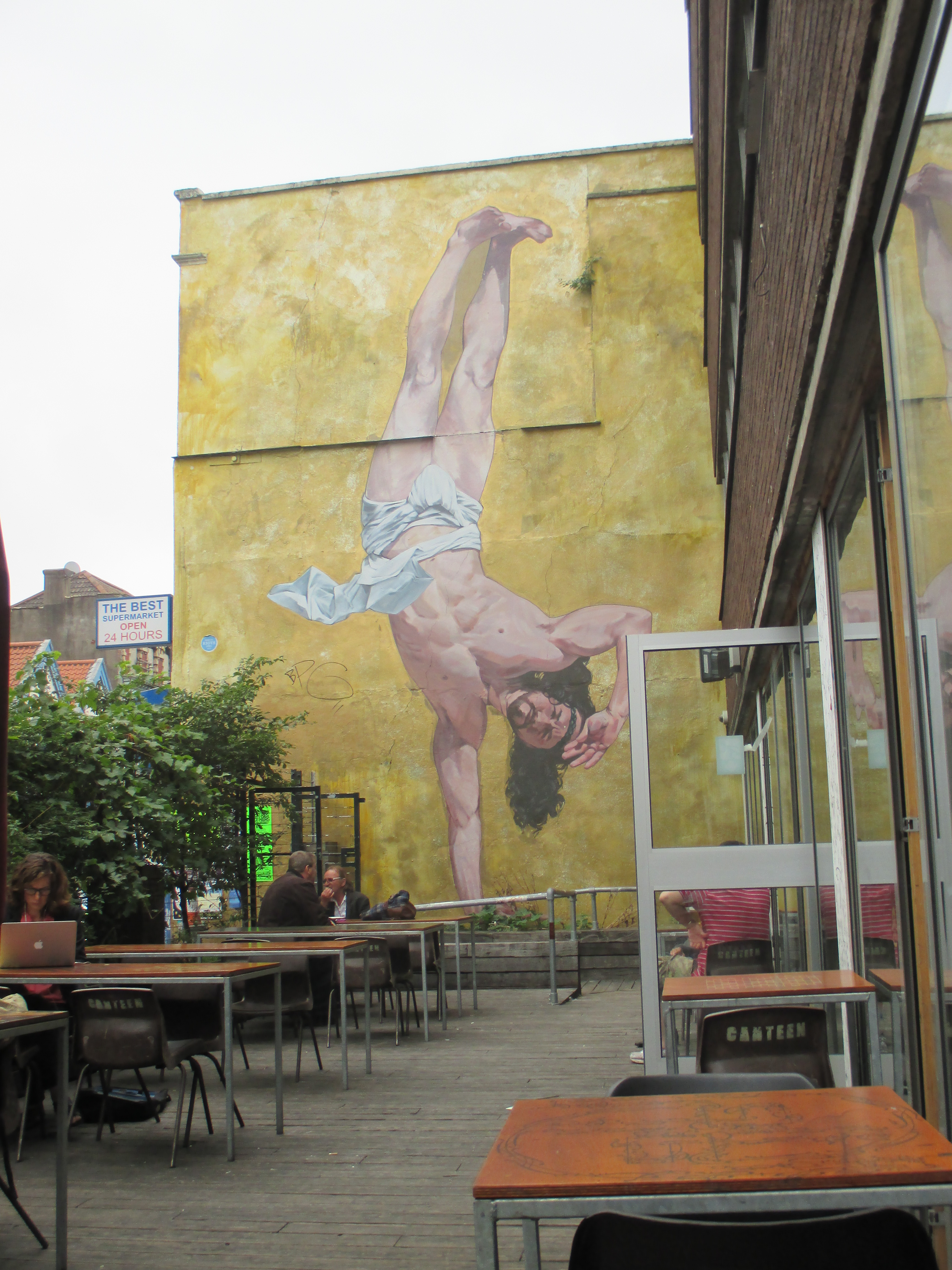Stokes Croft, like Bristol more broadly, feels like the exception that reinforces the rule, in the way that any cosy and self-marginalising counterculture reinforces the sterility of the mainstream. I sit in Hamilton House for a coffee, in what appears to be a large multi-storey office block now delightfully repurposed into a thriving communal institution. The staff are remarkably eloquent, though dress as if they’ve been forced to forage from the Sunday night store-bags of a Scope shopfront. The centre has many community activities in its space as well as a gallery, exhibition area, and live music in the evening. Some may seem a little risible, or just a lot of fun, depending on your temperament, and it’s a lovely place to spend a few hours making a single coffee last out and simply thinking, or writing, and bothering passers-by to join in the awkward jazz of unfamiliar group conversations. There are all kinds of people around me, from people with serious mental health problems meeting their support workers to plum-voiced students excited by poverty exotica. I’m besides architecture professionals working together to design projects over lunch, to local fellas sipping a pint of flavour-free lager at 11am in the morning and ranting sheer misery about the mothers of their estranged children.