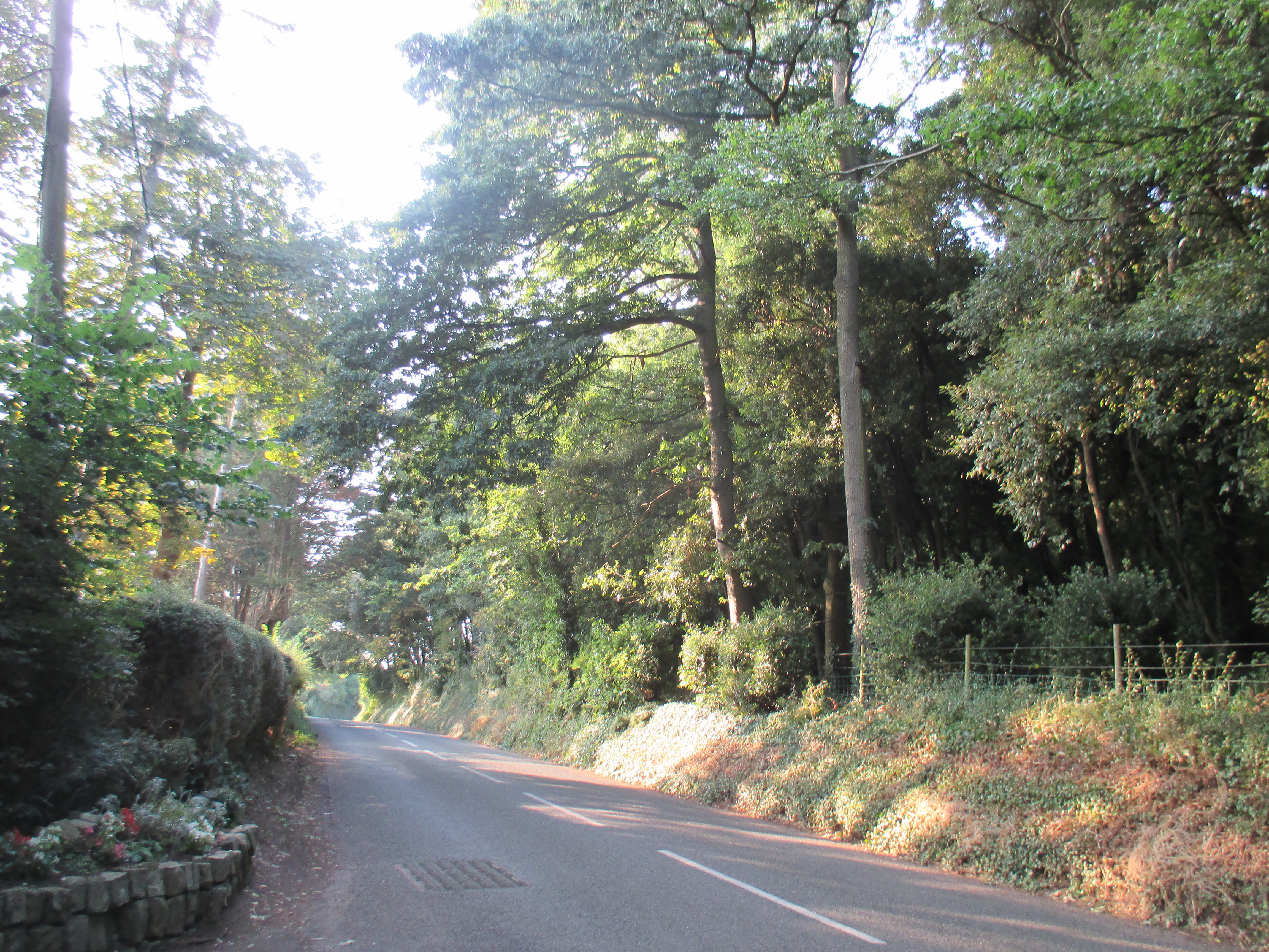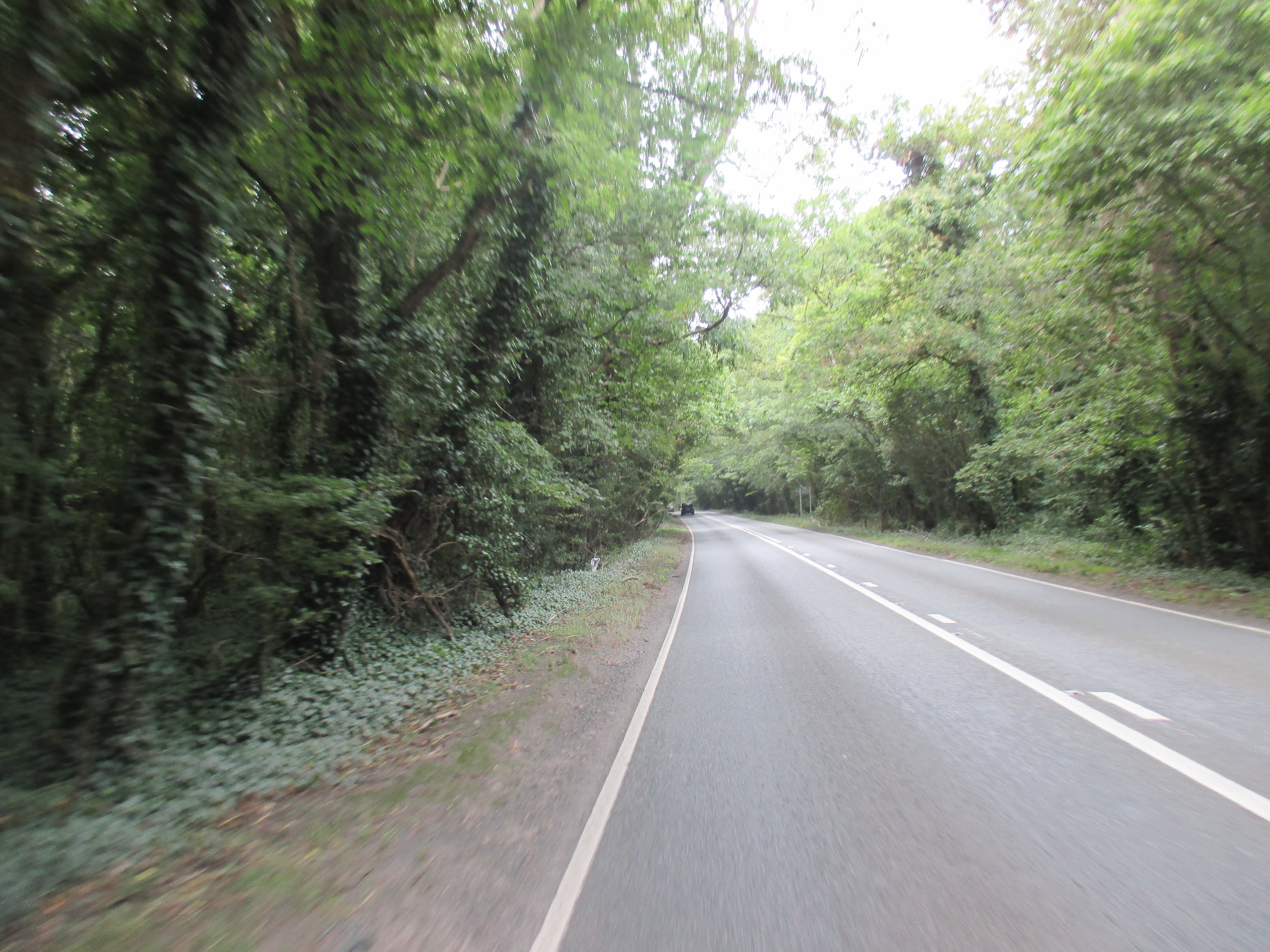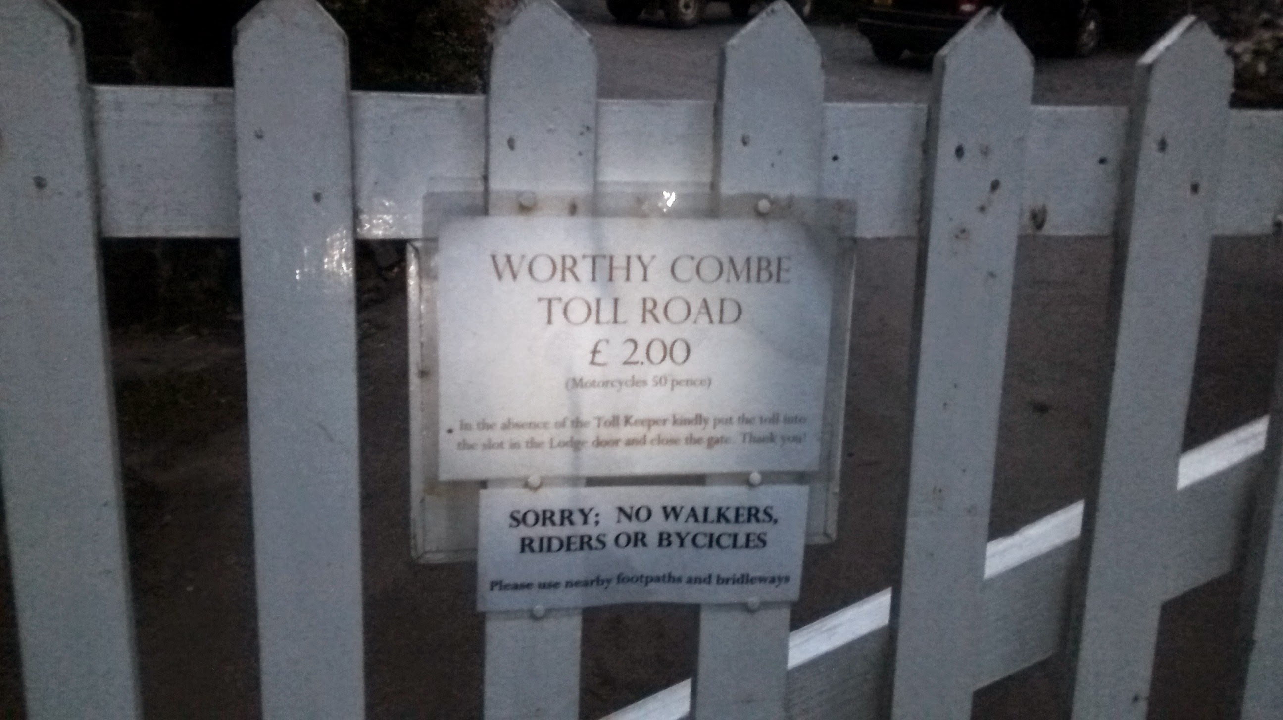 I follow a narrow track up to West Porlock which forks by Porlock Weir. After this it’s a very narrow and dark trail that steeps up, occasionally plunges down, then reaches ‘Worthy toll’, an old gate. Bicycles aren’t allowed. The toll is £2 for cars and 50 pence for motorbikes. It’s too dark to turn around now, so I decide to become a motorbike and drop my change into the box, and head up the track, strangely absent of fear. The road winds through an overgrown forest which obscures most of the light, and the track is both broken and very steep. It’s very tough cycling. I manage to make it up the first half of the bending hill through the woods, then give up and push for a while.