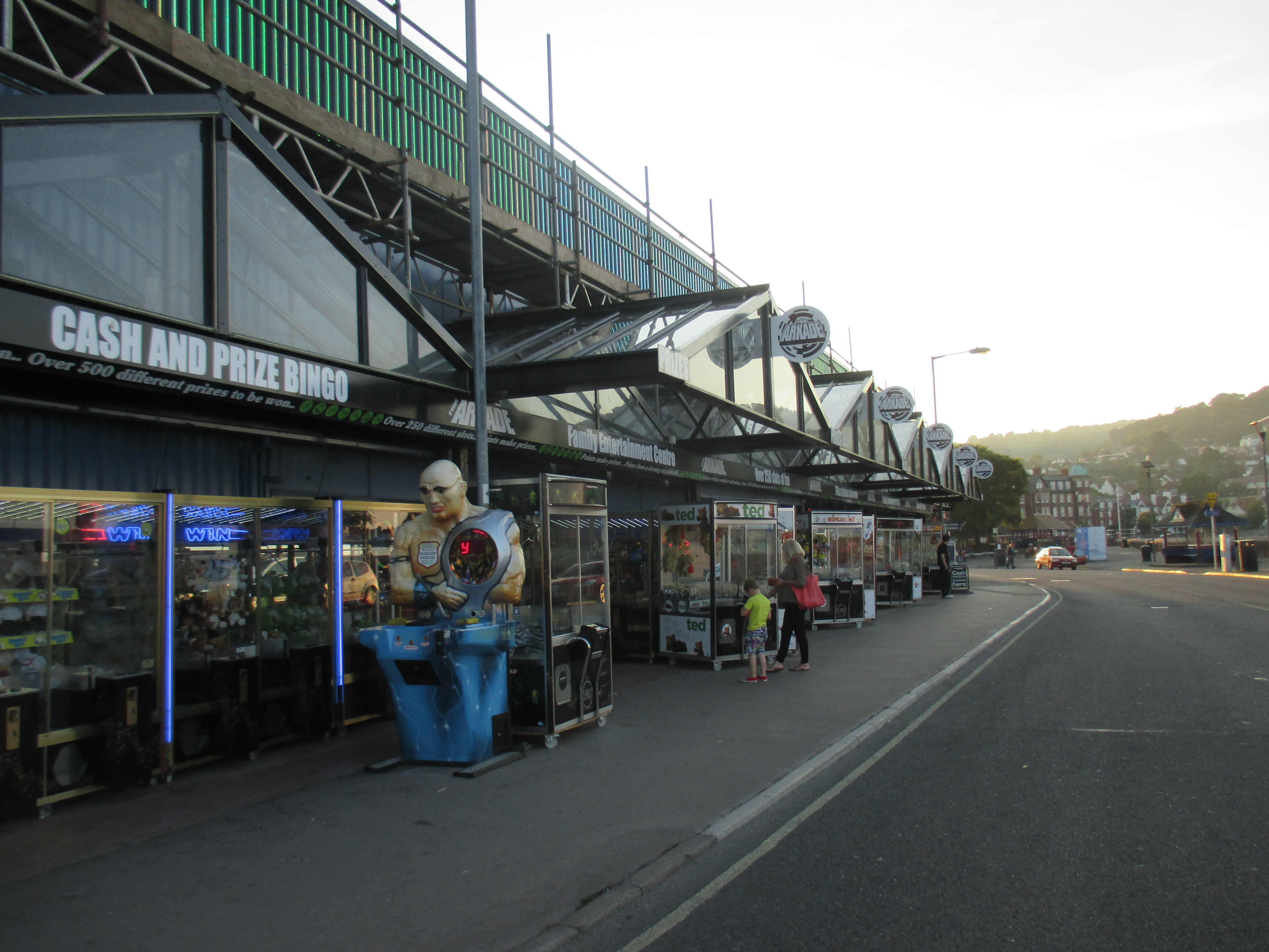 What delights today? I peer into the empty rides of the depopulated theme park, then wander down towards the seafront. The Queens Hall looks regal and majestic, but is boarded up and shows no sign of interest. In those high windows, reflecting the sea, I imagine its eyes dreaming of former glory days, couples kissing and laughing as they spill out of its auditorium and onto the gaily-lit promenade. Next door, amusement arcades jingle and jangle to no-one. I get some much-needed salty chips and a honey and ginger ice cream. A queue of kids shout and wail to secure the attention of their parents, tantrums and tyrannical demands rudely, begrudgingly met. I look out over the golden sands, to the power station at Newport in the distance, and the old small harbour at Minehead nearby.