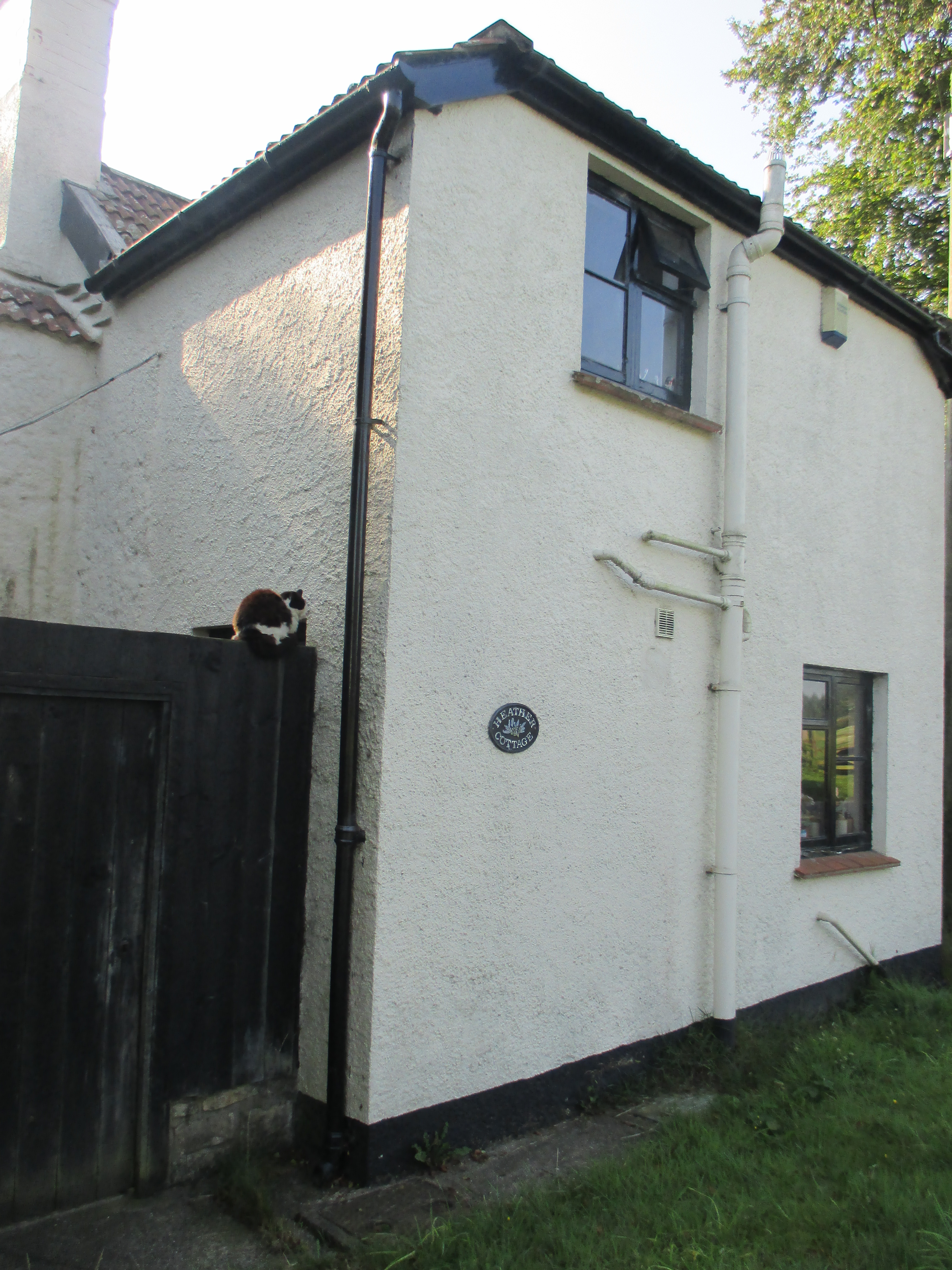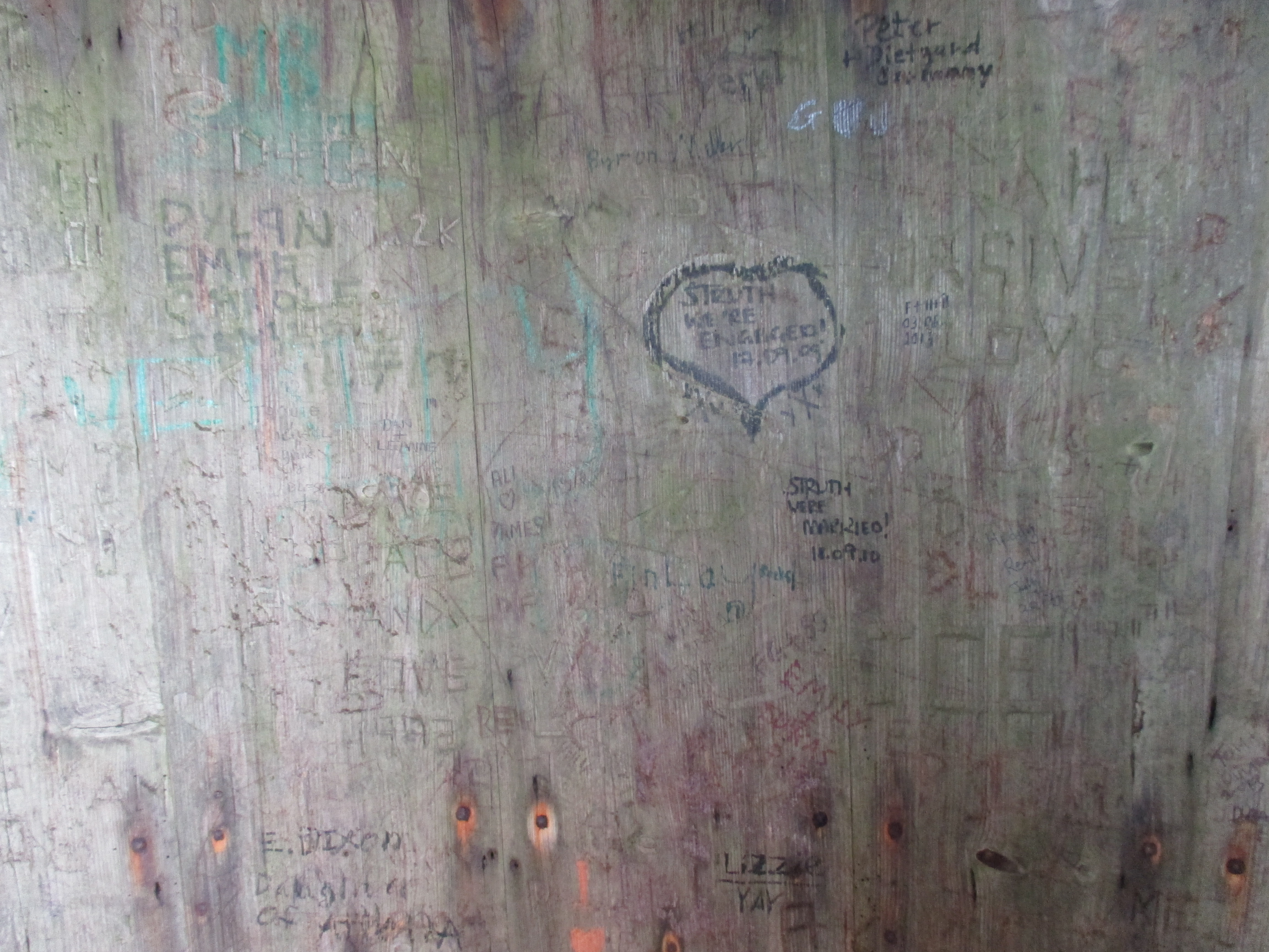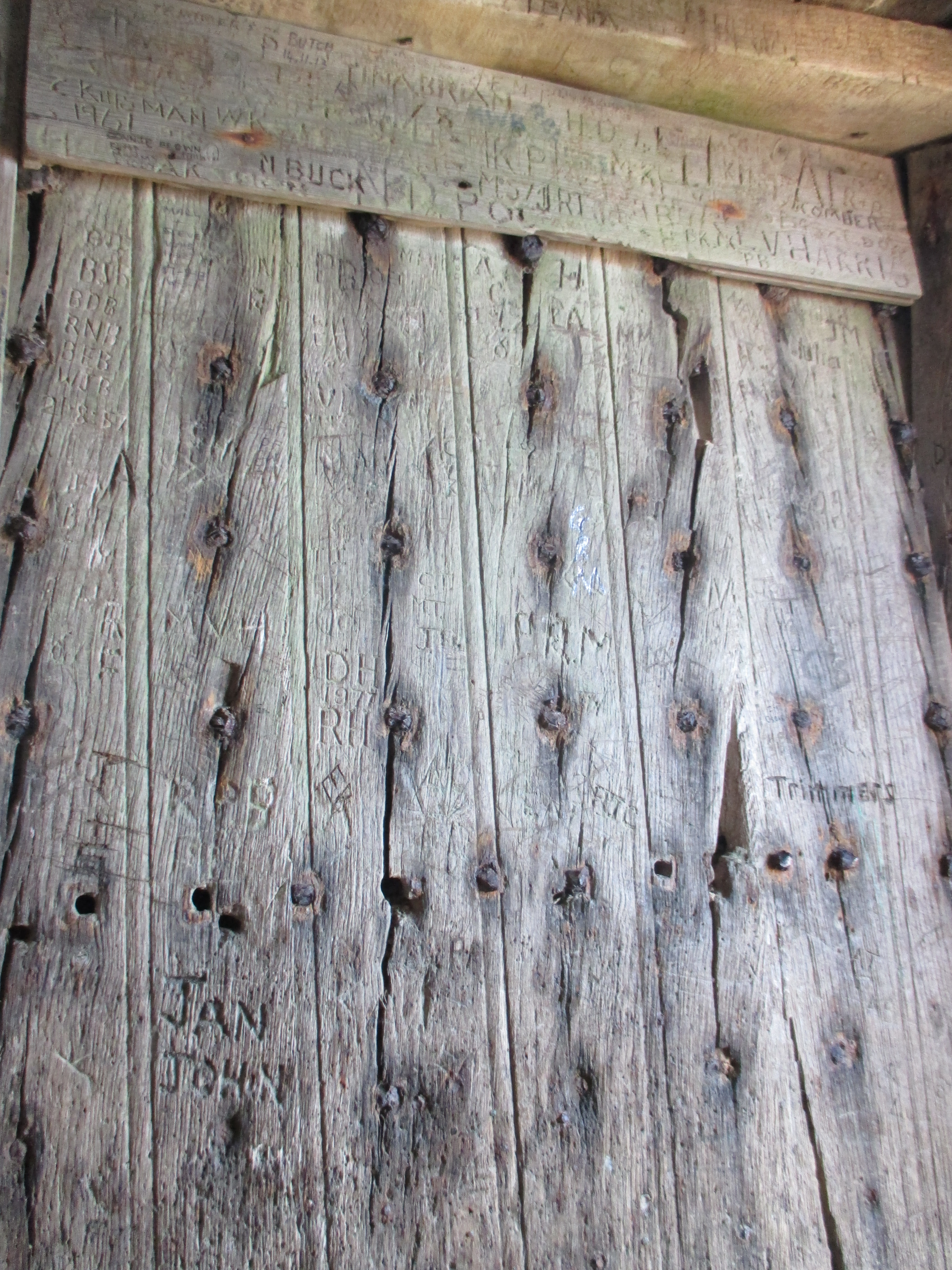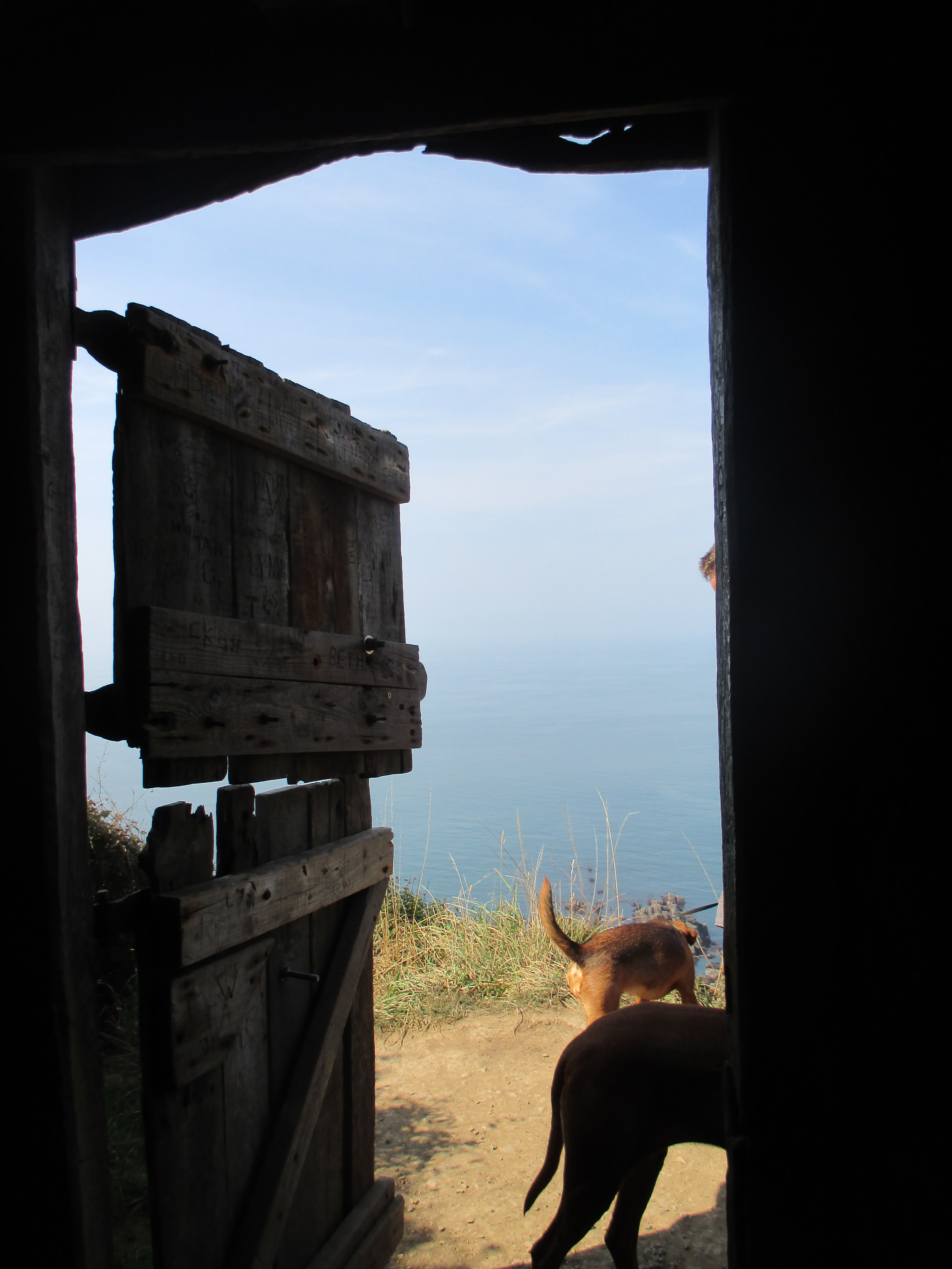 Hawker’s verses brim with an exuberant love of nature and obeisance to its mysteries. I climb out of the churchyard down to the hut where Hawker got off his nut and scribbled his hallucinations. Past tame cattle and sheep, clawed into the cliff-edge, the timber frame still stands with a full century of graffiti scratched or etched into it. What are they? Just names, lasting a little longer than the froth of the effervescent ocean, Atlantic in their vain attempts to defy time. A couple with two playful dogs are down there surveying the scene, and I take their photo, a disorderly moment as they shout to their owners to stay still. And after that I am off, past the Black Bull Inn and a village hall appealing for foodbank donations, and back into the bosom of the rural Cornish scenery.